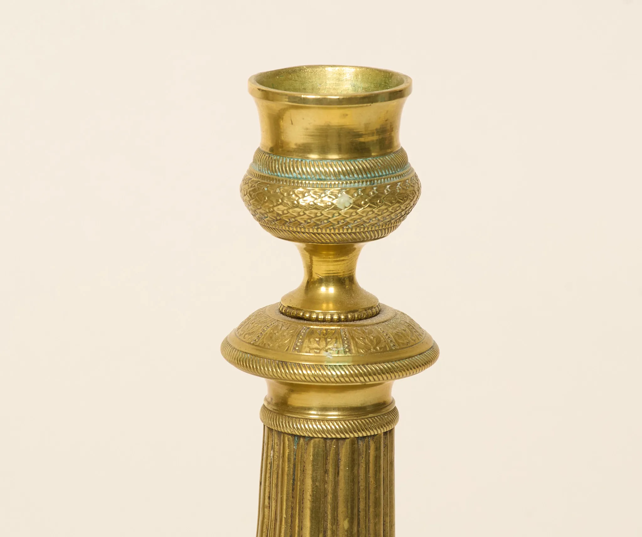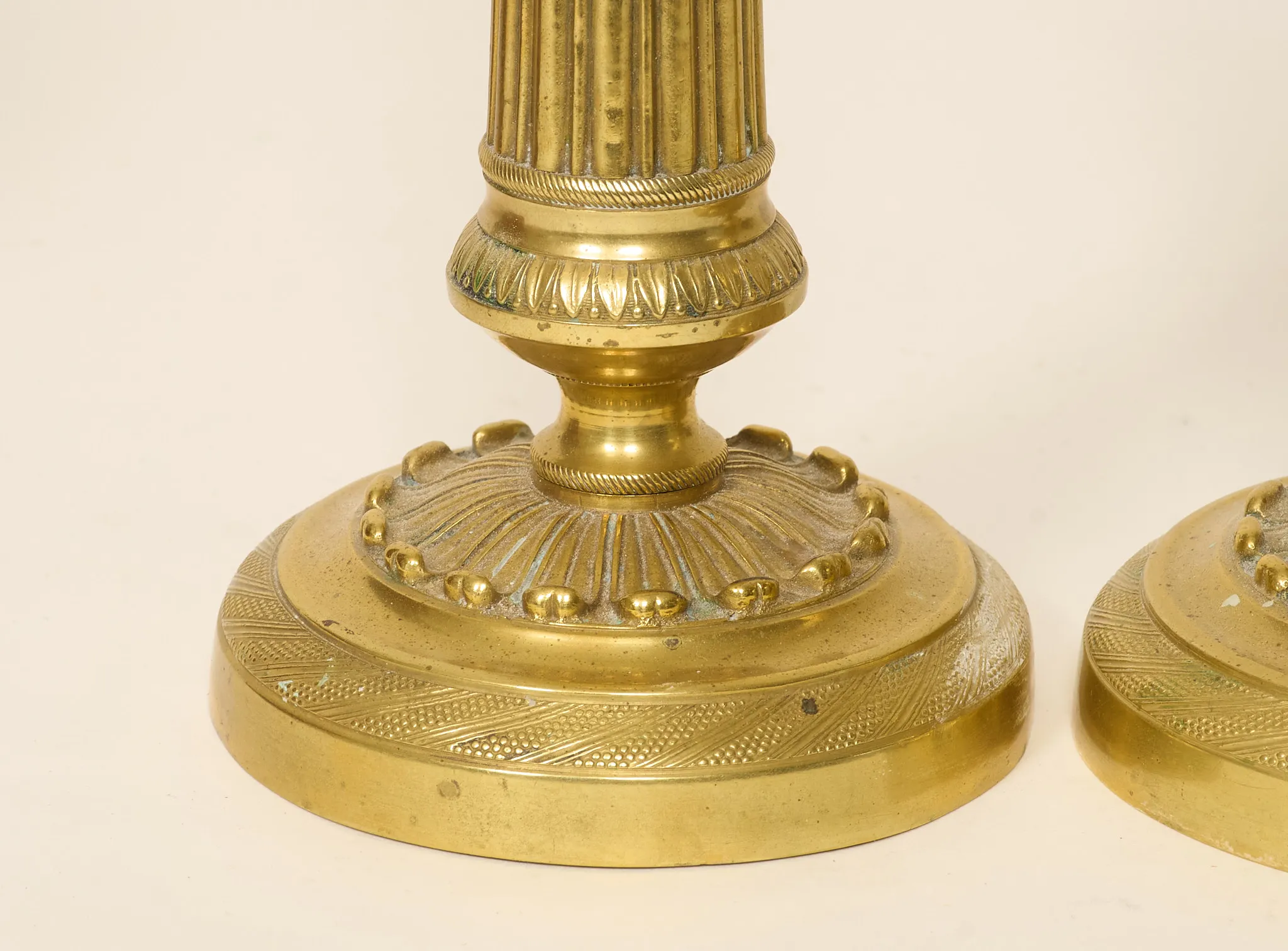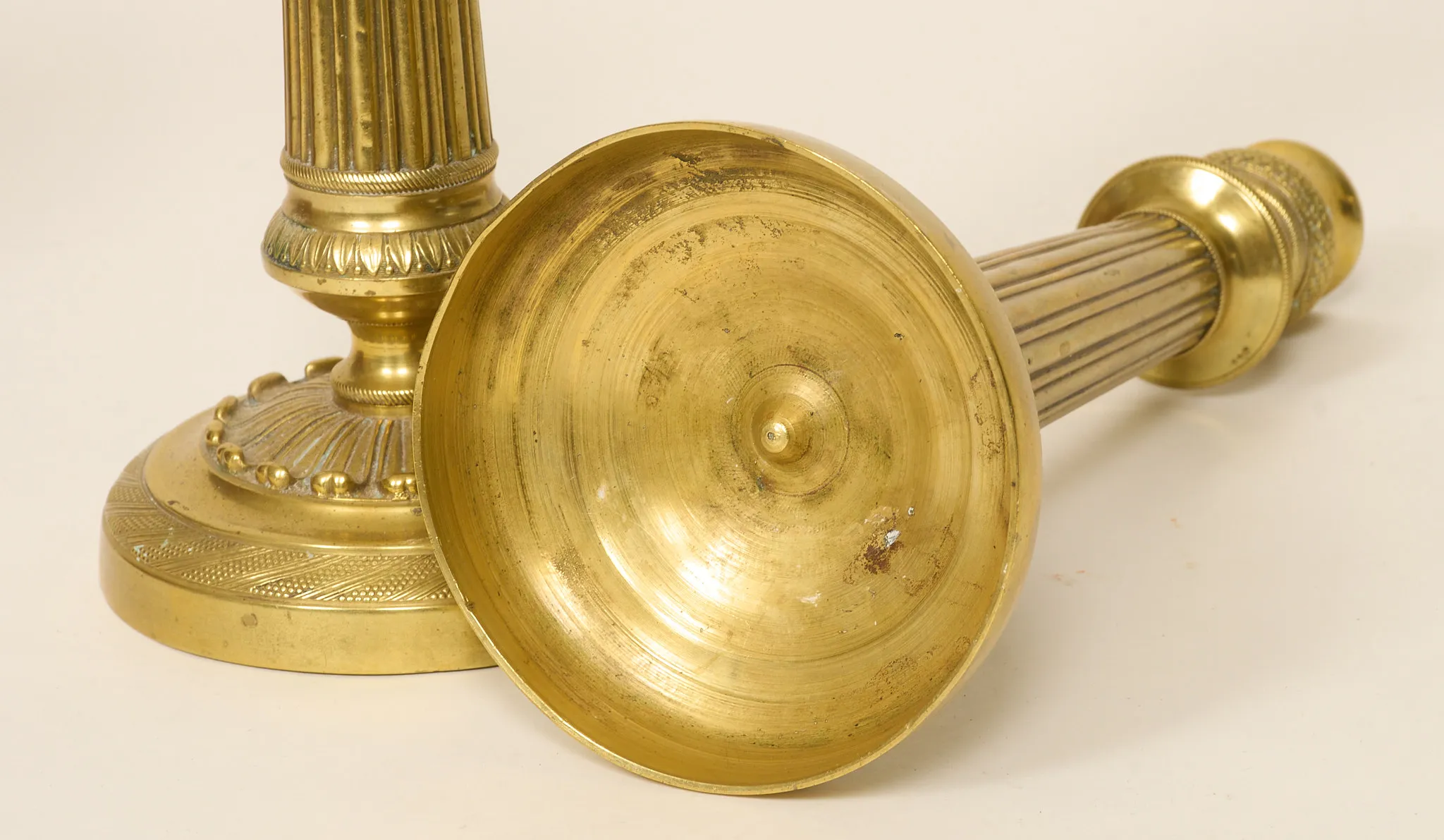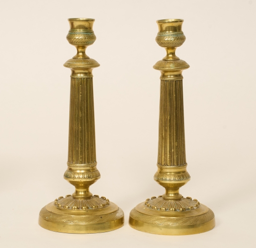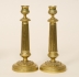 Ett par, mässing,ornerad sockel med bladverk, kannelerat skaft, lagningar, mindre bucklor, saknar ljusmanschetter, höjd 24 cm.