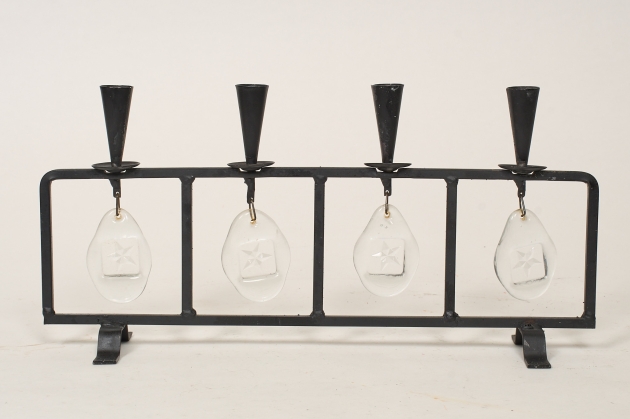 Smide, med prismor, hållare för 4 levande ljus, längd 44 cm, höjd 22 cm, bruksslitage.