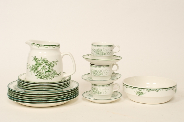 6 mattallrikar, 6 assietter, tillbringare, skål, samt 3 kaffekoppar med fat. Smärre bruksslitage.