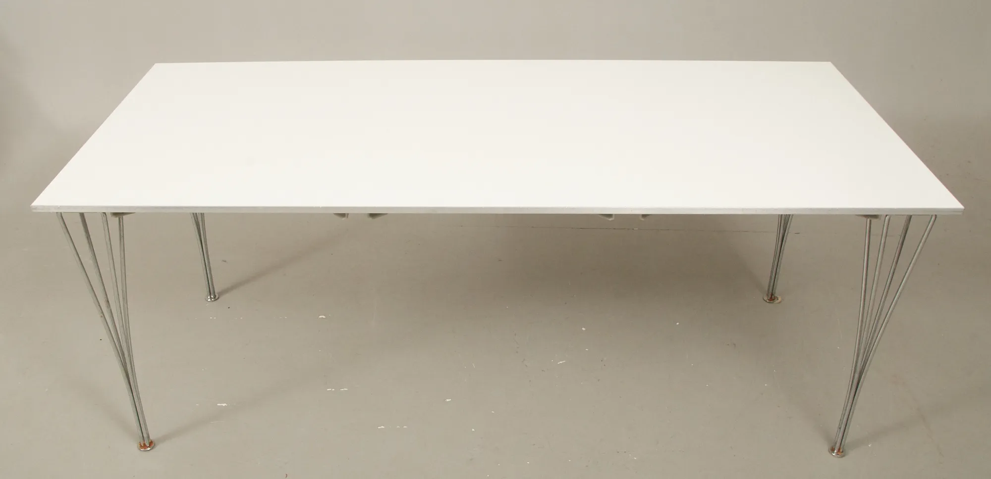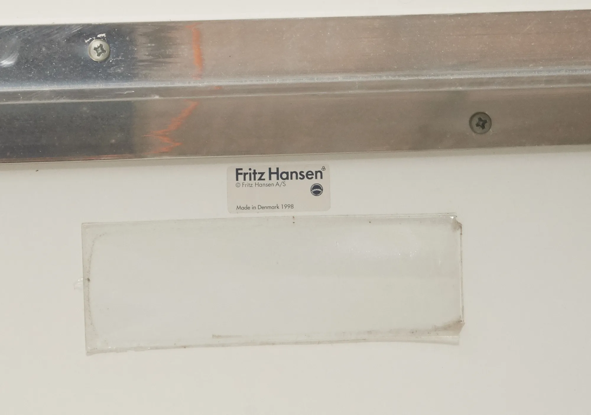 För Fritz Hansen, skiva i vit laminat, kant i aluminium, 178 x 80 cm, höjd 71 cm, bruksslitage, märken.