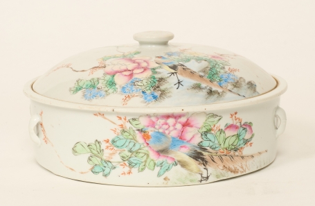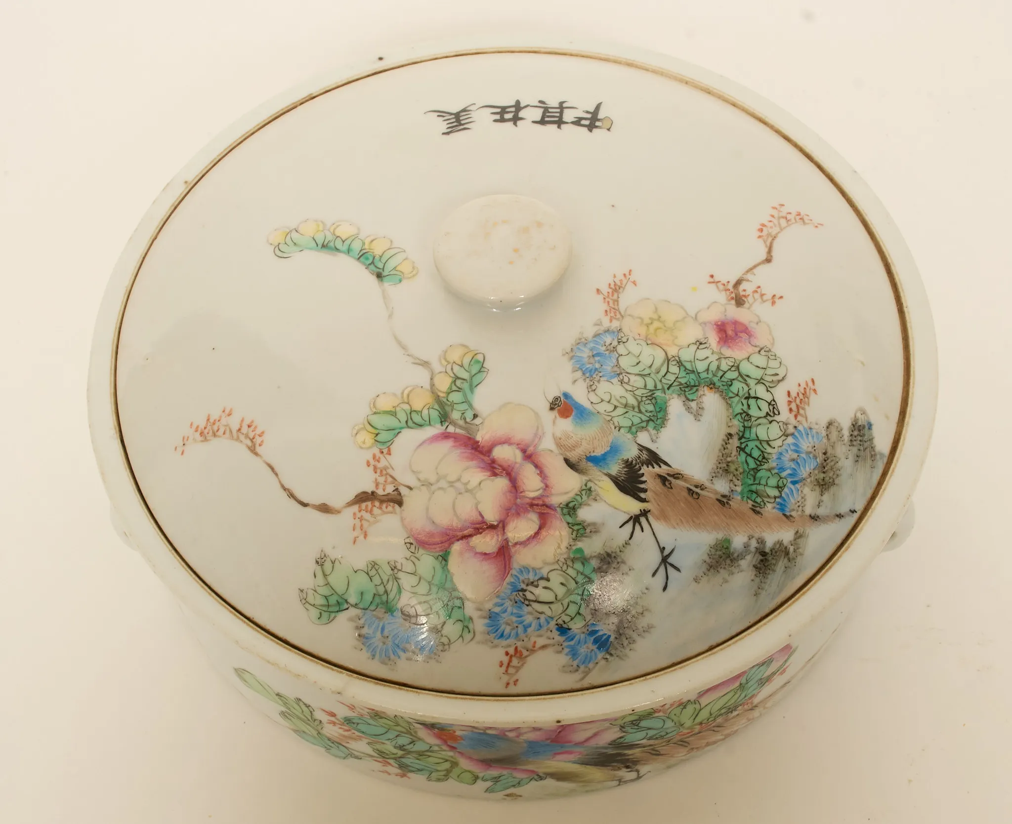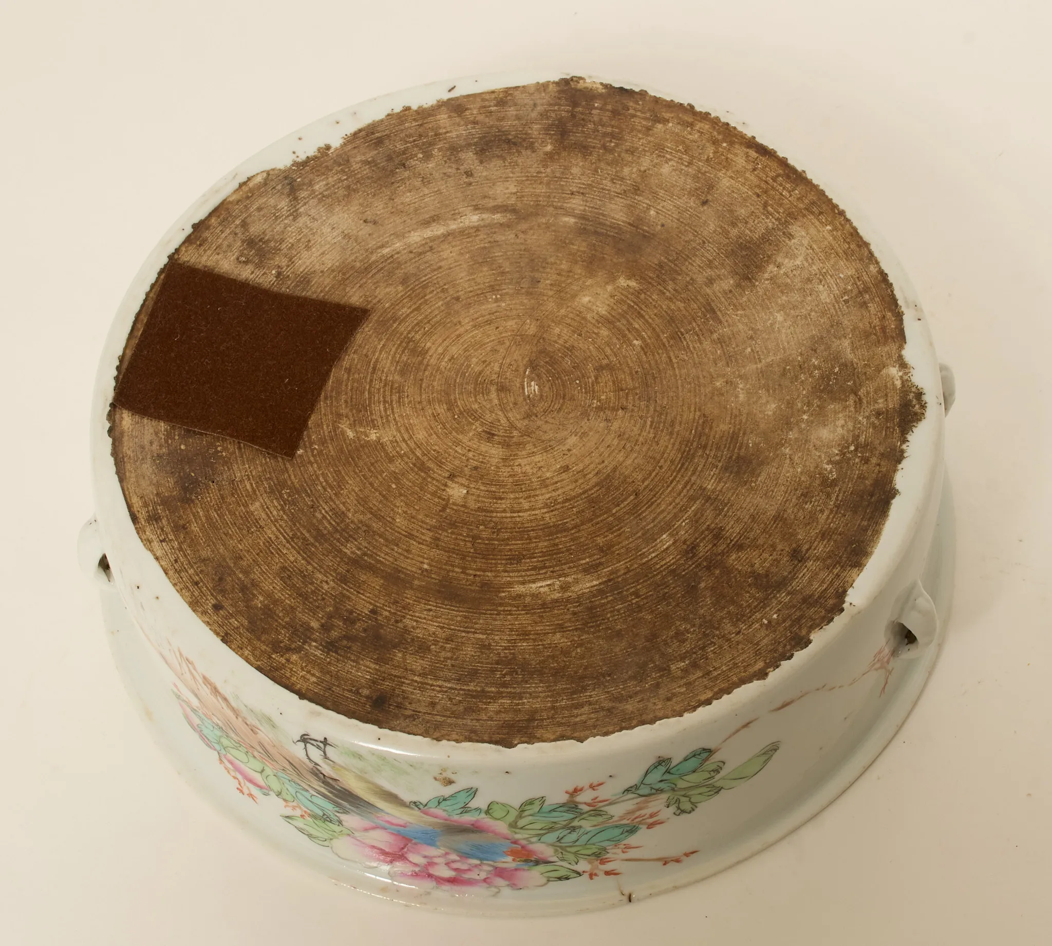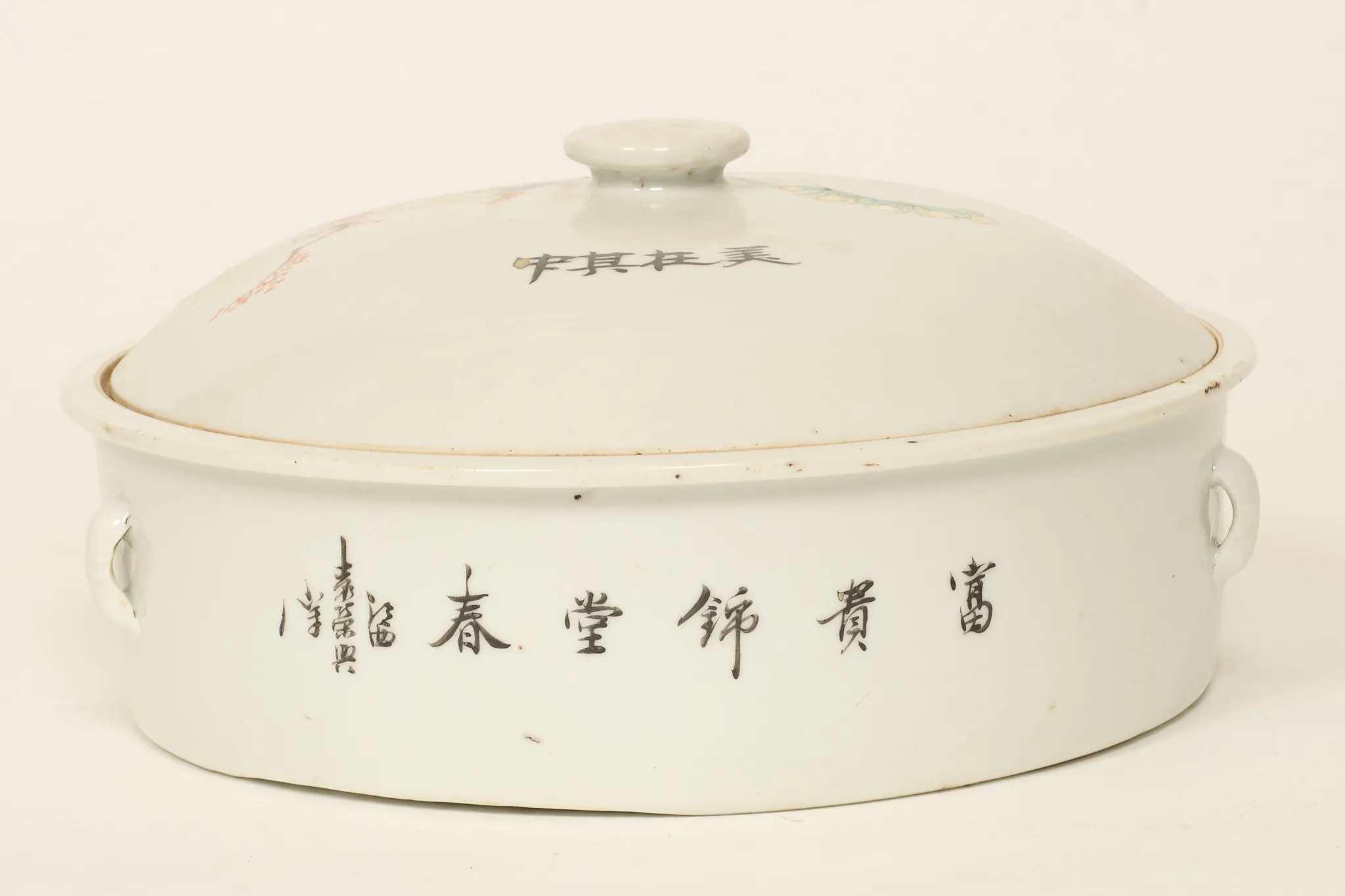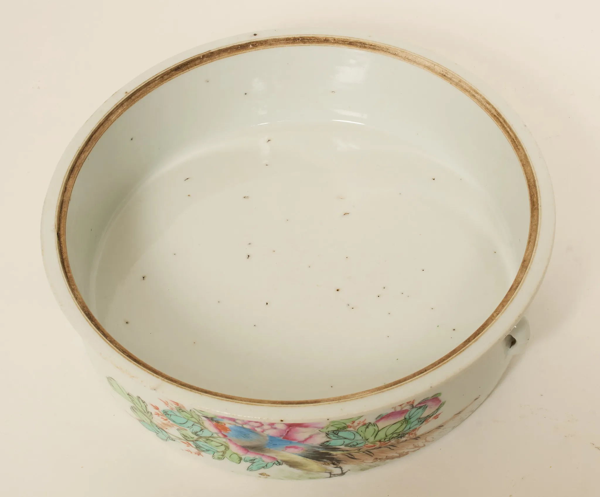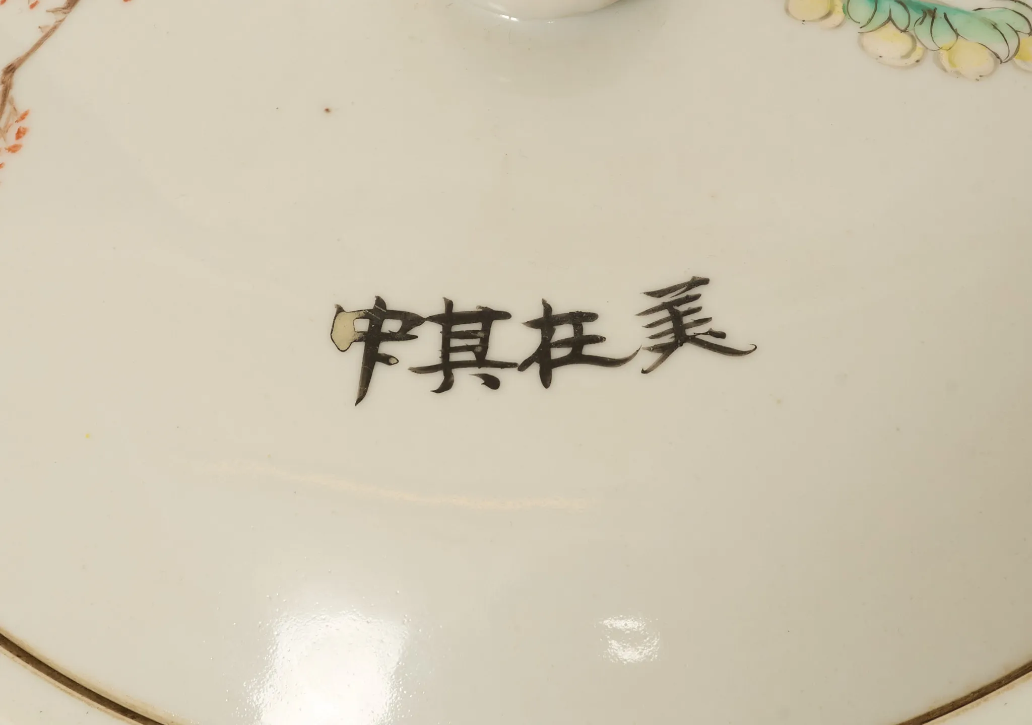 18/1900-tal, dekor i emaljfärger i famille rose, samt kalligrafi, diam. 23 cm, mindre kantspricka