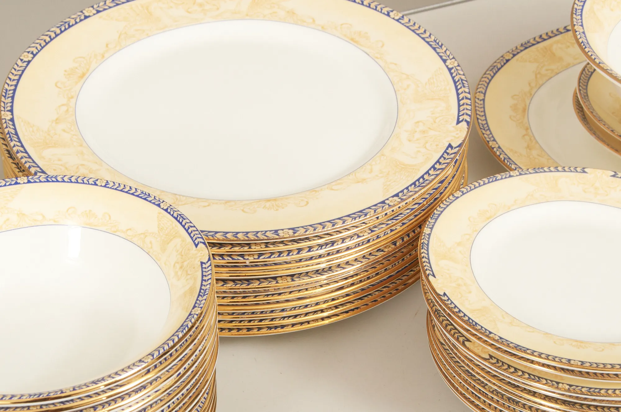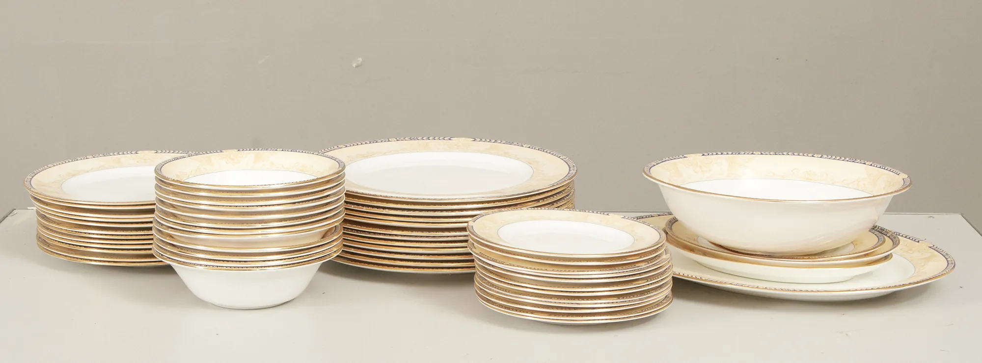 12 mattallrikar, diam 26,5 cm, 12 tallrikar, diam 21 cm, 12 djupa tallrikar, diam 16,5 cm, 12 assietter, diam 17 cm, uppläggningsfat m.m. Smärre bruksslitage.