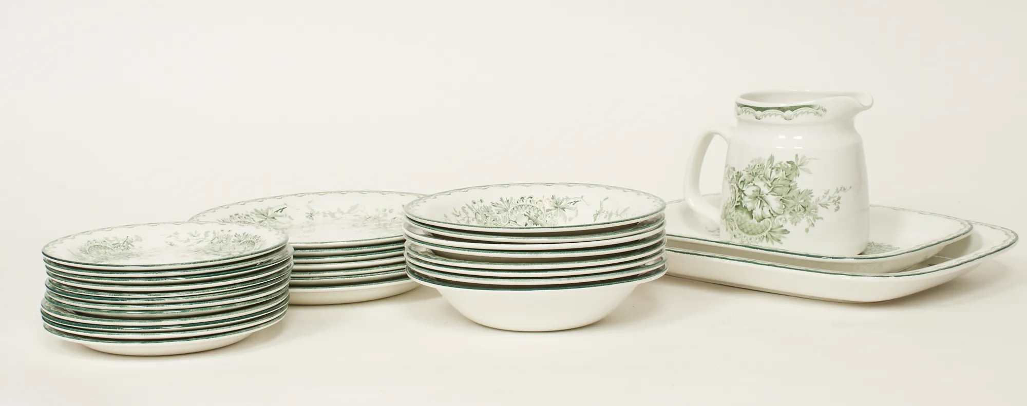 8 mattallrikar, 8 djupa tallrikar, 12 förrättstallrikar, 2 uppläggningsfat, samt tillbringare. Smärre bruksslitage, men enstaka nagg kan förekomma.