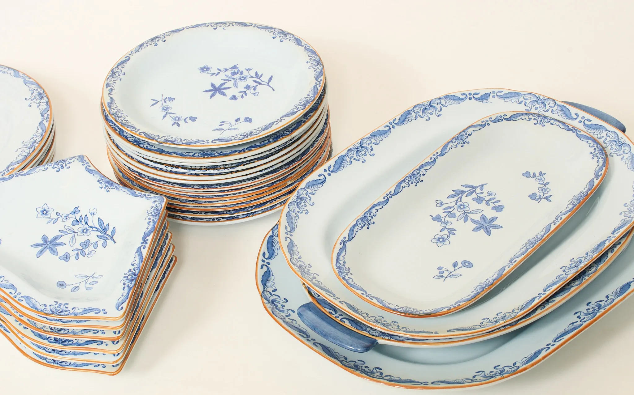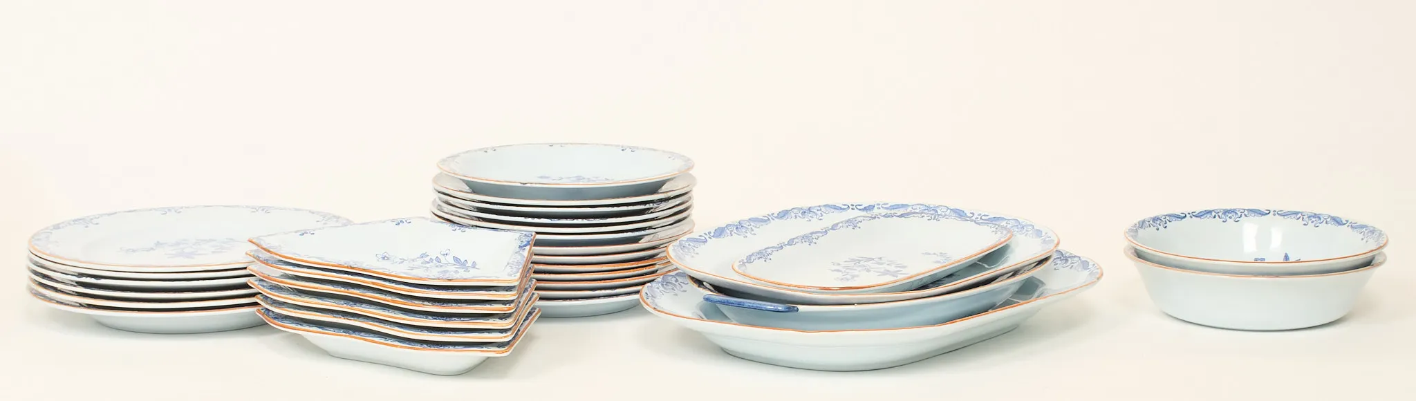 Äldre porslin, 30 delar, uppläggningsfat, tallrikar m.m. Bruksslitage, glasyrkrackeleringar, mindre missfärgningar föreommer. Enstaka nagg kan förekoma.