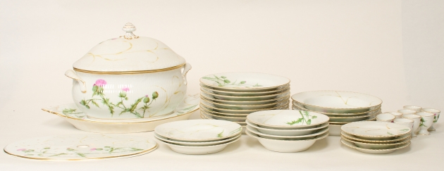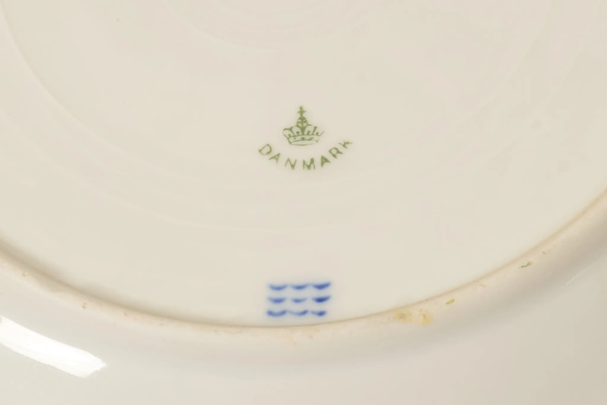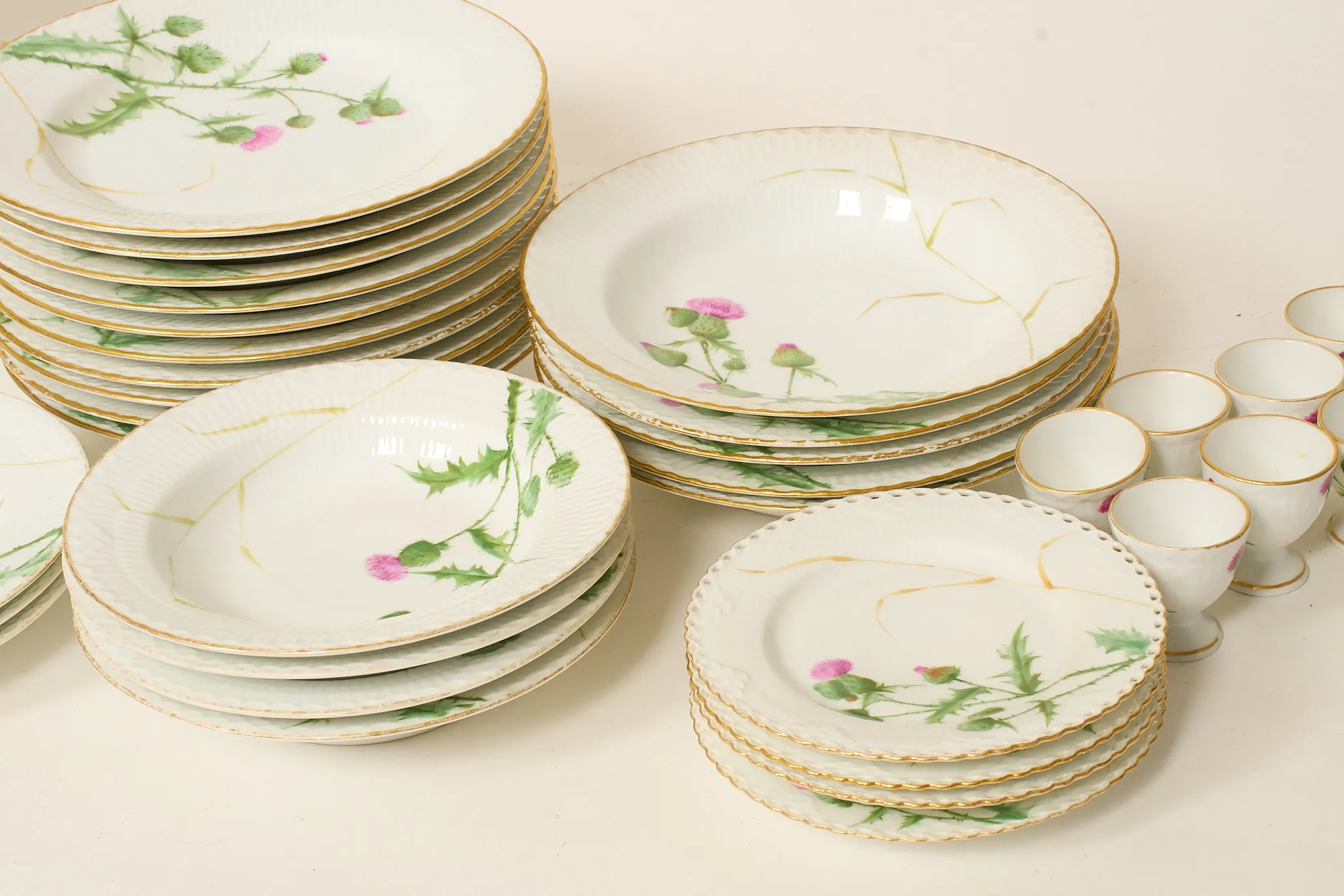 10 mattallrikar, diam 25 cm, 5 djupa tallrikar, 25 cm, 4 små djupa diam 20 cm, 3 assietter, diam 22 cm, 4 assietter, diam 17, 8 äggkoppar, soppterrin, samt insats till fiskfat. Bruksslitage, nagg samt lagningar förekommer.