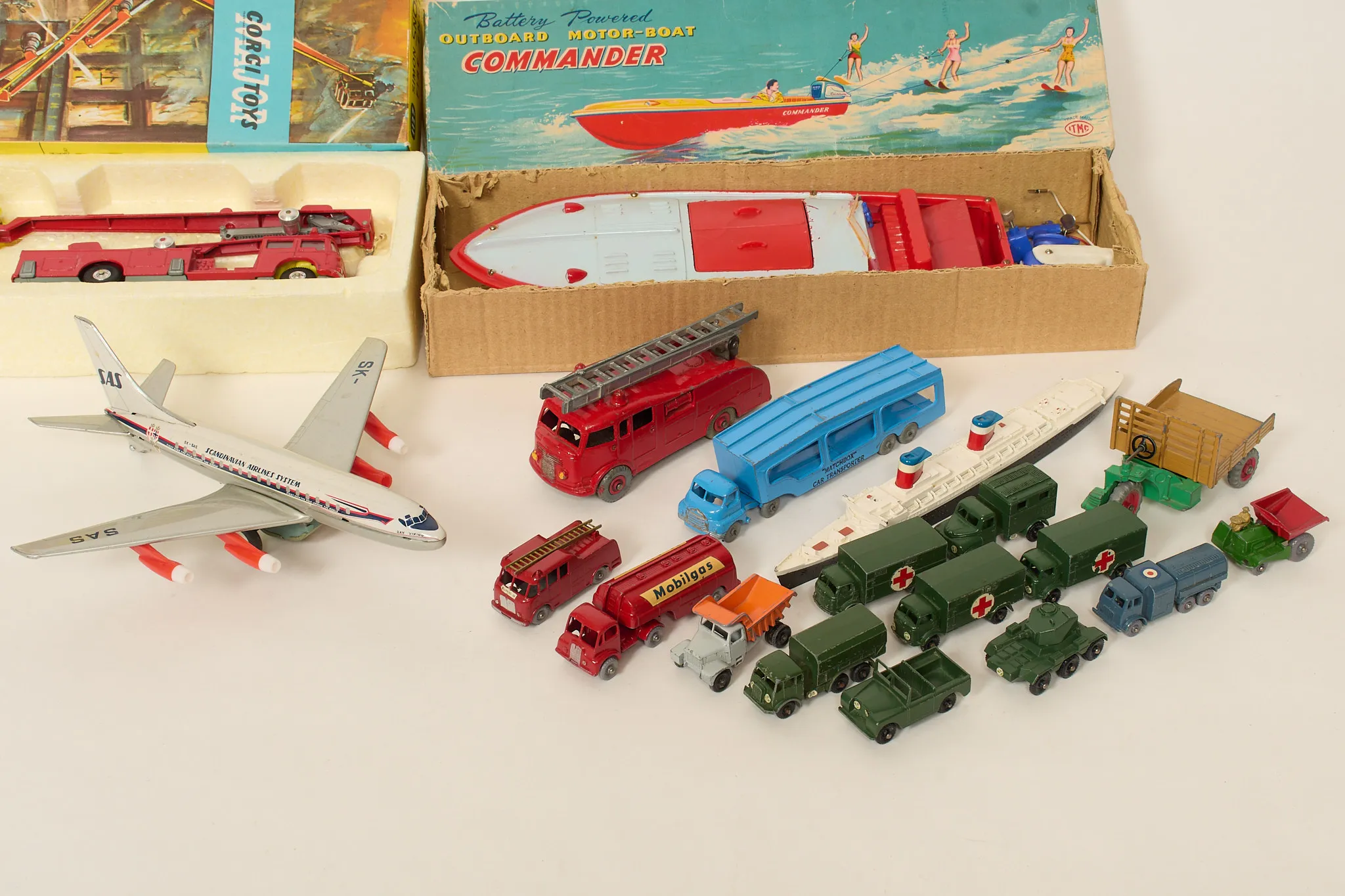 Corgi 1127 brandbil originalkartong. Commander motorbåt originalkartong. Flygplan SAS, båt SS united States 25 cm, Lesney bl a militärfordon. Corgi, Dinky. Slitage, skador