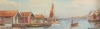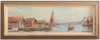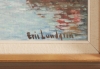 Sjöbodar och fiskebåt, signerad. Bildmått 29 x 100 cm.