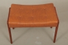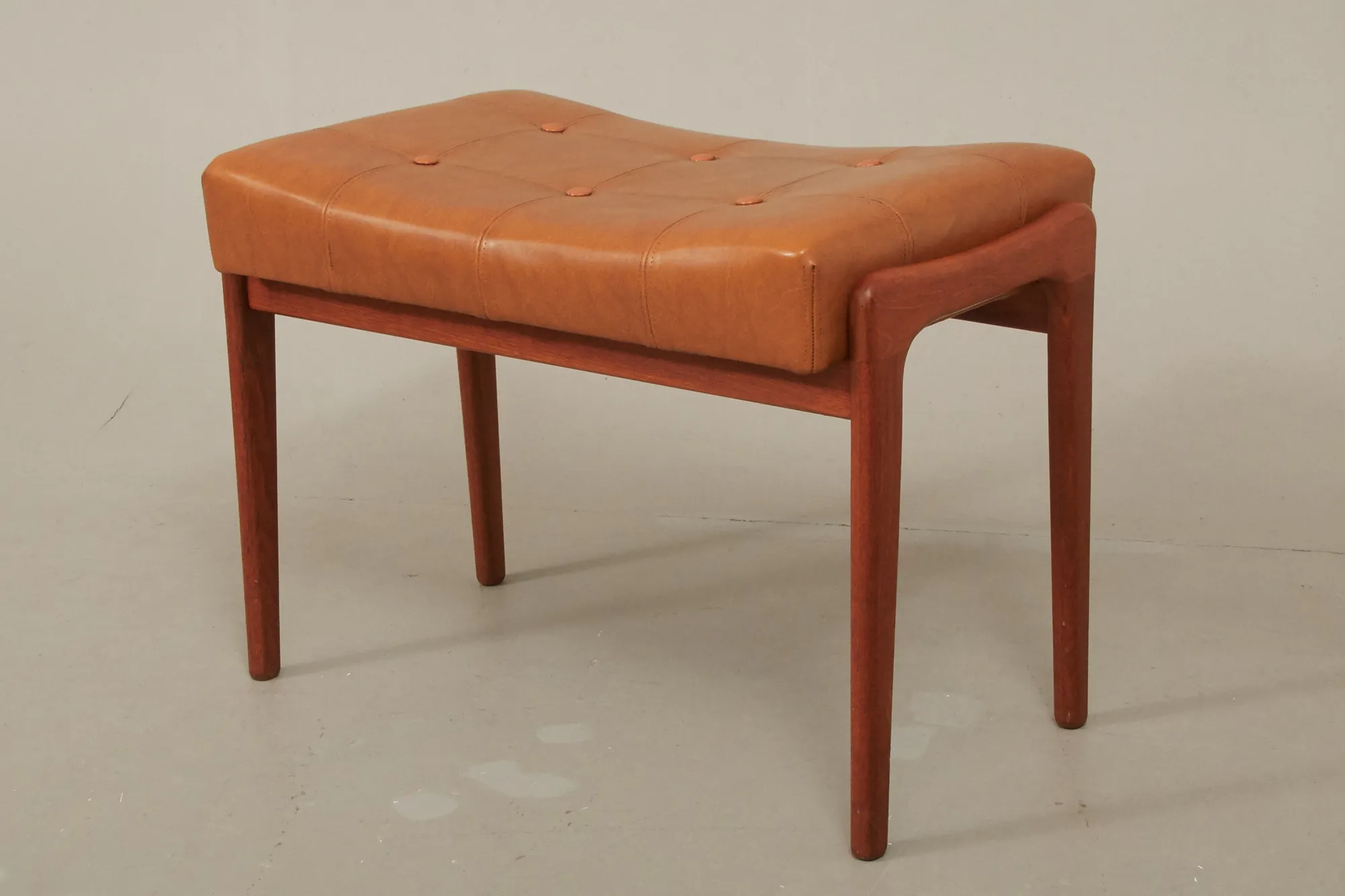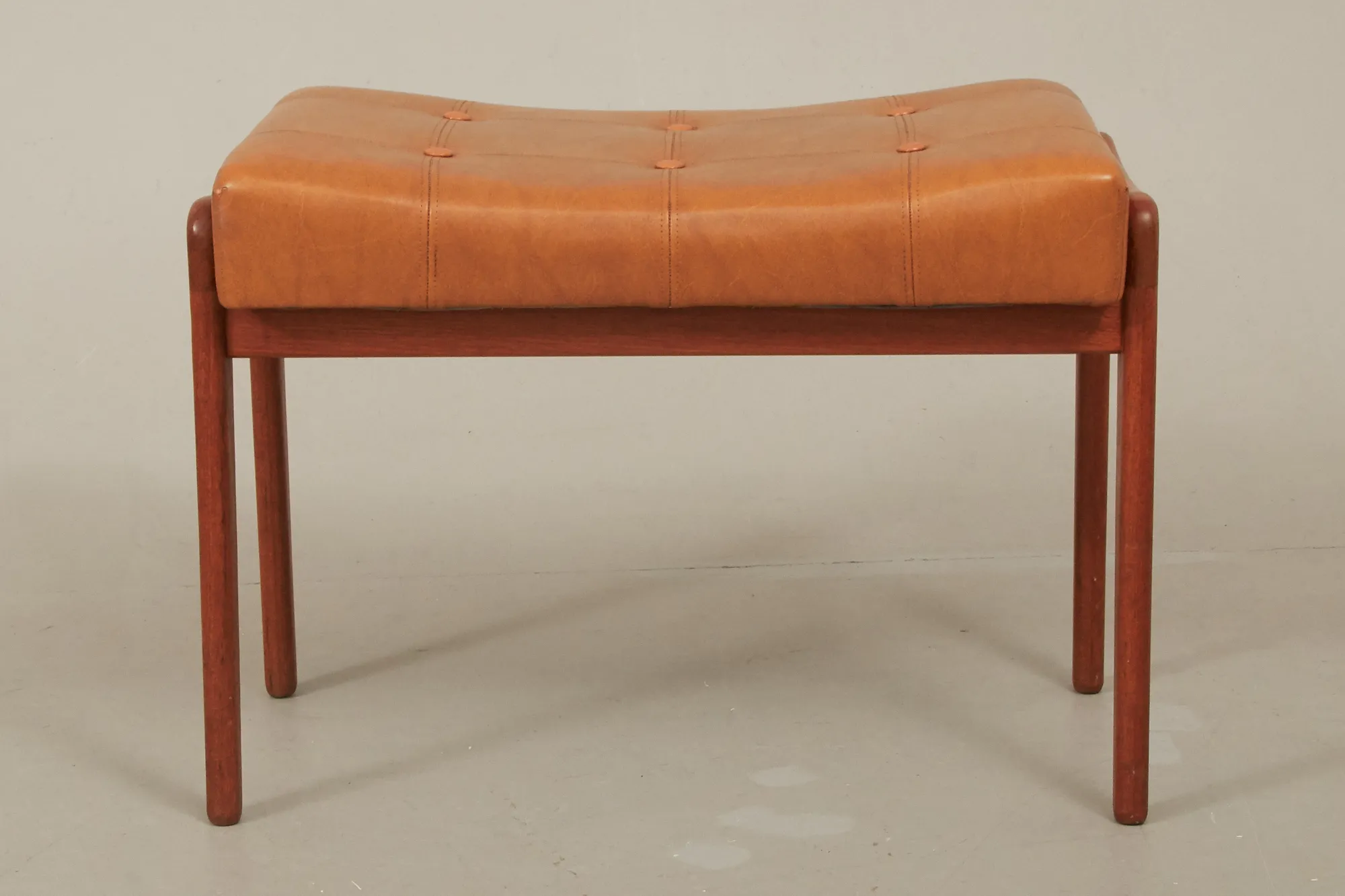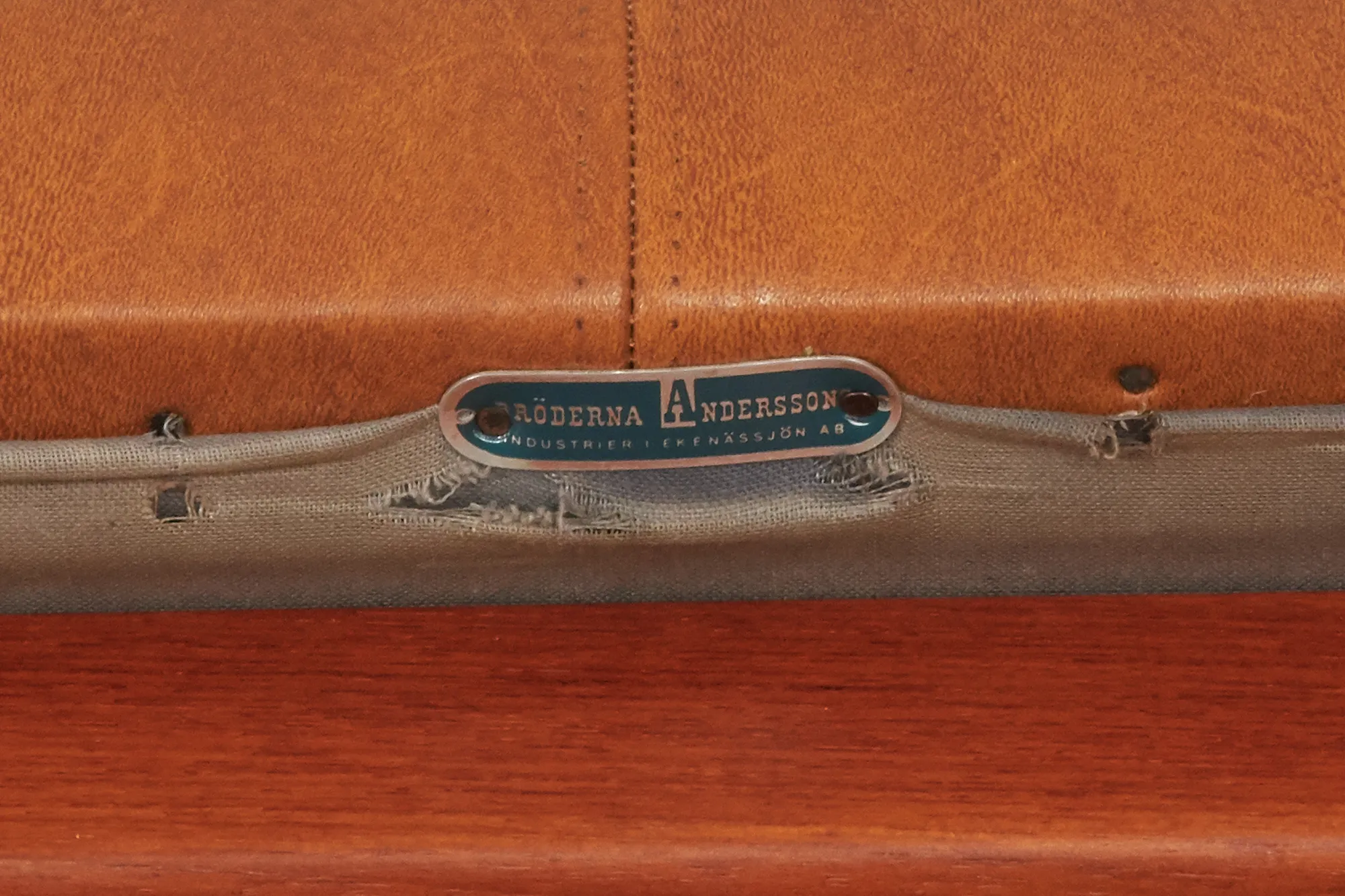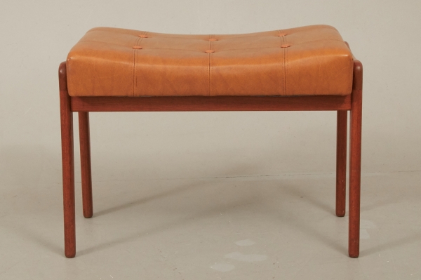 Stomme i teak klädd i brun galon, 63 x 40 cm, höjd 43 cm. Skyltmärkt Bröderna Andersson. Bruksslitage