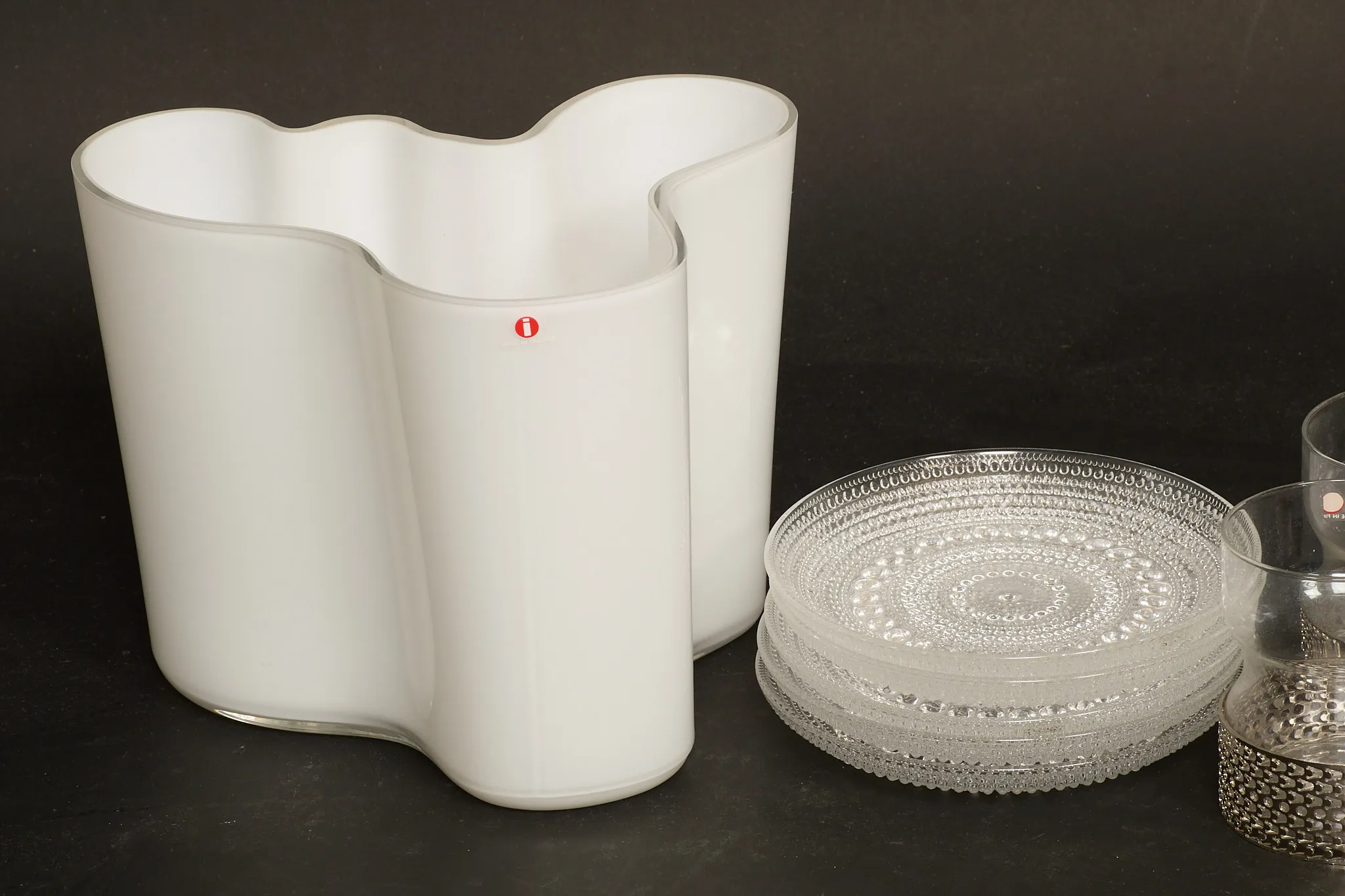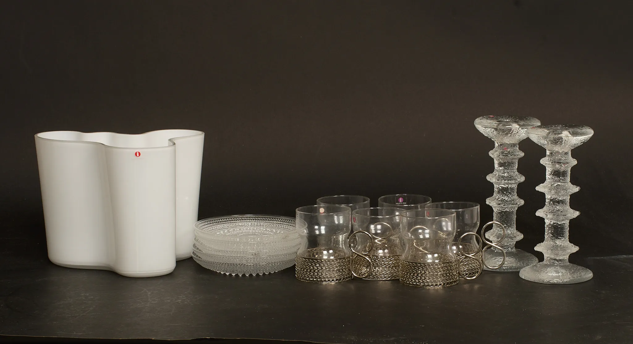 2 st ljusstakar, "Festivo", höjd 18 cm, vas, "Savoy", höjd 16 cm, 6 irish coffee-glas, samt 5 assietter, "Kastehelmi", gott skick