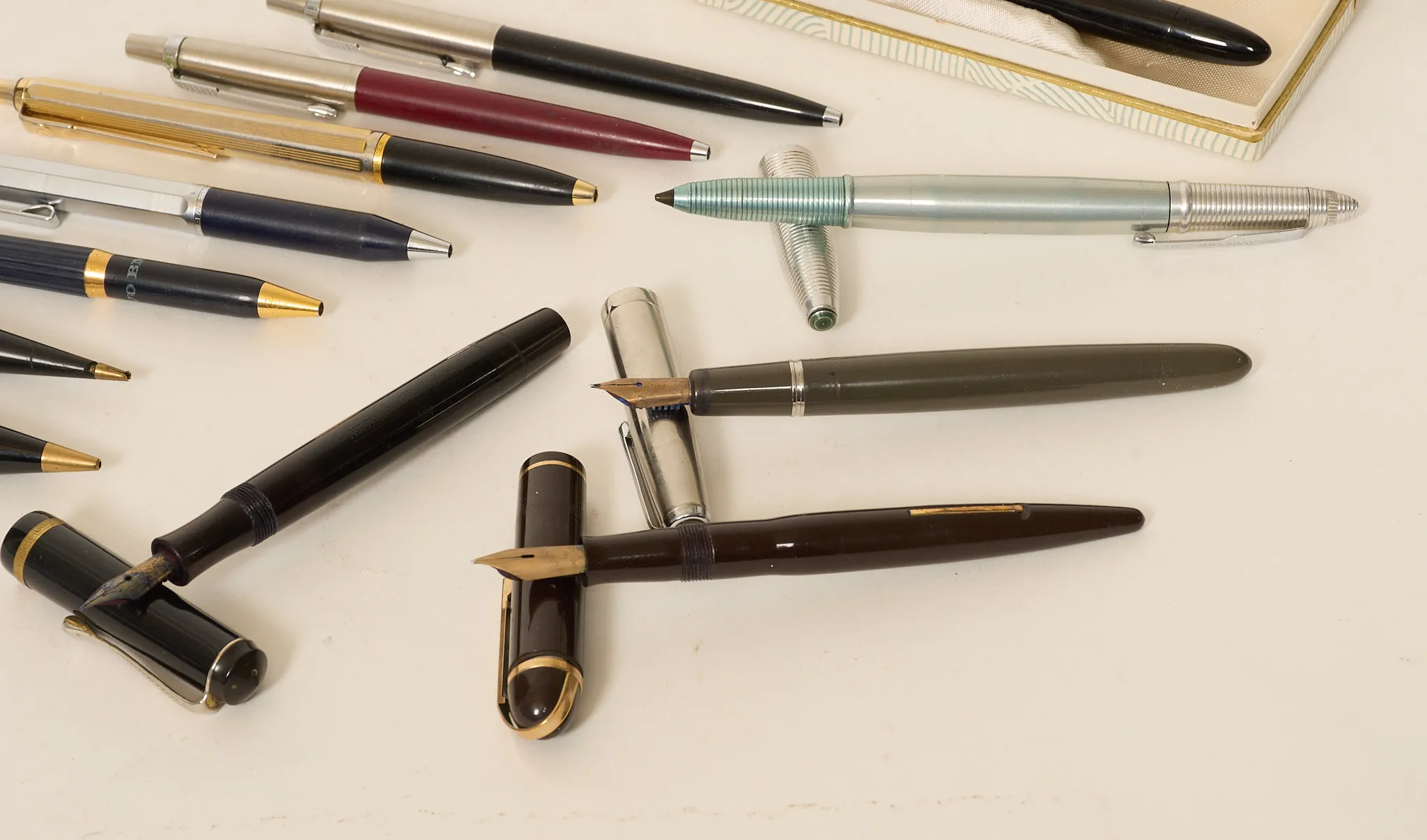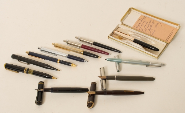 Kreuzer reservoar, Eversharp reservoar, Matador Express reservoar, Parker resveroar, 2 Ballograf kulpennor, 2 Parker kulpennor, 1 Reynolds aluminium.