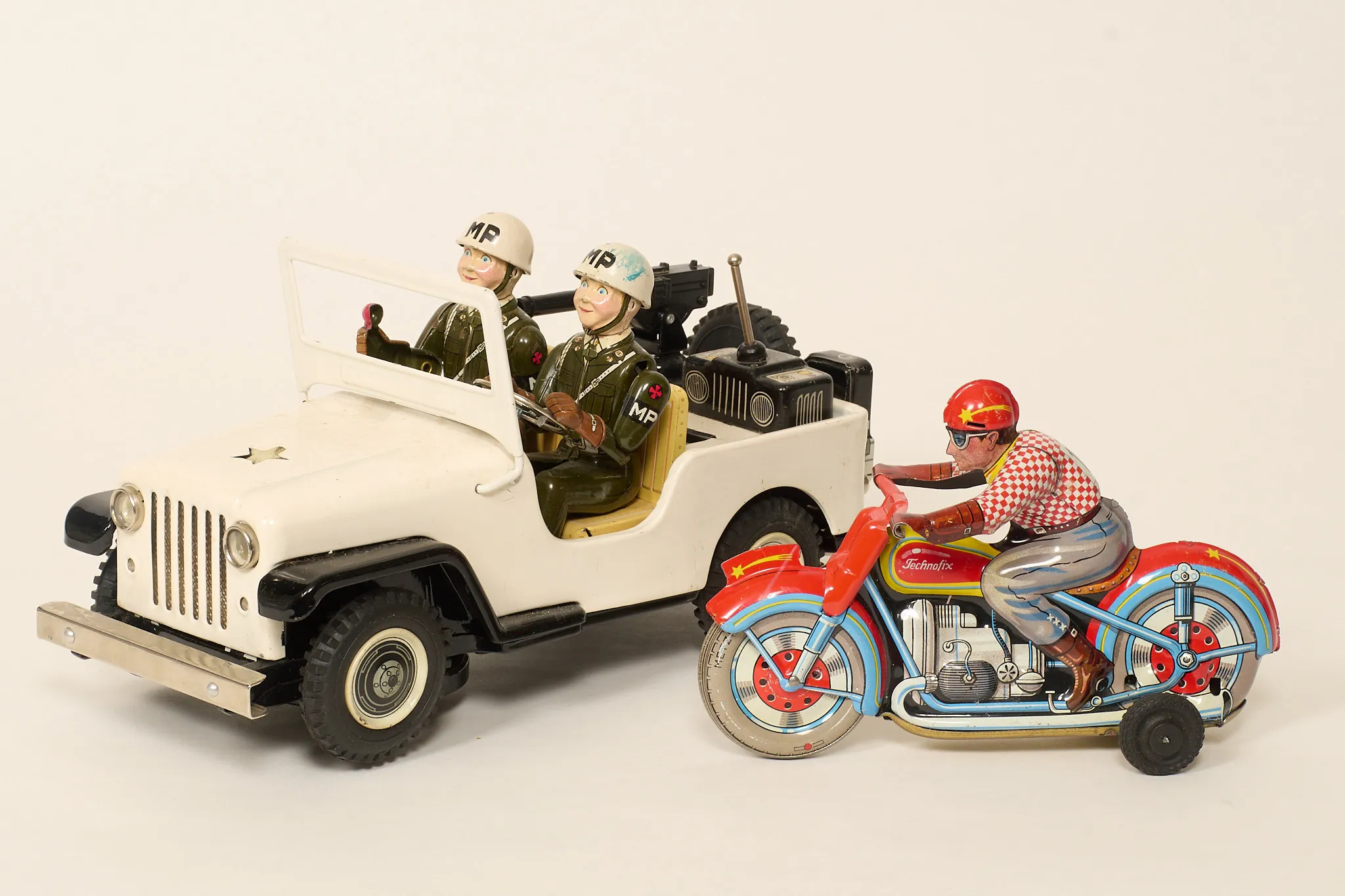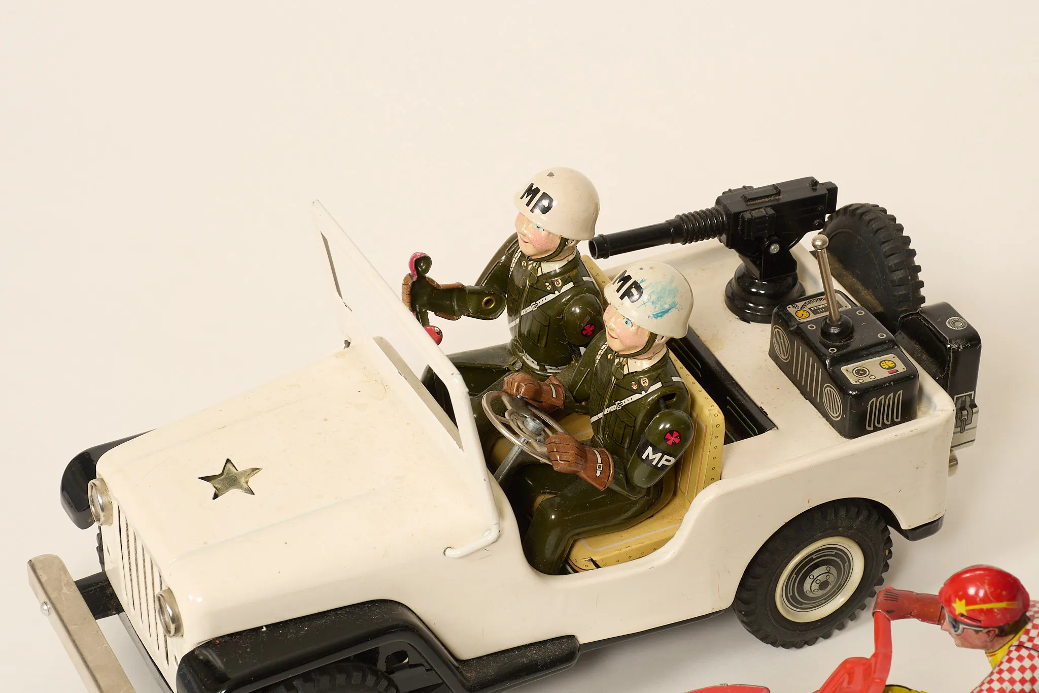 Militärjeep Japan Nomura, batteri, bra skick, L 28 cm. MC Technofix Tyskland Längd 18 cm, smärre slitage.