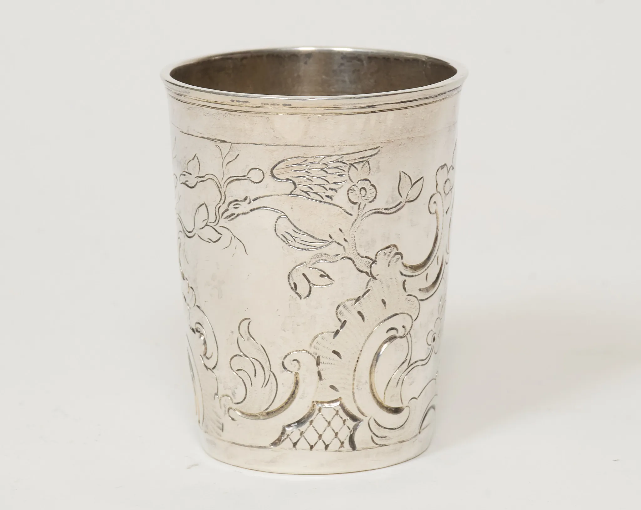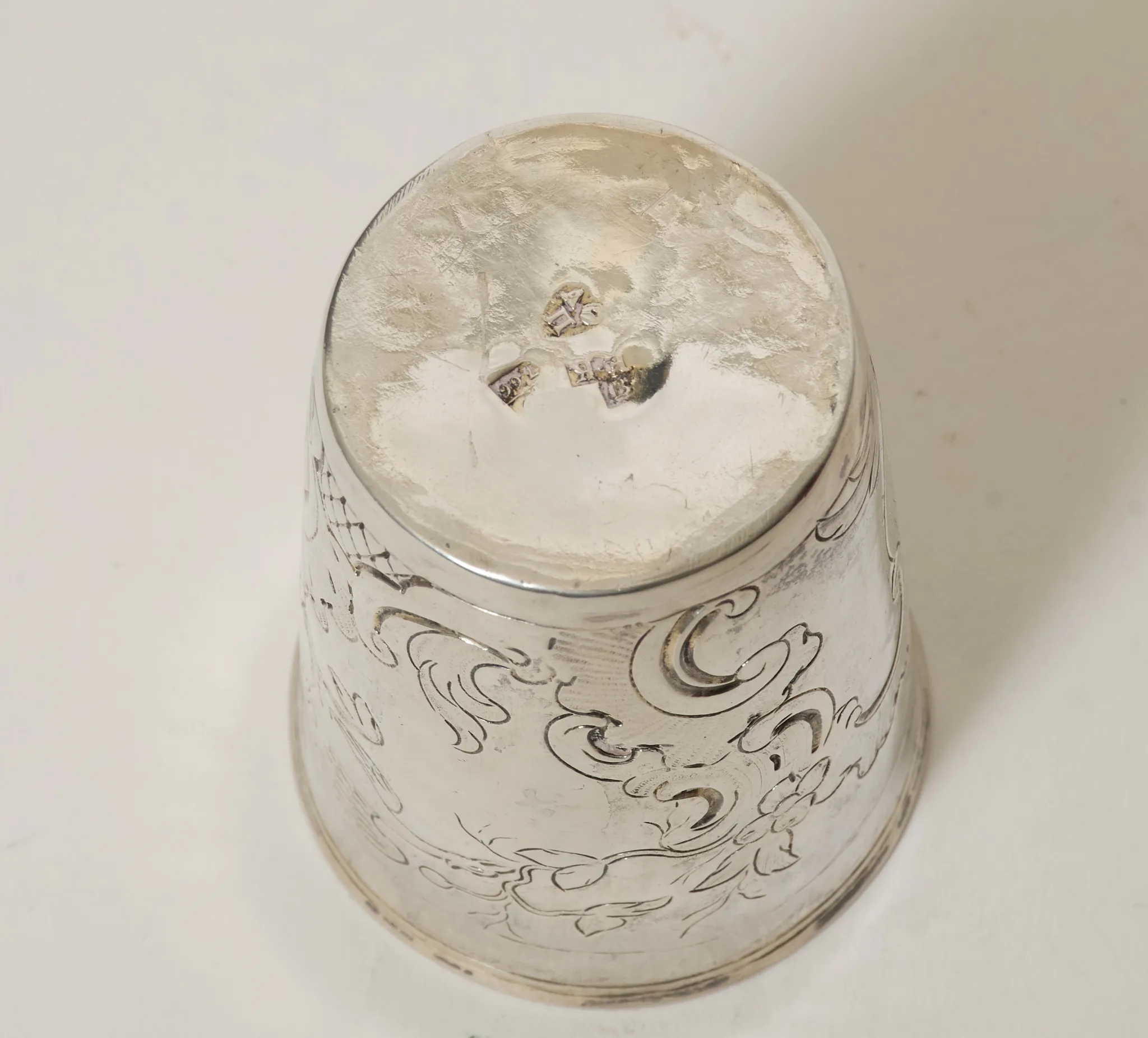 17/1800-tal. konisk form, graverad dekor, höjd 7 cm, vikt 61 gram, bruksslitage