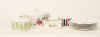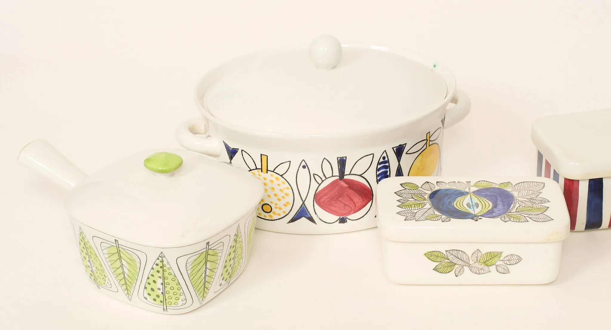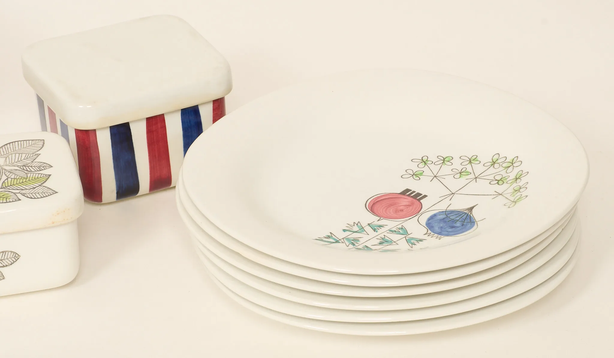 6 tallrikar, samt karott "Pomona", karott "Garden", smörbytta "Eden", samt "Rando", bruksslitage, missfärgningar förekommer.