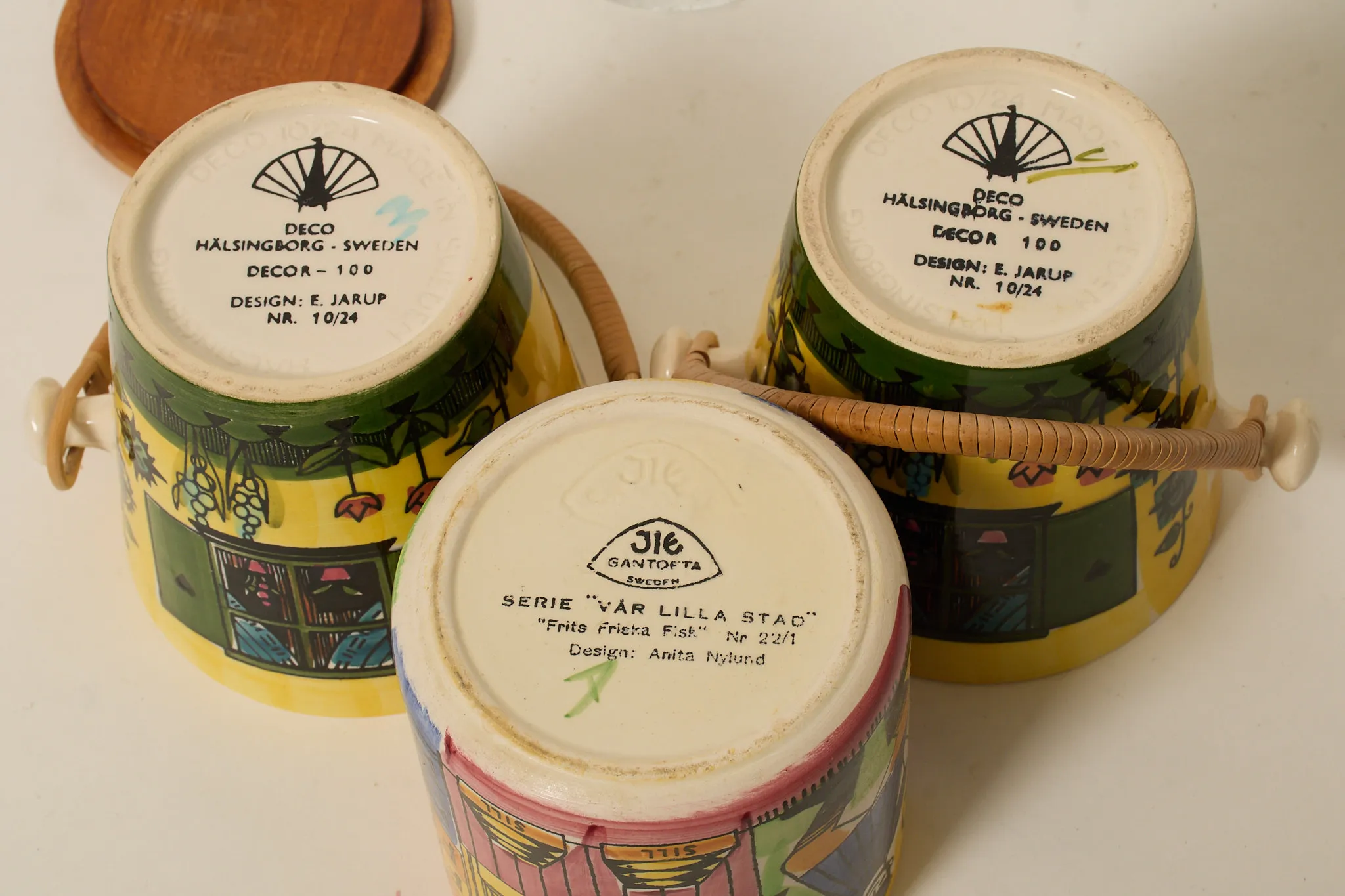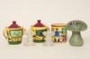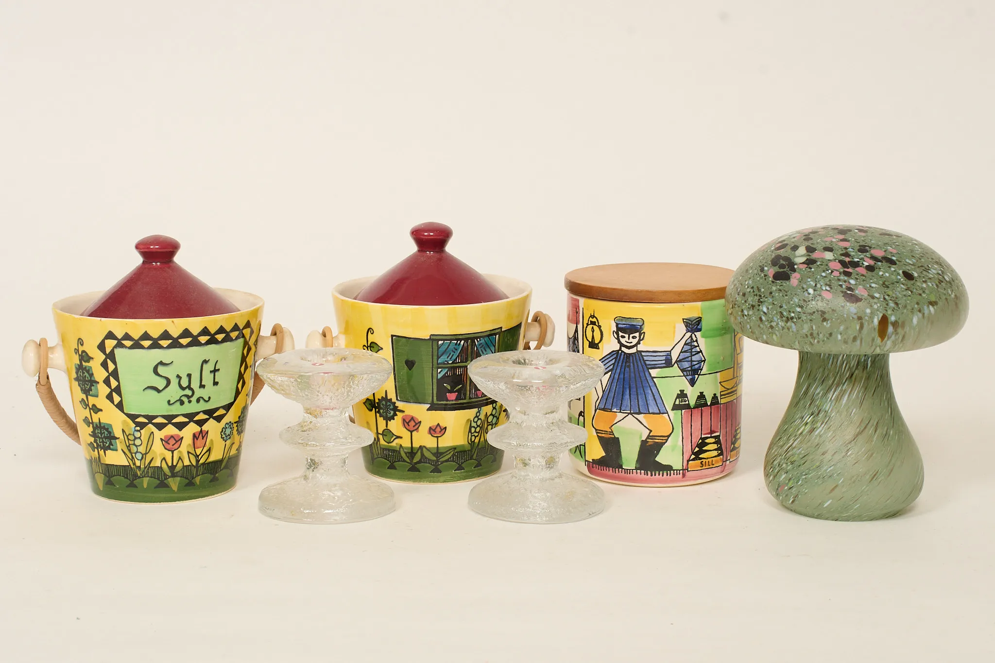6 delar, 3 porslinsburkar DECO, ett par ljusstakar "Festivo" Timo Sarpaneva, svamp Monica Backström. Bruksslitage, nagg på en av porslinsburkarna.