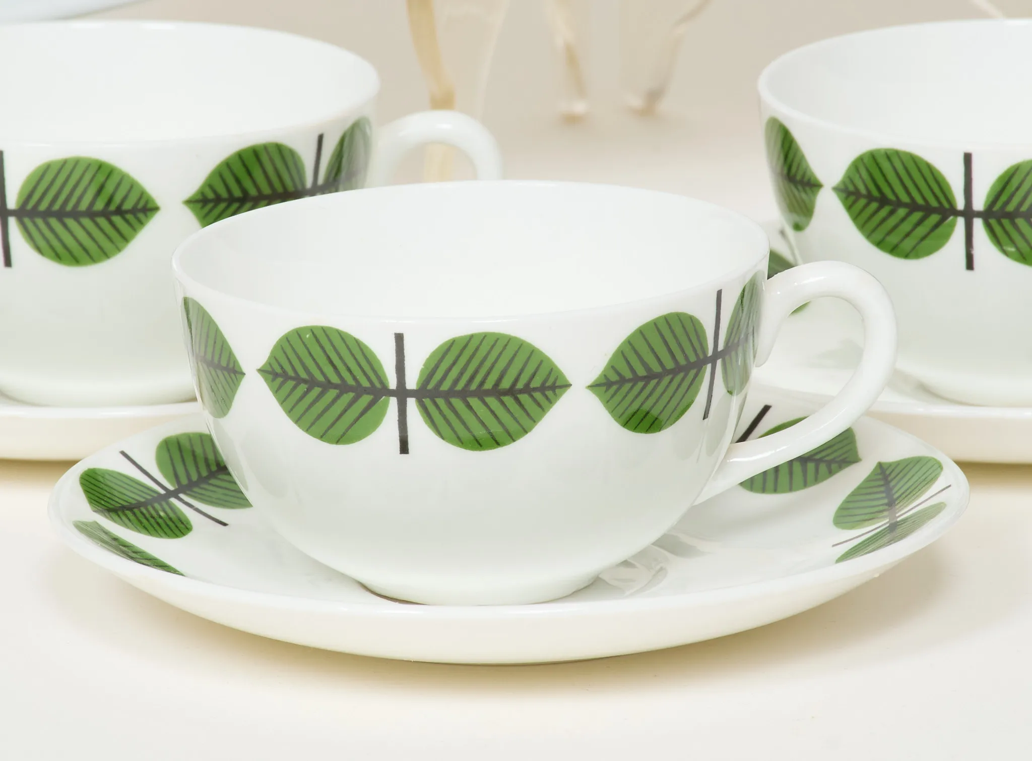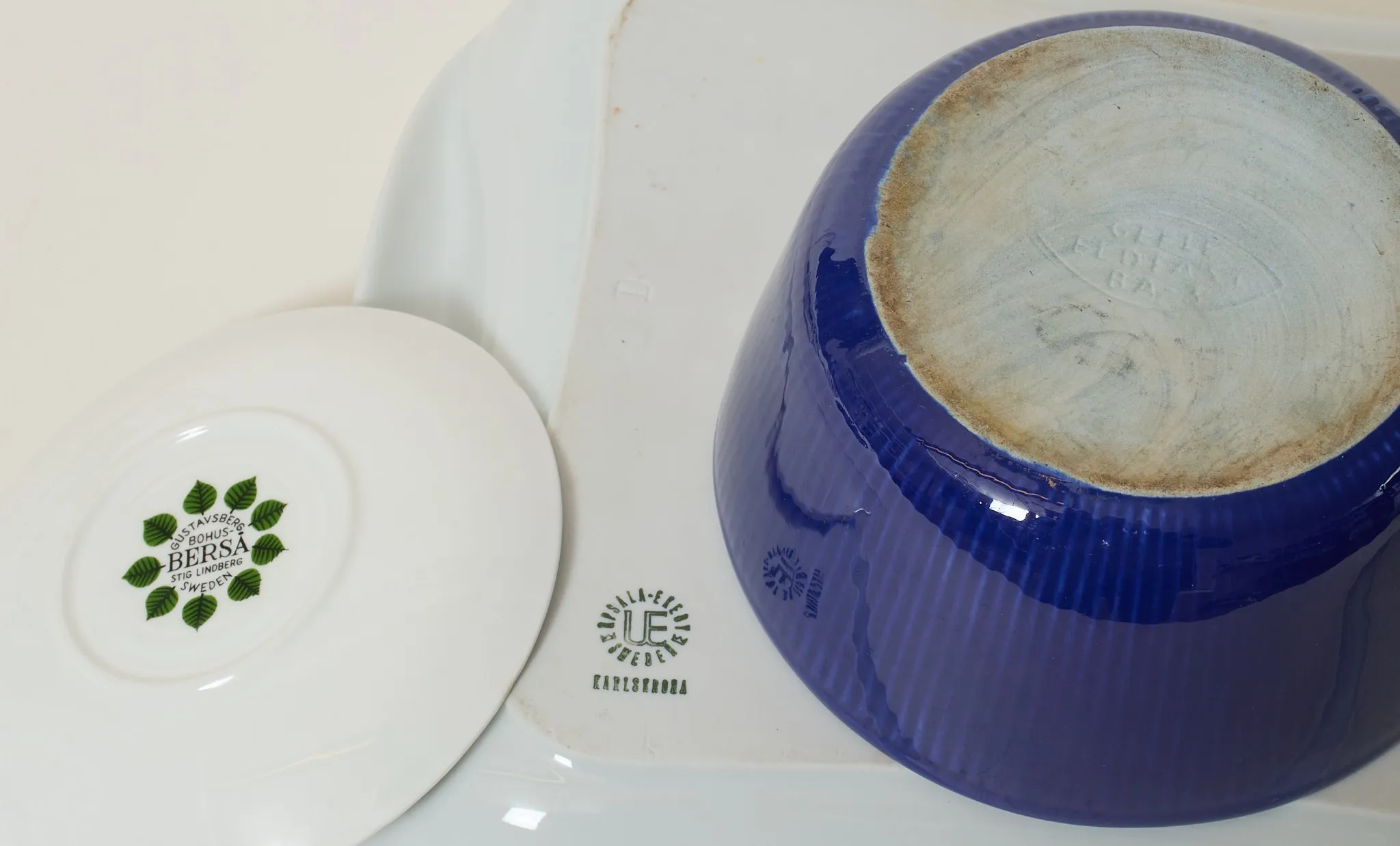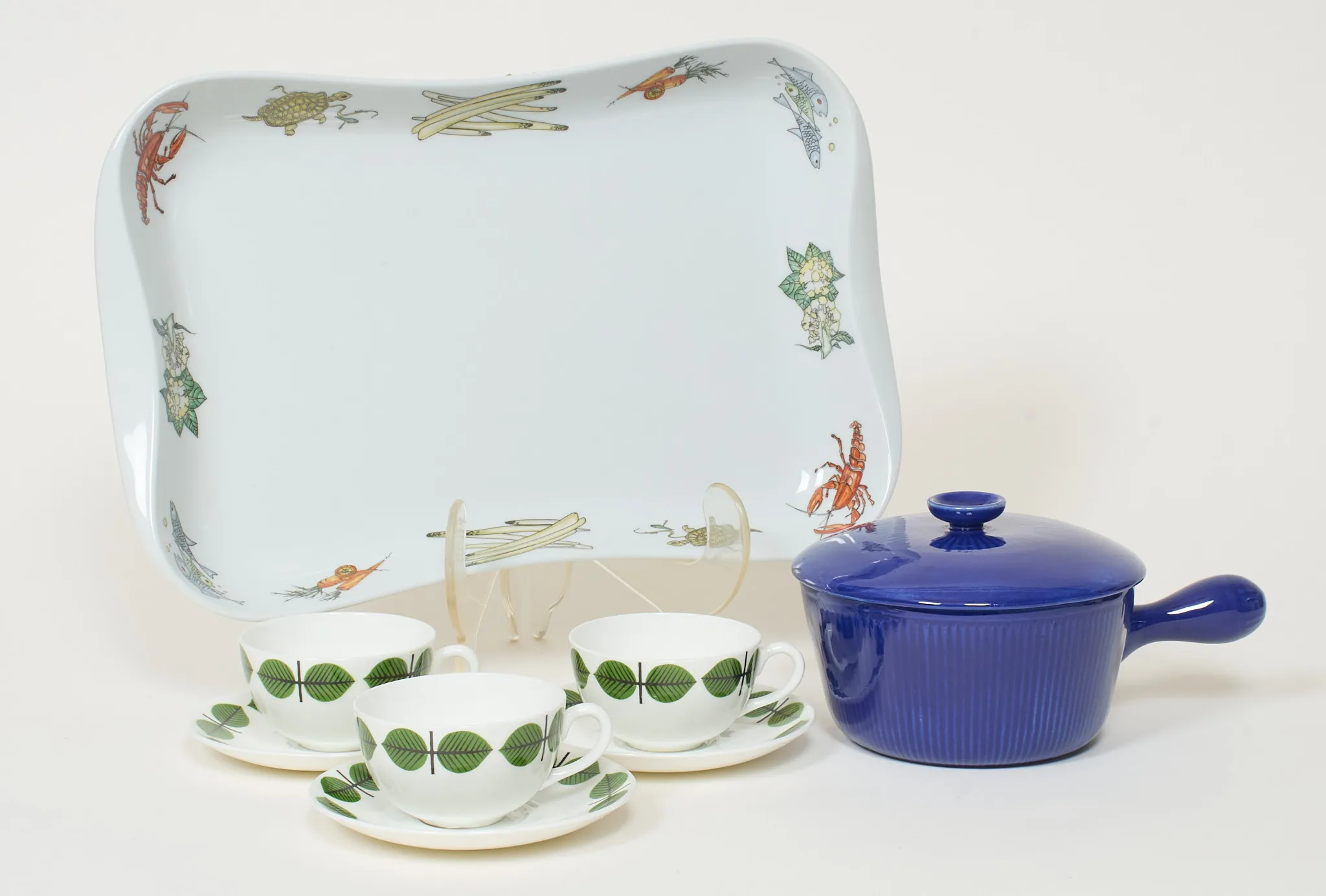3 koppar med fat, uppläggningsfat, karott, längsta längd 36 cm, bruksslitage.