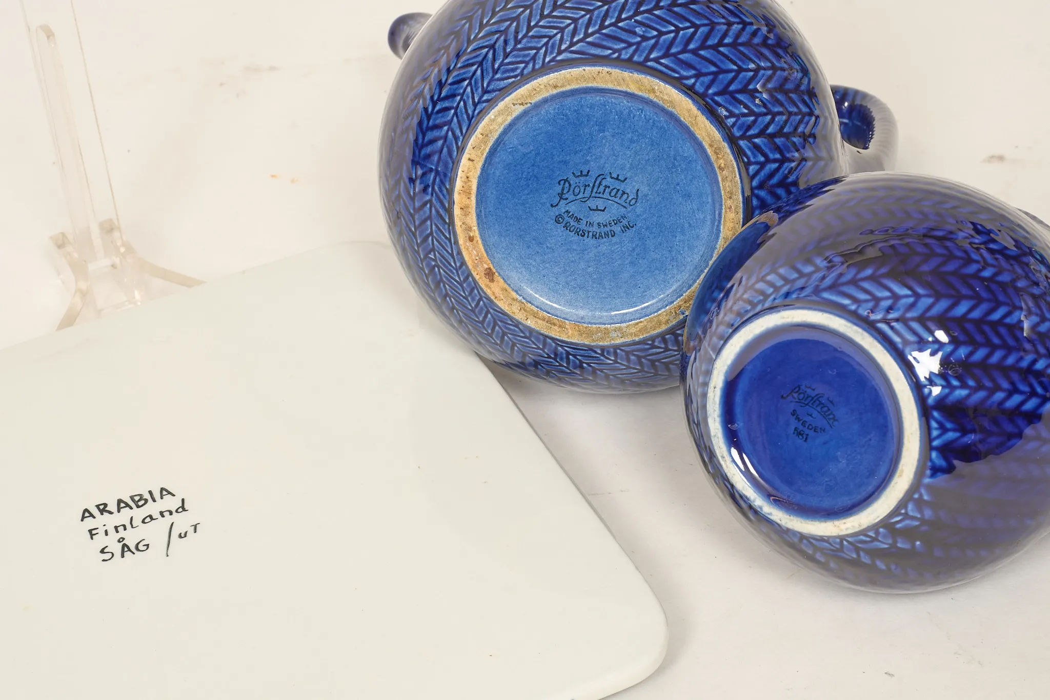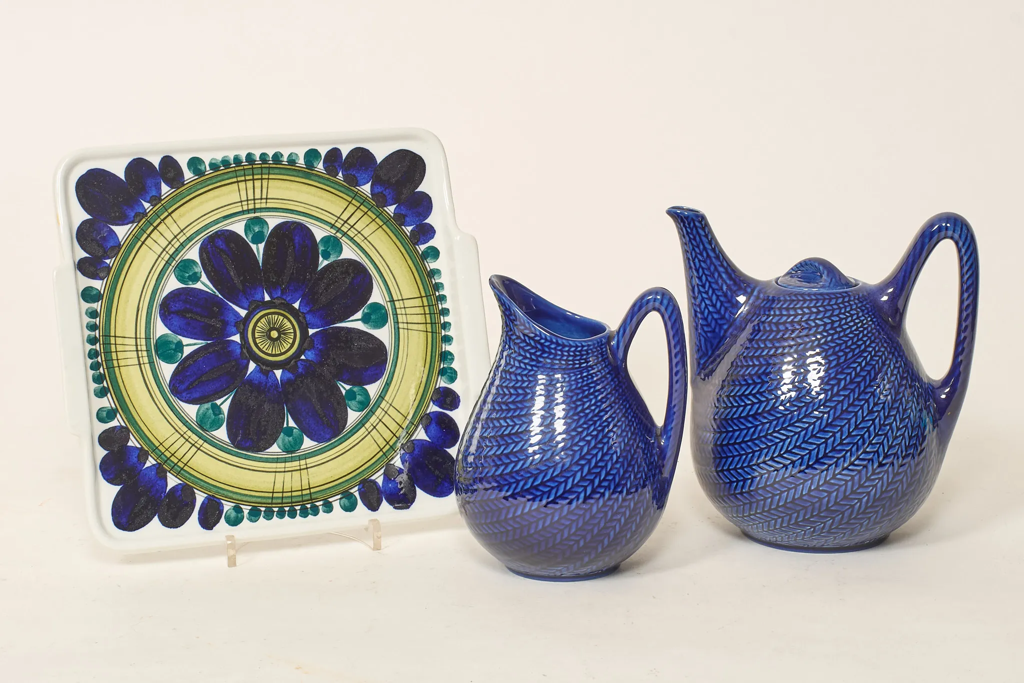 Tillbringare, samt kaffekanna (med minimalt nagg i pip), "Blå Eld", ostbricka, Svea Granlund, Arabia, mått bricka 24 x 22 cm, smärre bruksslitage.
