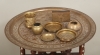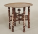 Benställning i trä, med inläggningar av pärlemor/ben, skiva i mässing diam 59 cm, höjd 52 cm. Bruksslitage.