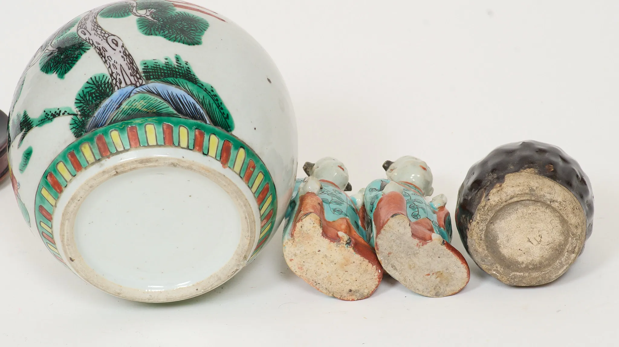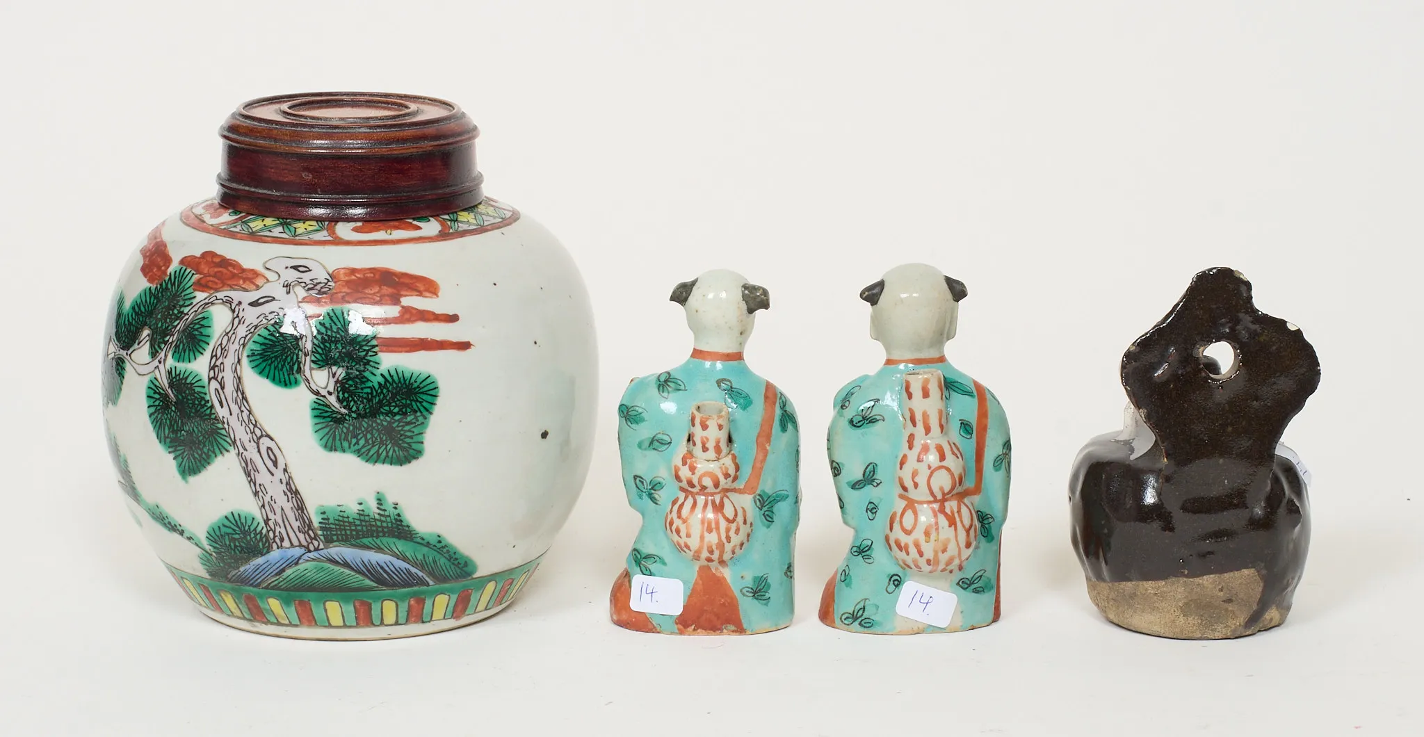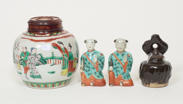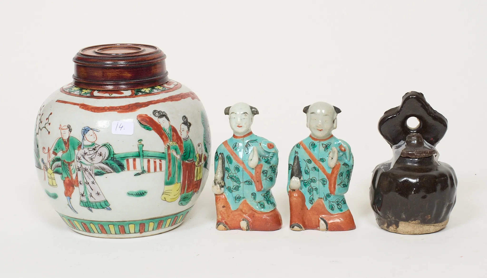 4 delar, emaljdekor, 2 st rökelsebehållare, i form av pojkar. Senare trälock till bojan. Nagg förekommer på rökelsebehållare. Höjd 10 - 16 cm.