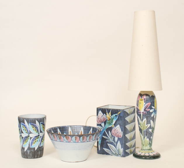 4 delar, 2 vaser, skål, samt bordslampa (hellagad), höjd 10 - 27 cm (lampfäste lampa), bruksslitage.