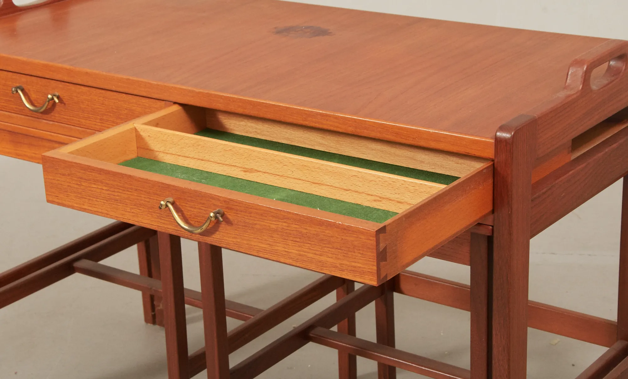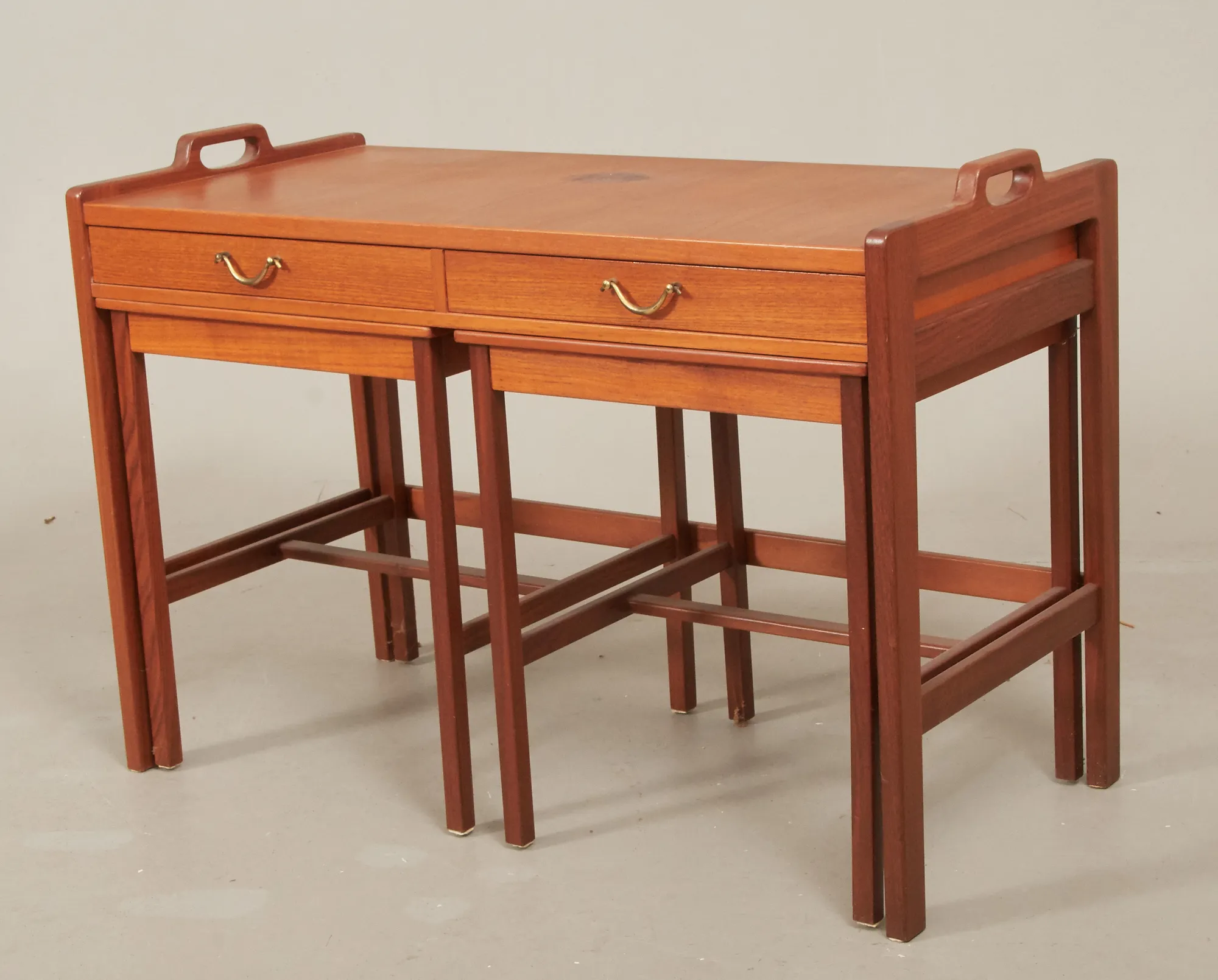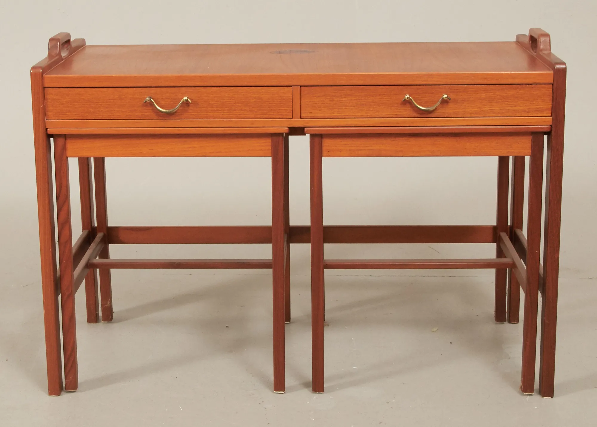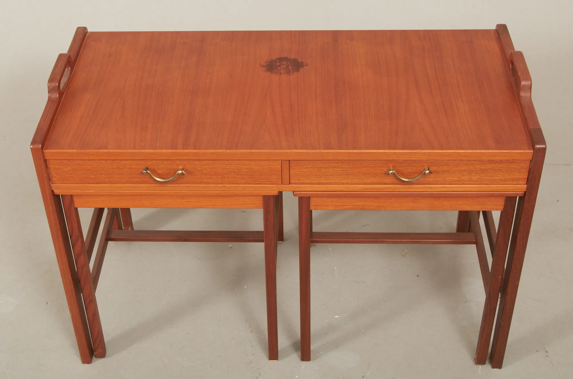 Skaraborgs Möbelindustri, Tibro, teak, 3-delat, bord med 2 handtag, 2 utdragslådor, med mässingshandtag, 84 x 40 cm, höjd 58 cm, bruksslitage, skiva med fläckar.
