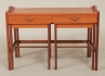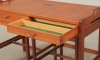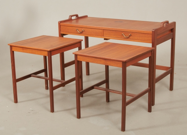 Skaraborgs Möbelindustri, Tibro, teak, 3-delat, bord med 2 handtag, 2 utdragslådor, med mässingshandtag, 84 x 40 cm, höjd 58 cm, bruksslitage, skiva med fläckar.