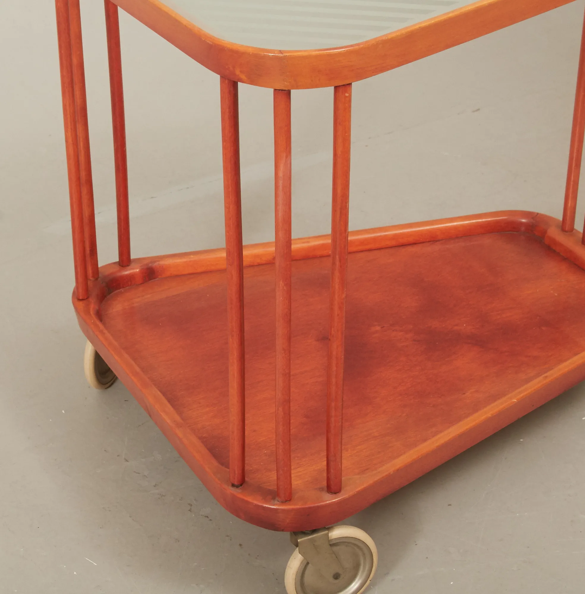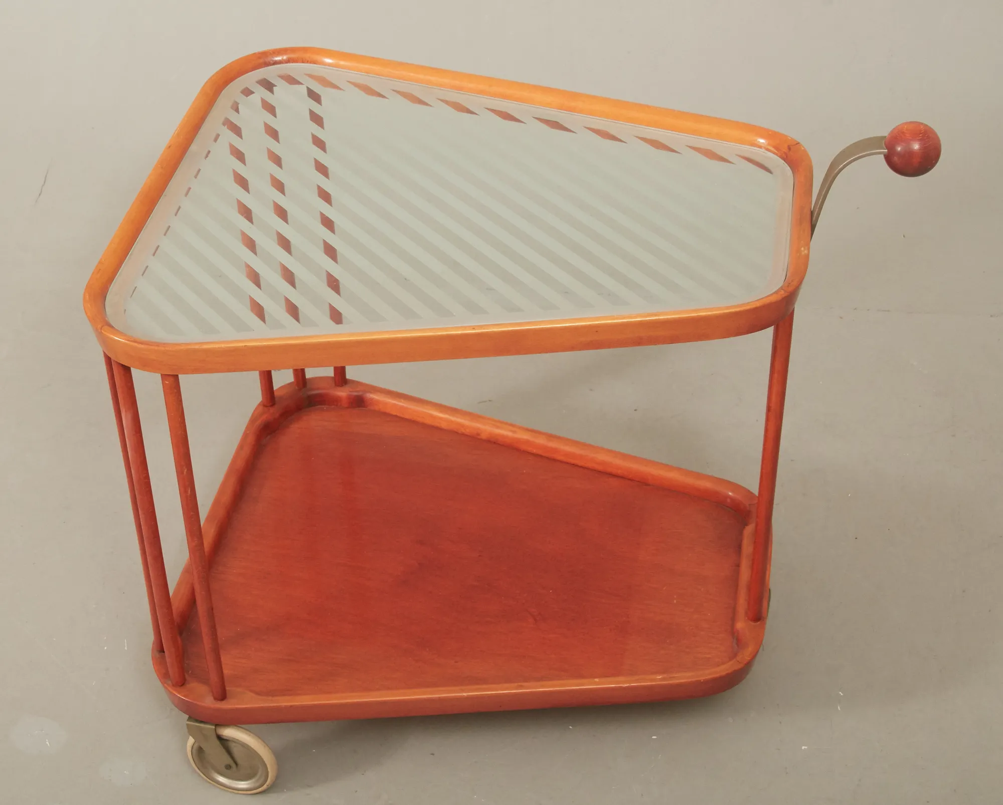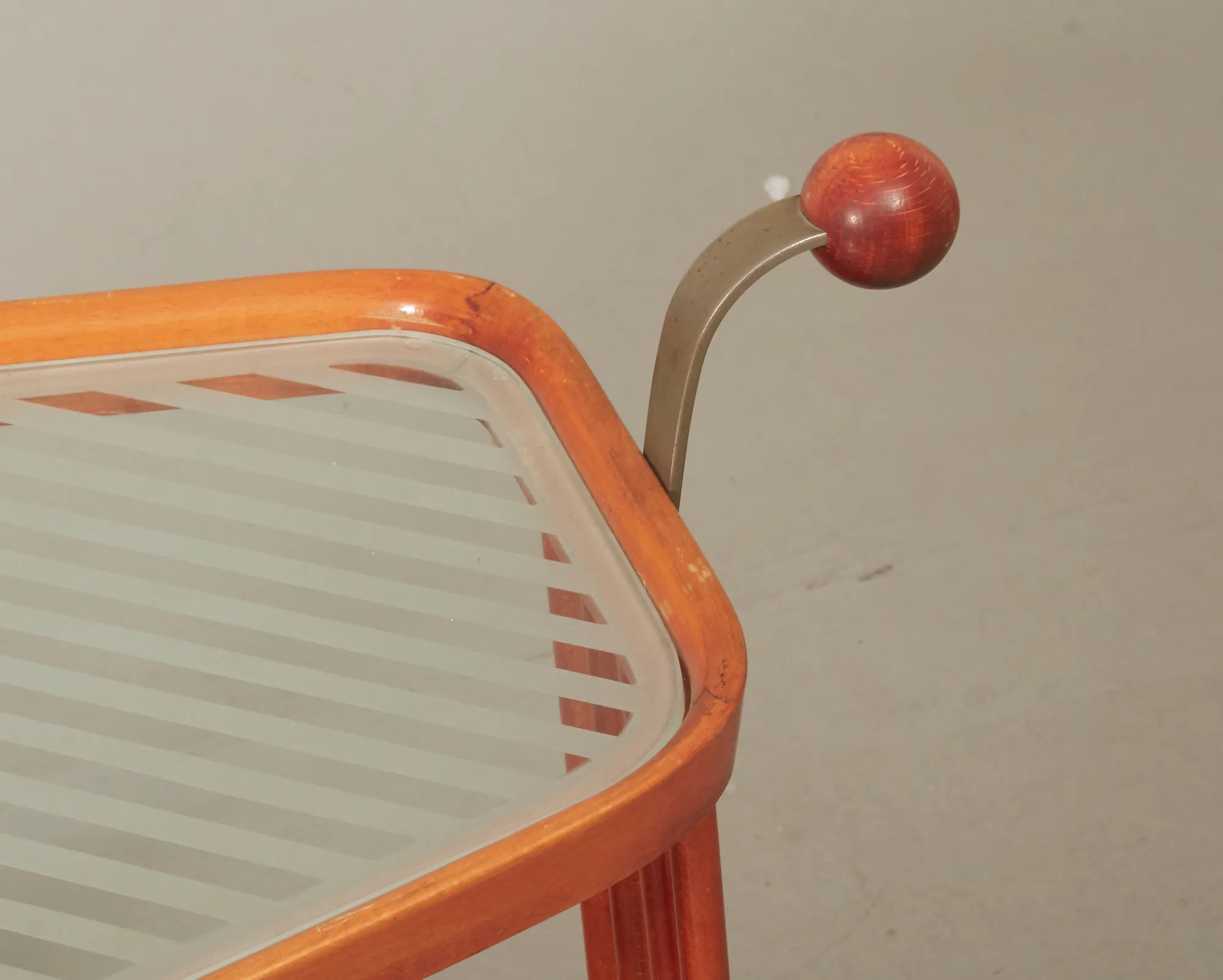 1940-tal, modell 879, mahognybetsat trä, skiva med randig dekor av frostat glas, hjulförsedd. 73 x 45 cm, höjd 63 cm. Bruksslitage.