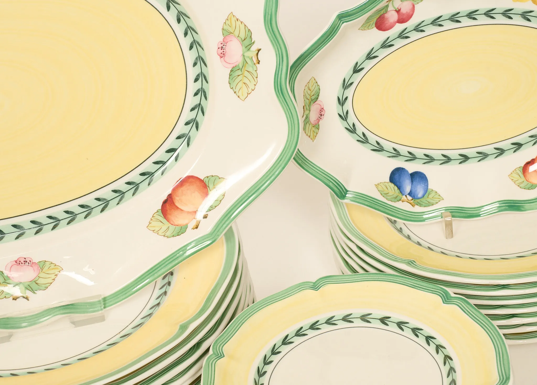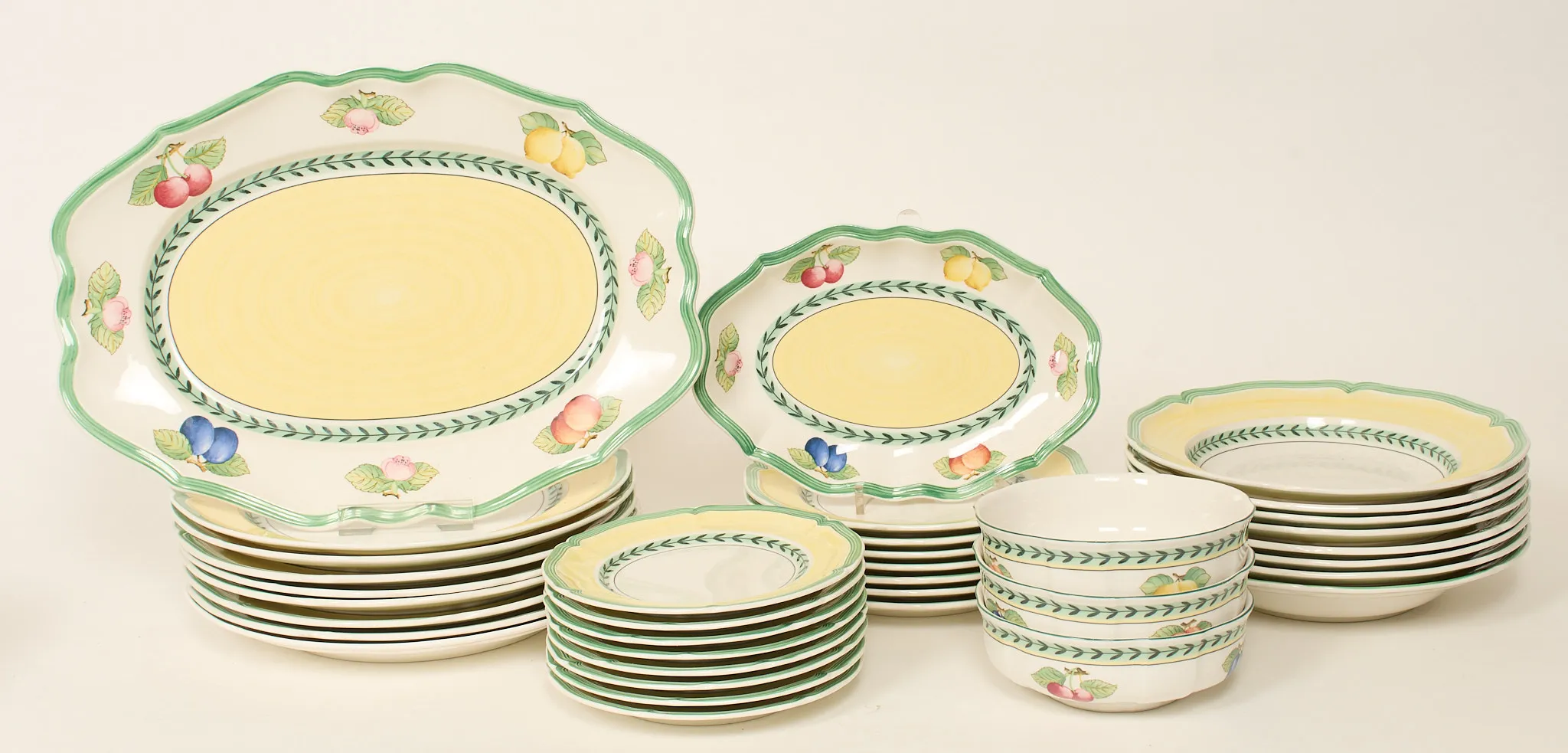 36 delar, 8 små assietter, 7 assietter, 8 mattallrikar, 3 skålar, 8 djupa, 2 uppläggningsfat. Smärre bruksslitage.