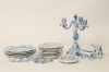 24 delar, 1 kandelaber, 9 assietter, 4 mattallrikar 3 saltkar, gräddkanna, såssnipa, underlägg, 2 gallerskålar, 2 smörknivshållare. Spricka samt nagg kandelaber, bruksslitage.