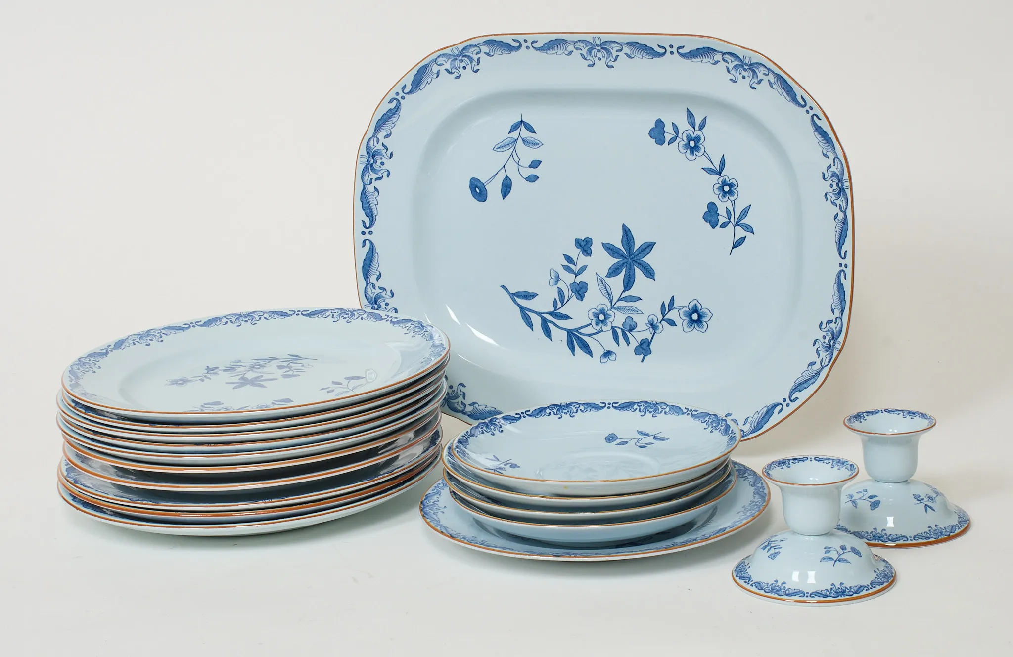 18 delar, 10 tallrikar diameter 24 cm, 1 par ljusstakar, uppläggningsfat 36 x 27 cm, 5 udda fat. Smärre bruksslitage.