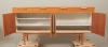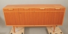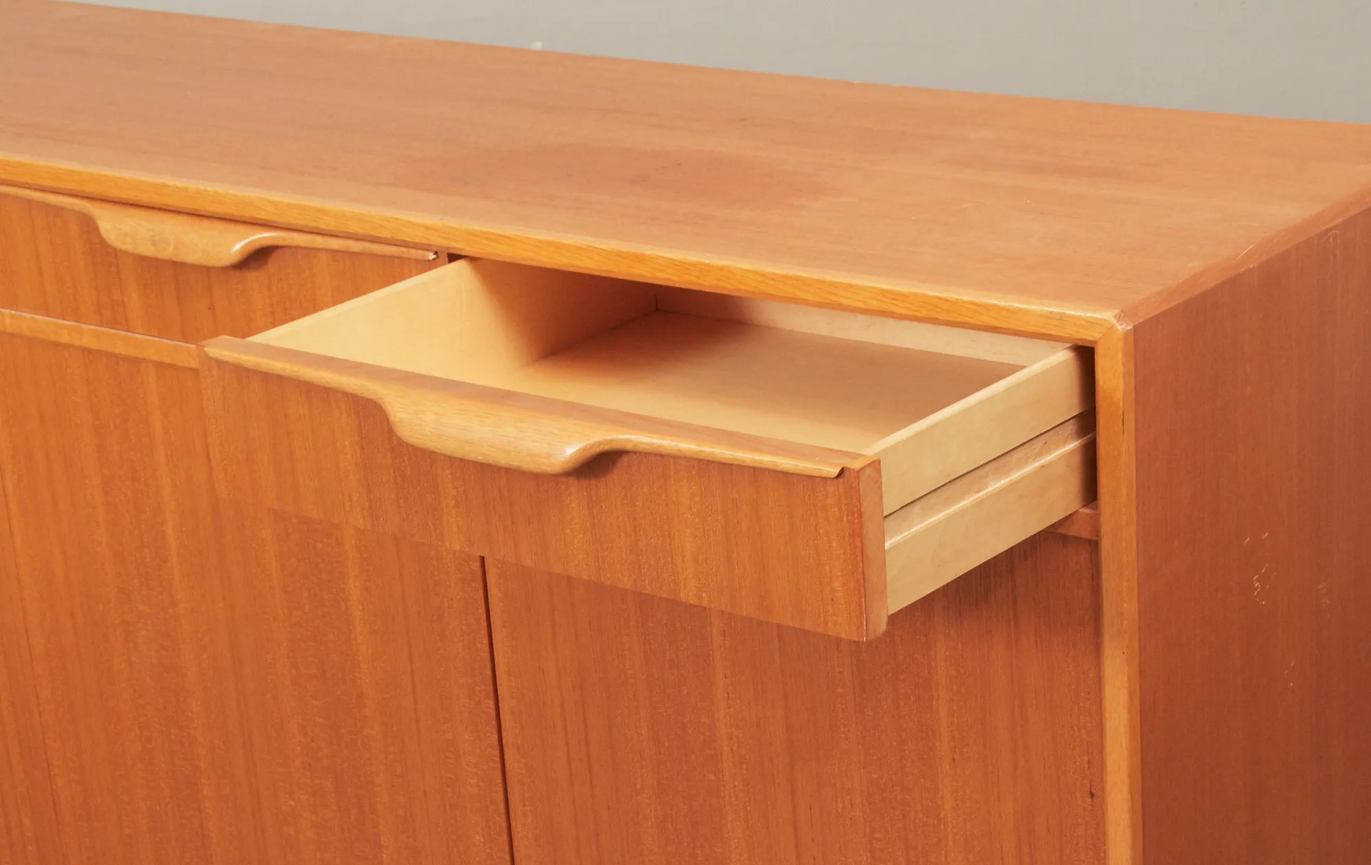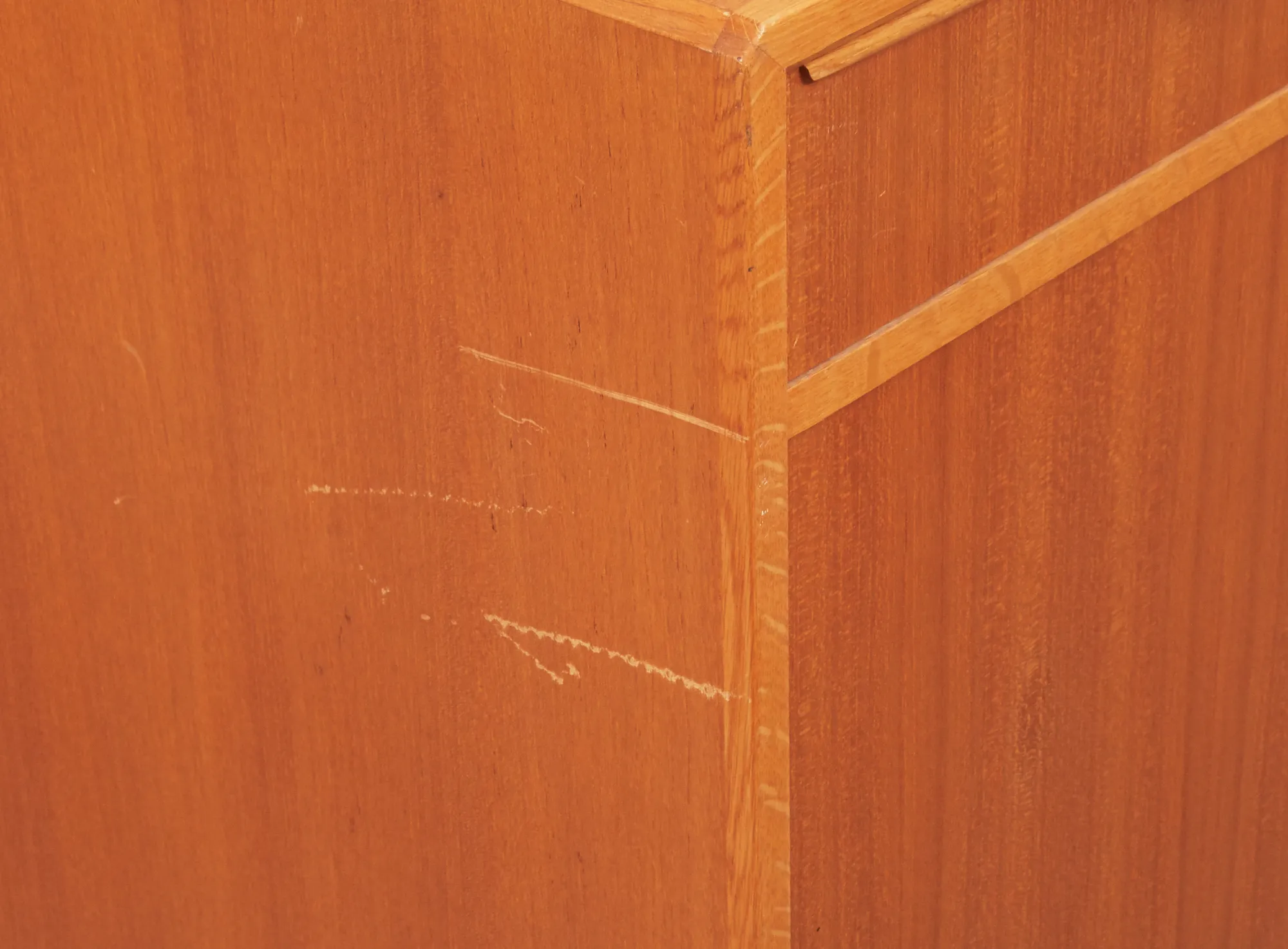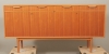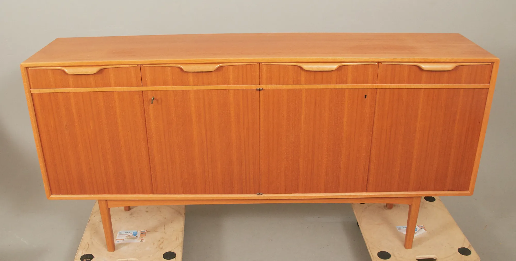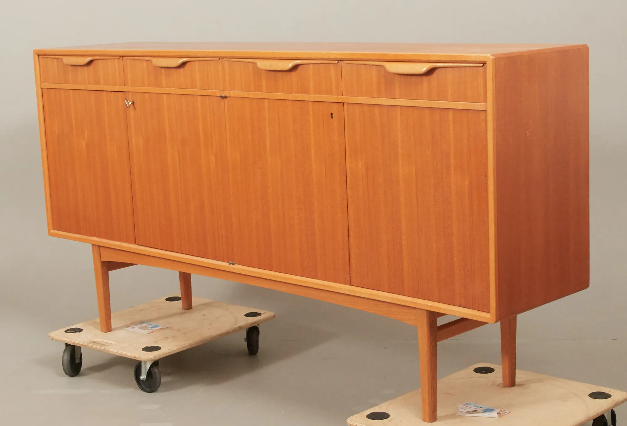 Teak, 4 utdragslådor, samt 2 dörrpar med bakomliggande hyllförvaring, 185 x 40 cm, höjd 92 cm, bruksslitage, enstaka fläckar på skiva och en skåpsdörr skev.