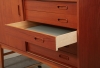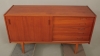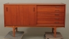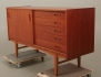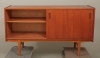1900-talets mitt, teak, 5 utdragslådor, samt en skjutdörr med bakomliggande hyllförvaring, 136 x 45 cm, höjd 77 cm, smärre bruksslitage, men mindre fanerskada.
