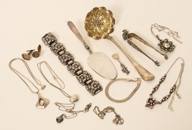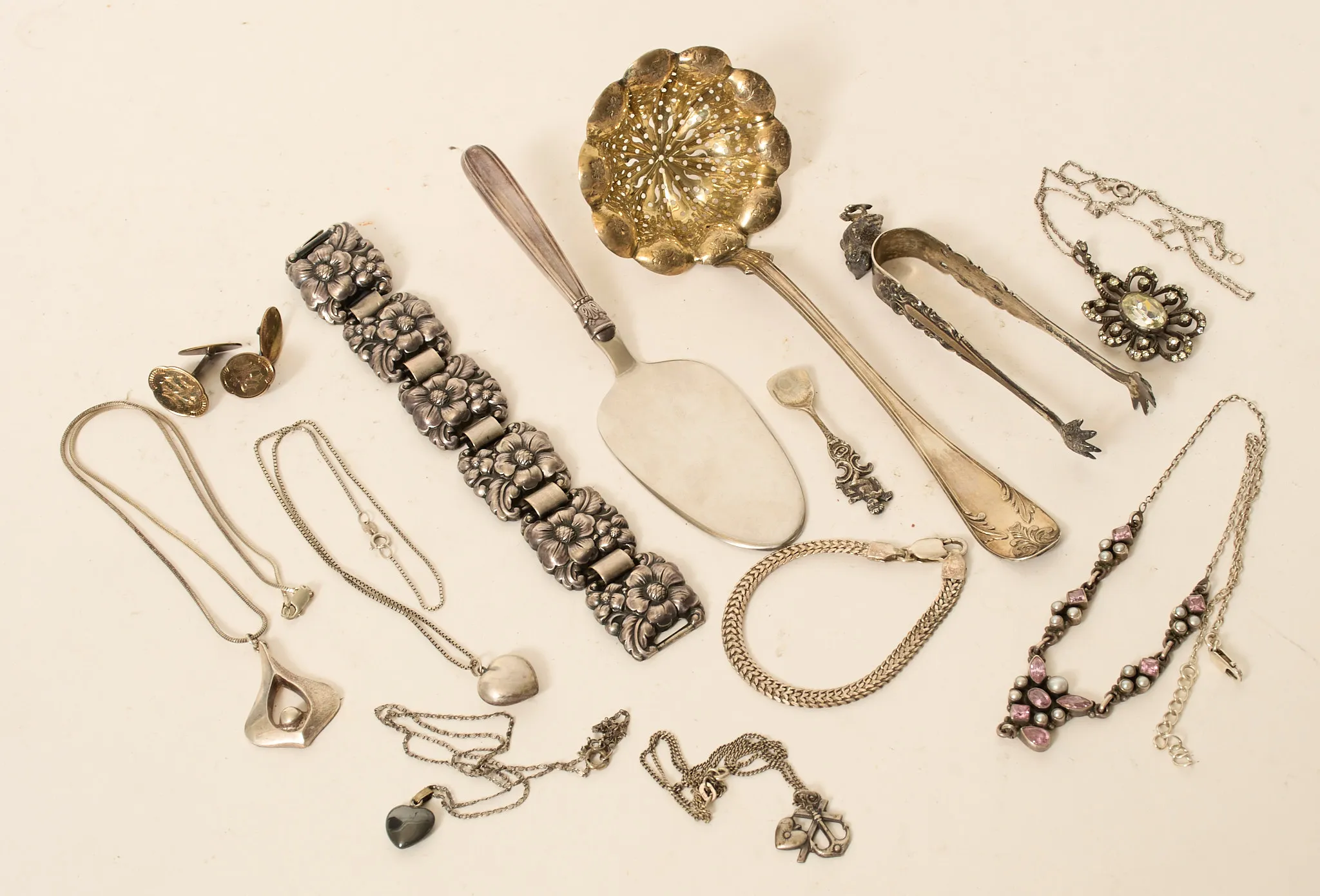 Smycken m.m., bl.a. halsband, armband, manschettknappar etc, tot.vikt (inkl stenar och blad i rostfritt stål) 228 gram.