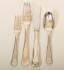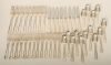 14 skedar längd 16 cm, 8 gafflar längd 19 cm, 8 knivar längd 20 cm, samt 13 dessertgafflar, längd 15 cm. Tot.vikt 1973 gram, varav knivar med blad i rostfritt stål 536 gram.