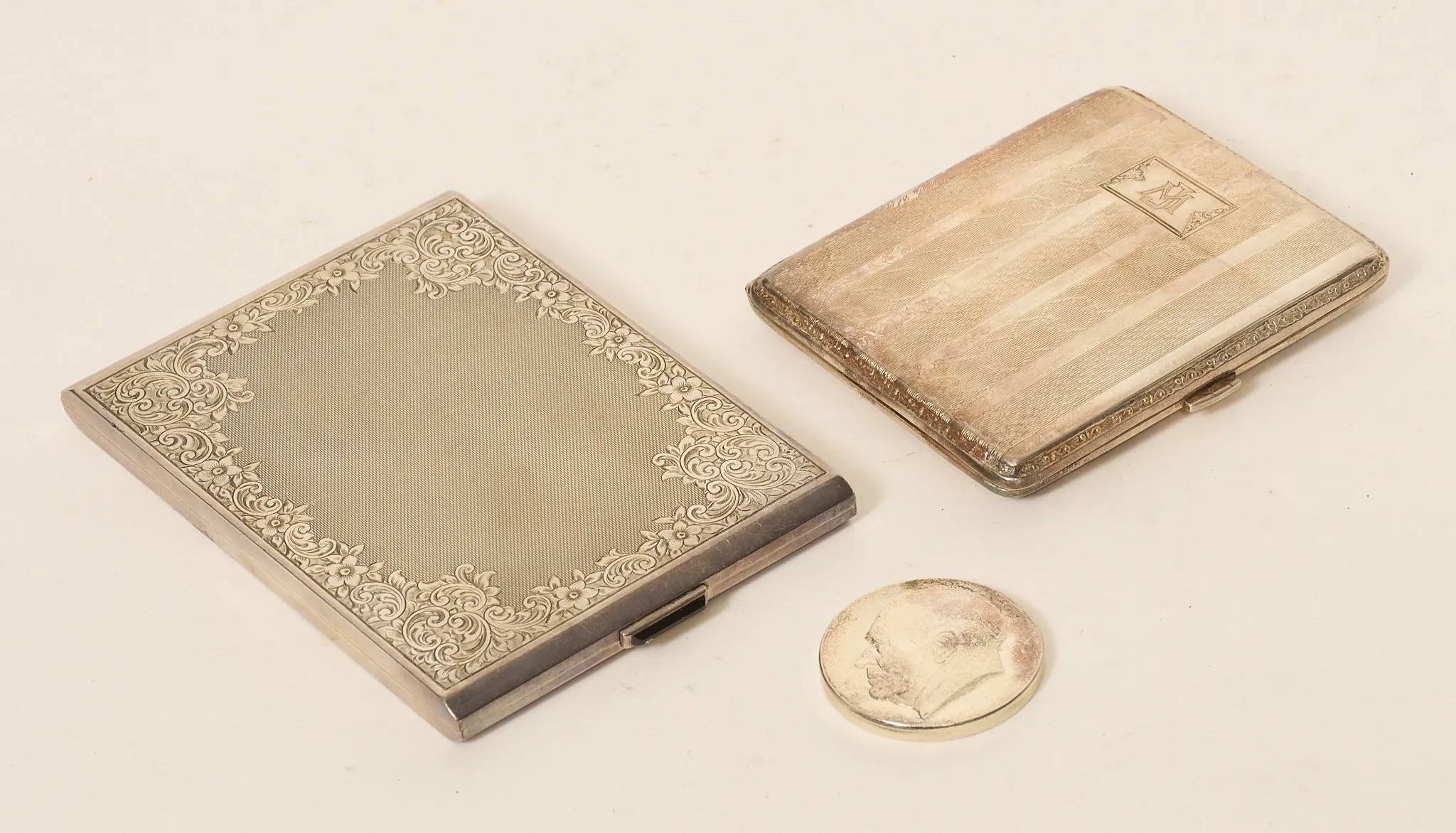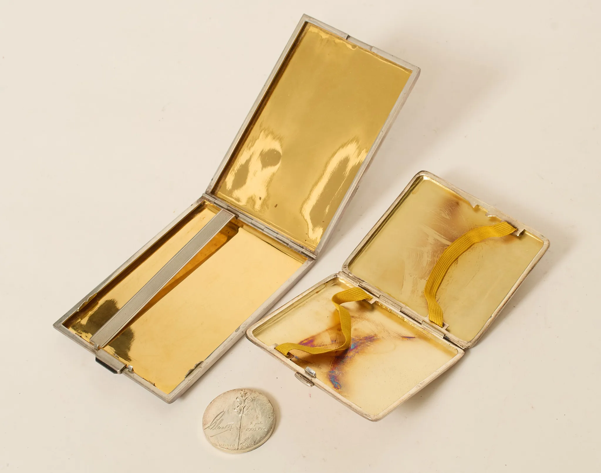 2 st cigarettetuier samt mynt, vikt 285 gram