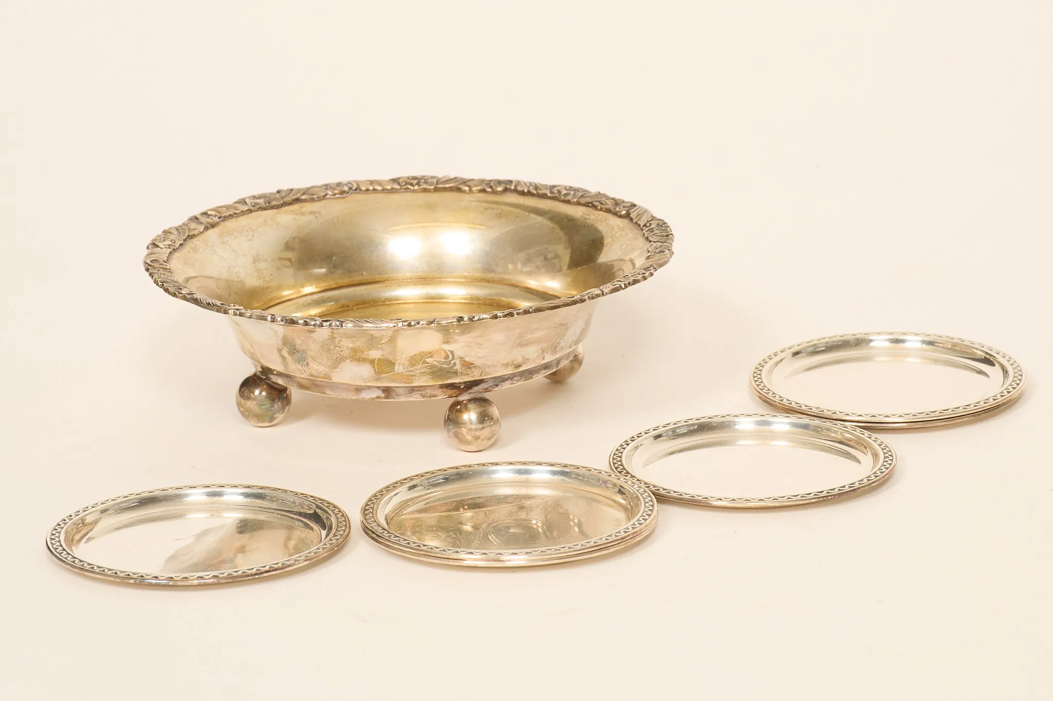 Skål med kulfötter, diam 15 cm, samt 6 coasters, GAB, vikt 258 gram.