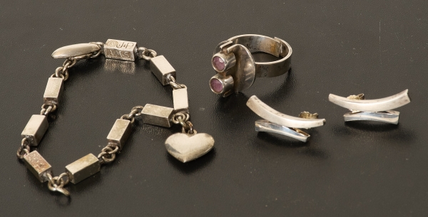 Ring med rosenqvarts troligtvis Elis Kauppi. Armband med stavlänk, Arvo Saarela, samt örhängen ett par, totalvikt 42 g.