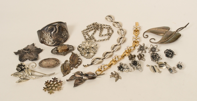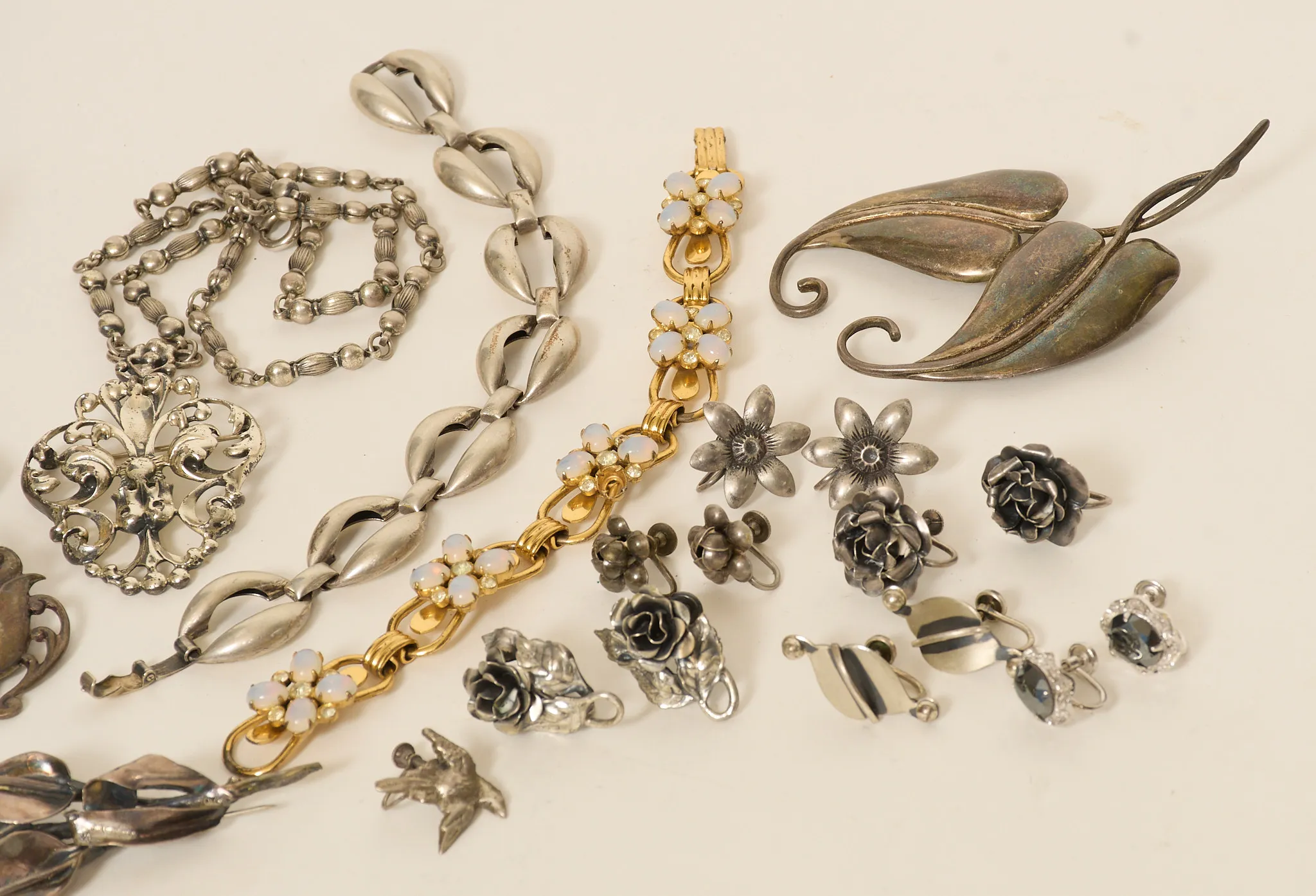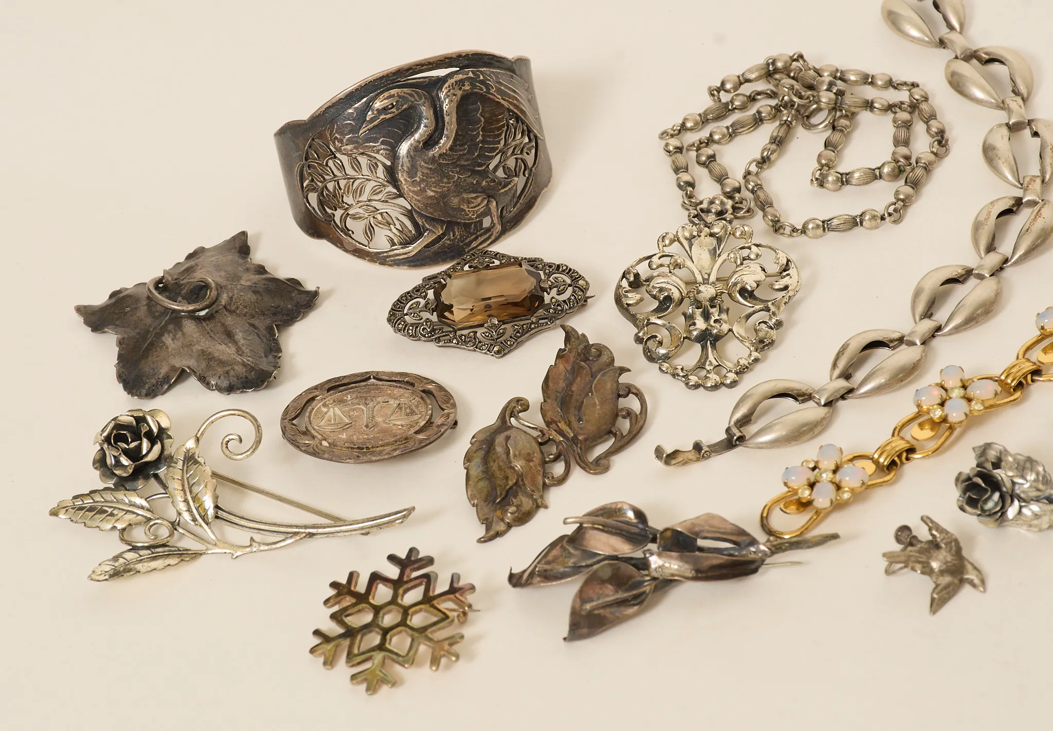Broscher, örhängen, armband m.m. Flertalet äldre smycken i sterling silver, bruksslitage, defekter förekommer.