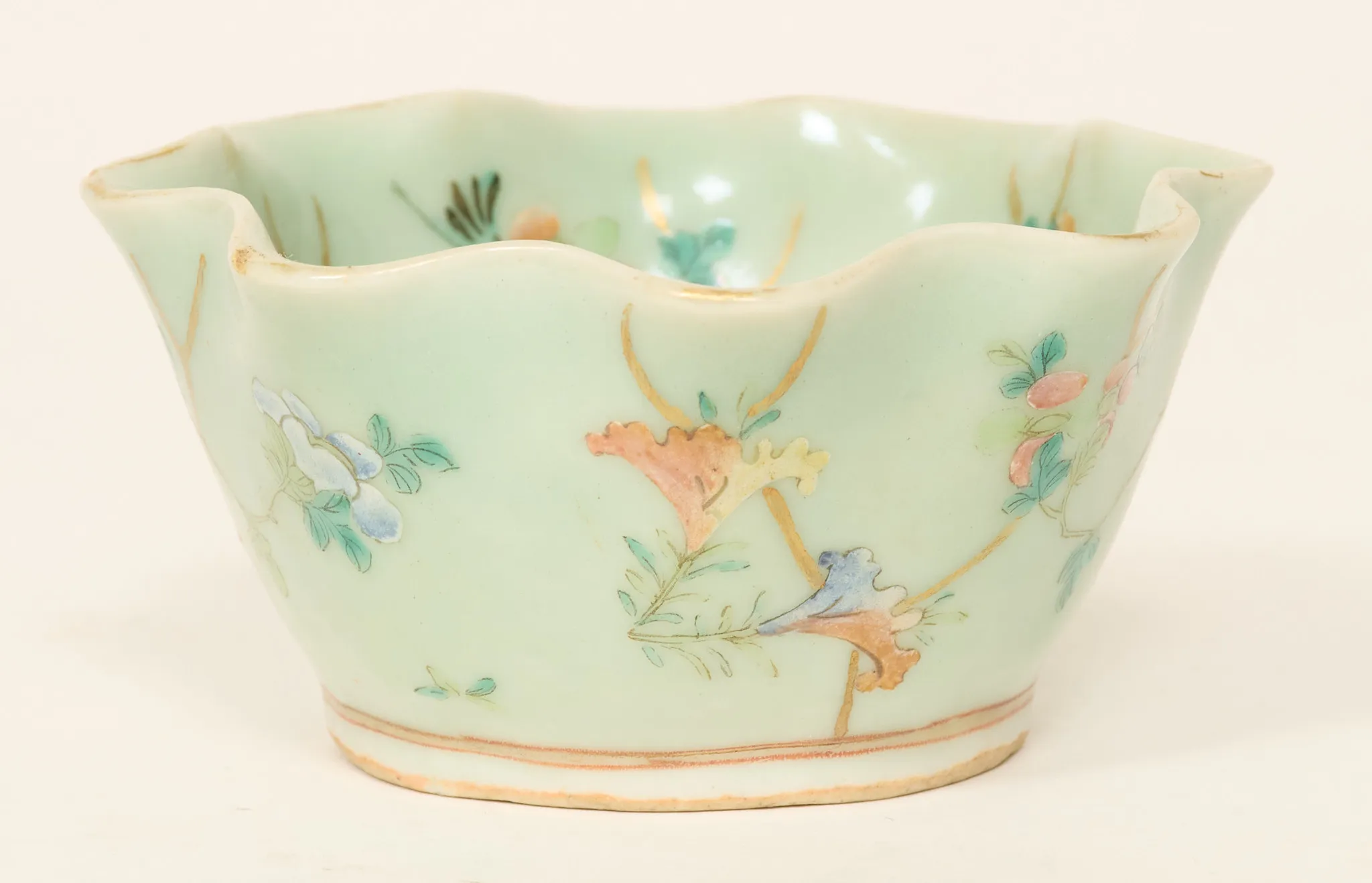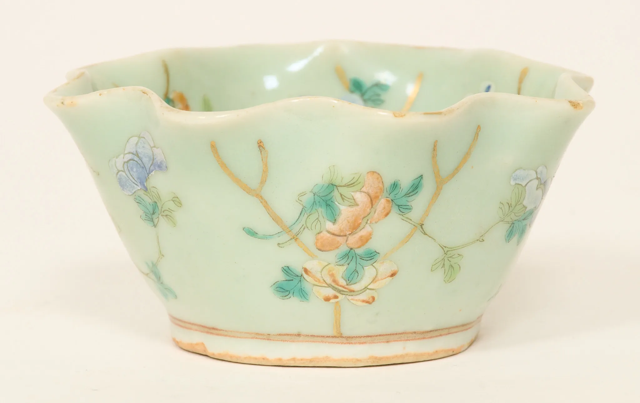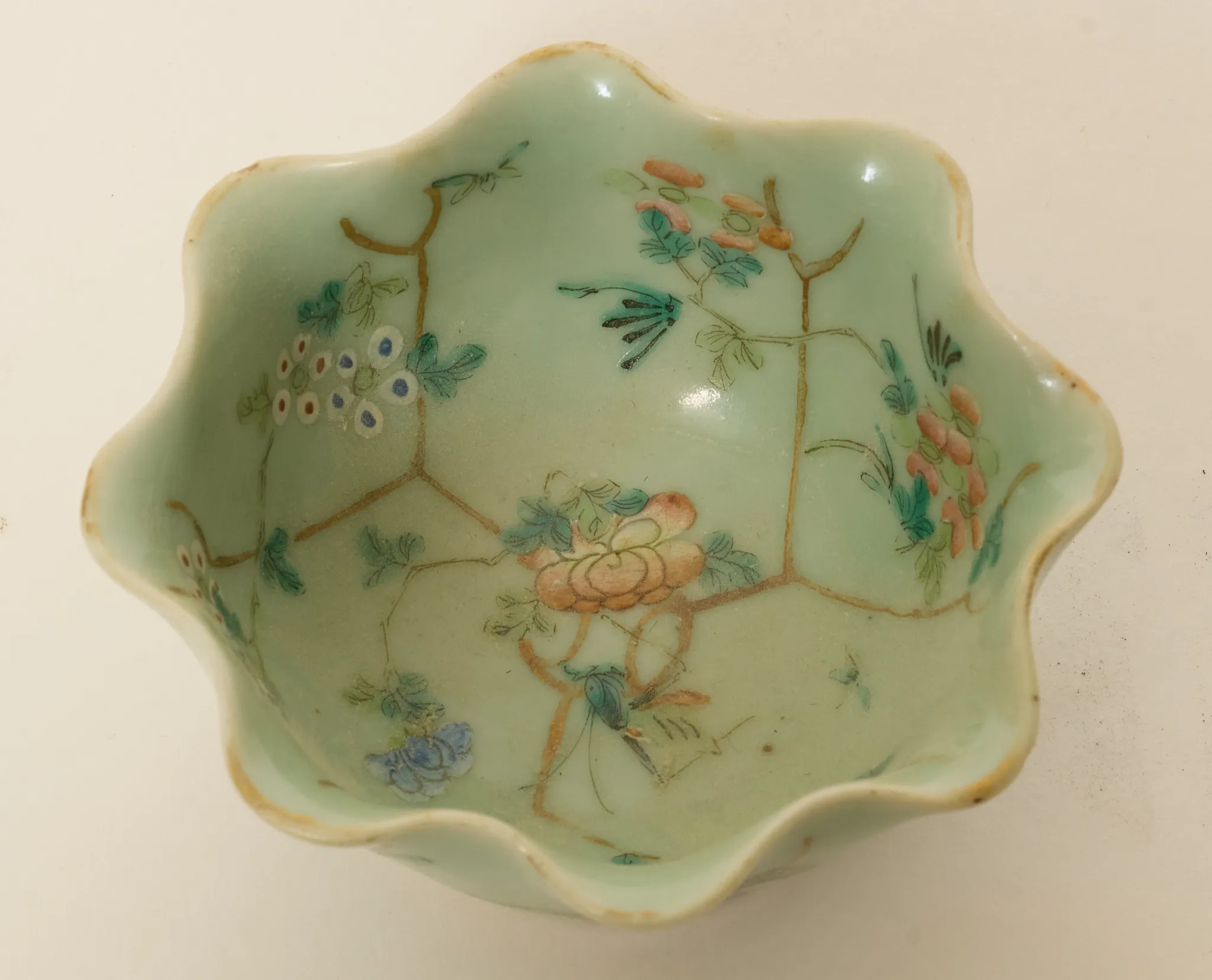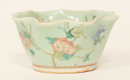 Celadonglasyr, dekor i emaljfärger, diam. 10,5 cm, nagg