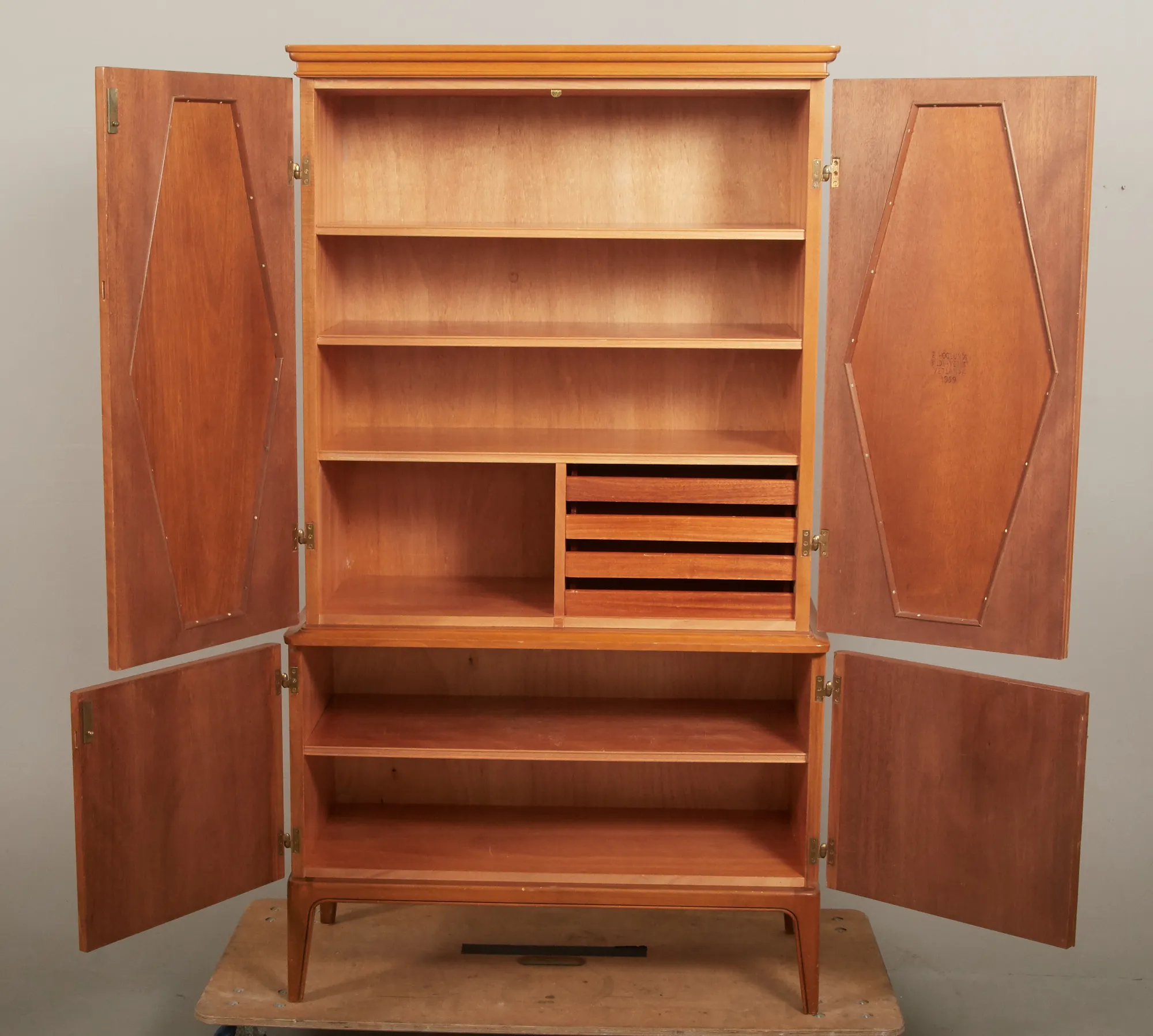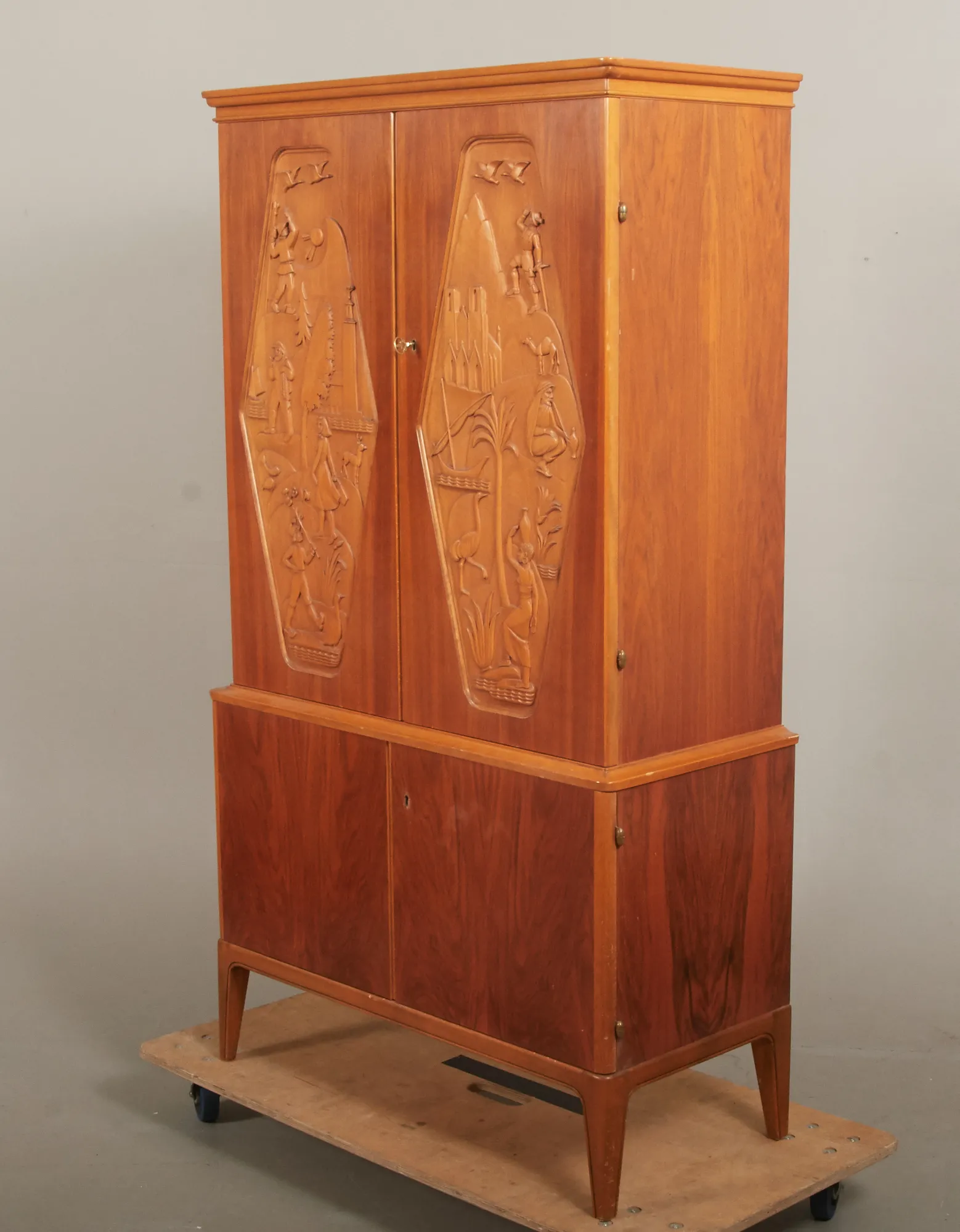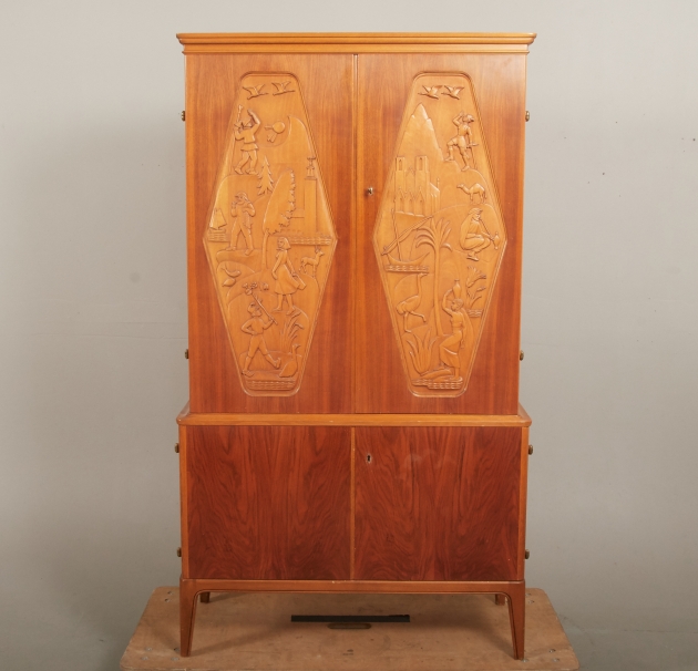 Signerat Erik Höglunds Bildh - Verkst Vetlanda 1959, 2-delat, 2 dörrpar med bakomliggande förvaring, översta dörrpar med dekor i relief, 91 x 40,5, höjd 160 cm, smärre bruksslitage.
