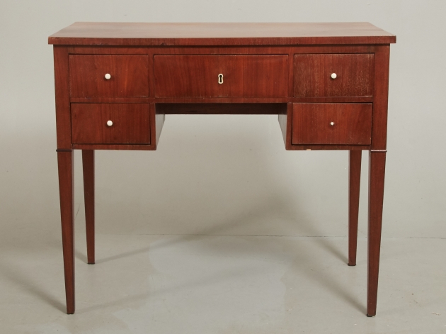 Mahogny, 5 utdragslådor, 89 x 49 cm, höjd 76 cm, en knopp defekt. Nyckel finns.
