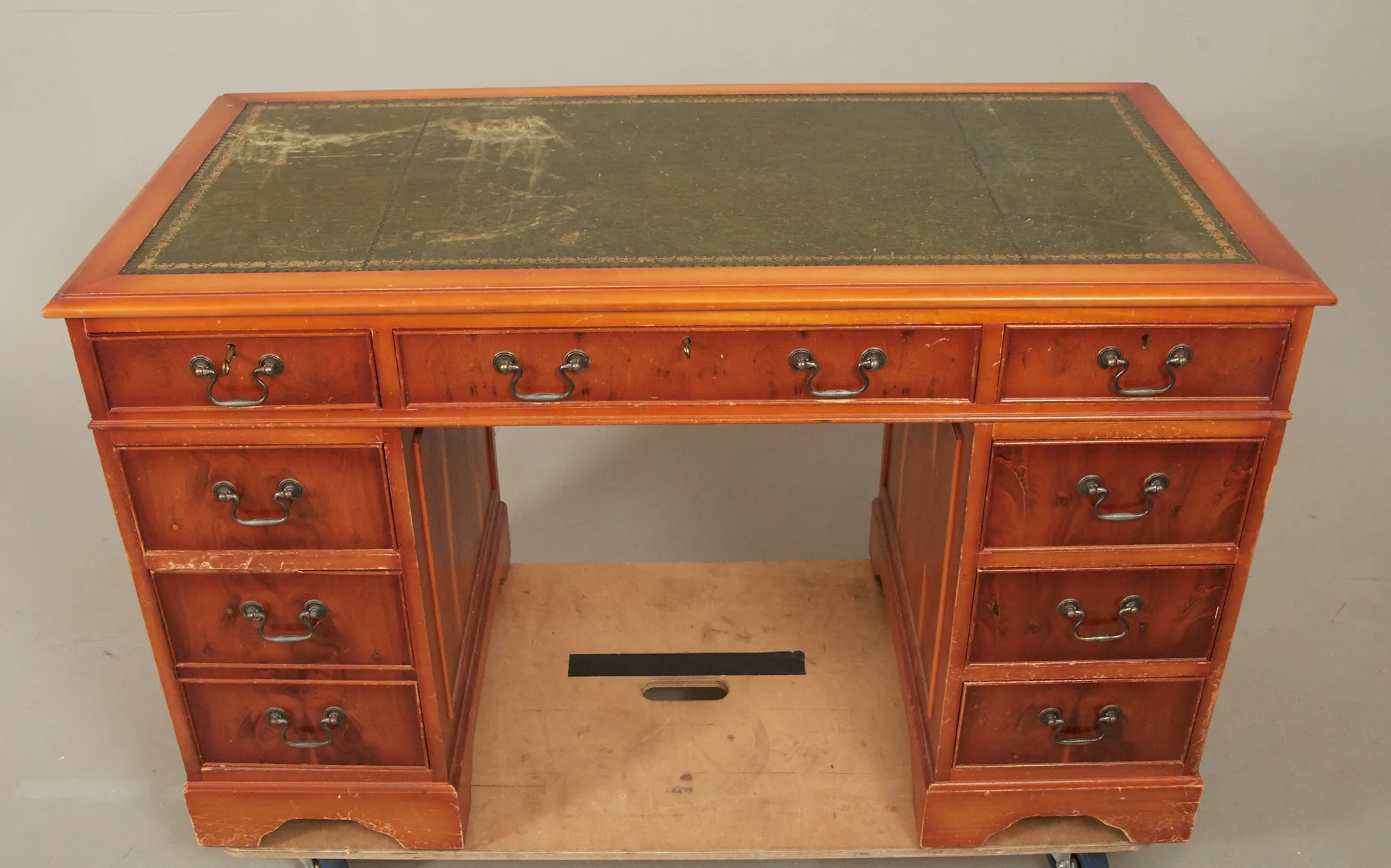 Idegran, delvis läderklädd skiva, 9 utdragslådor, 125 x 62 cm, höjd ca 77 cm, bruksslitage, märken och repor.