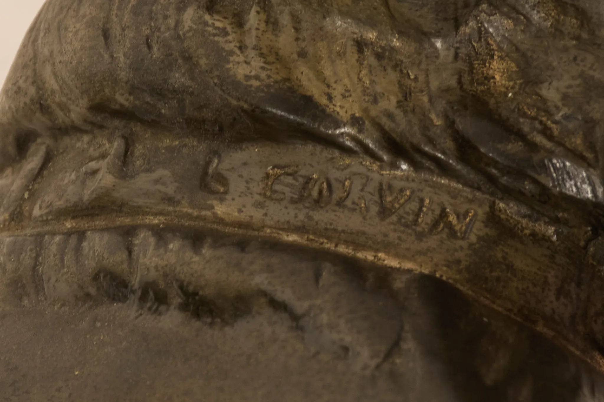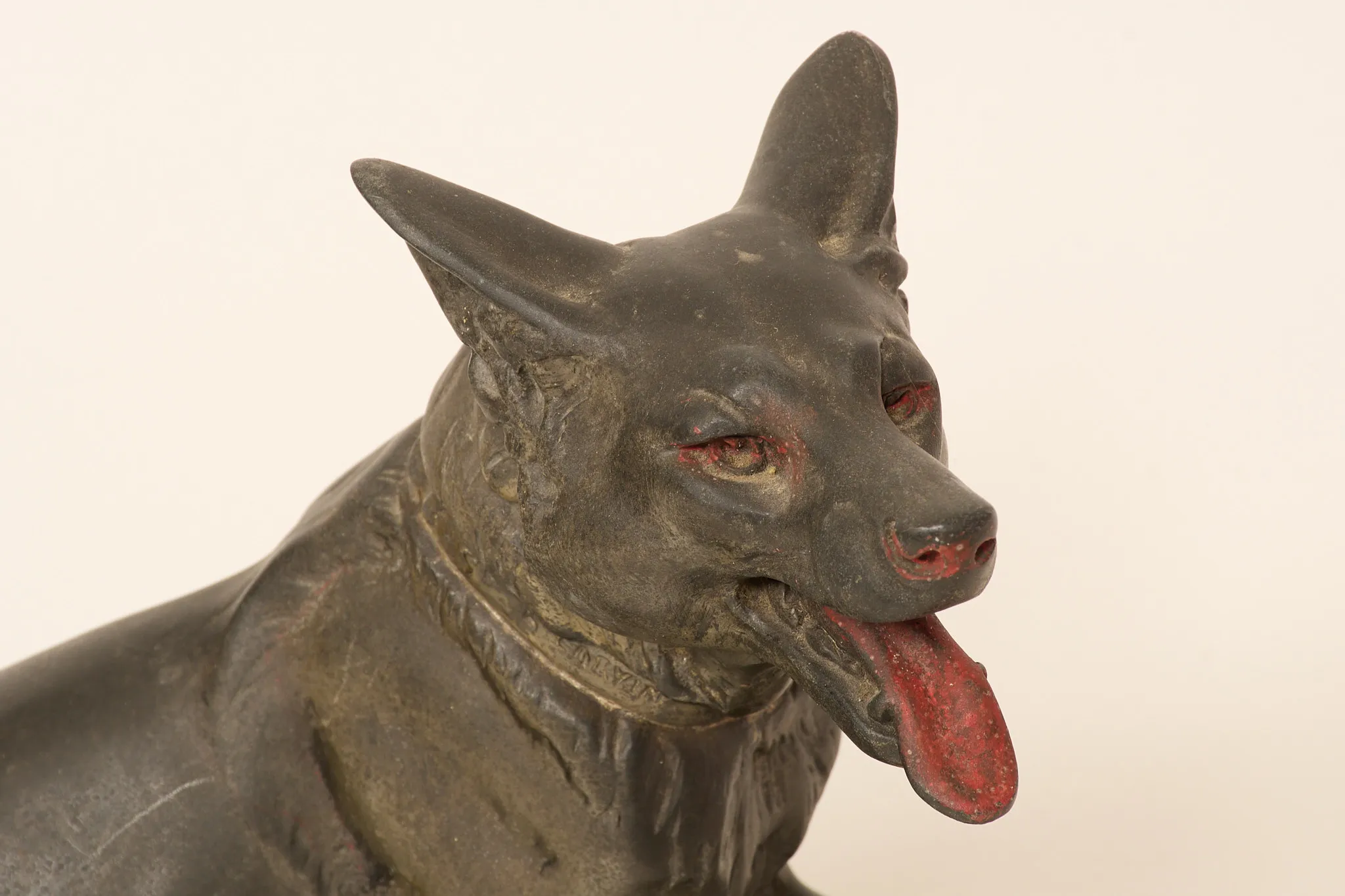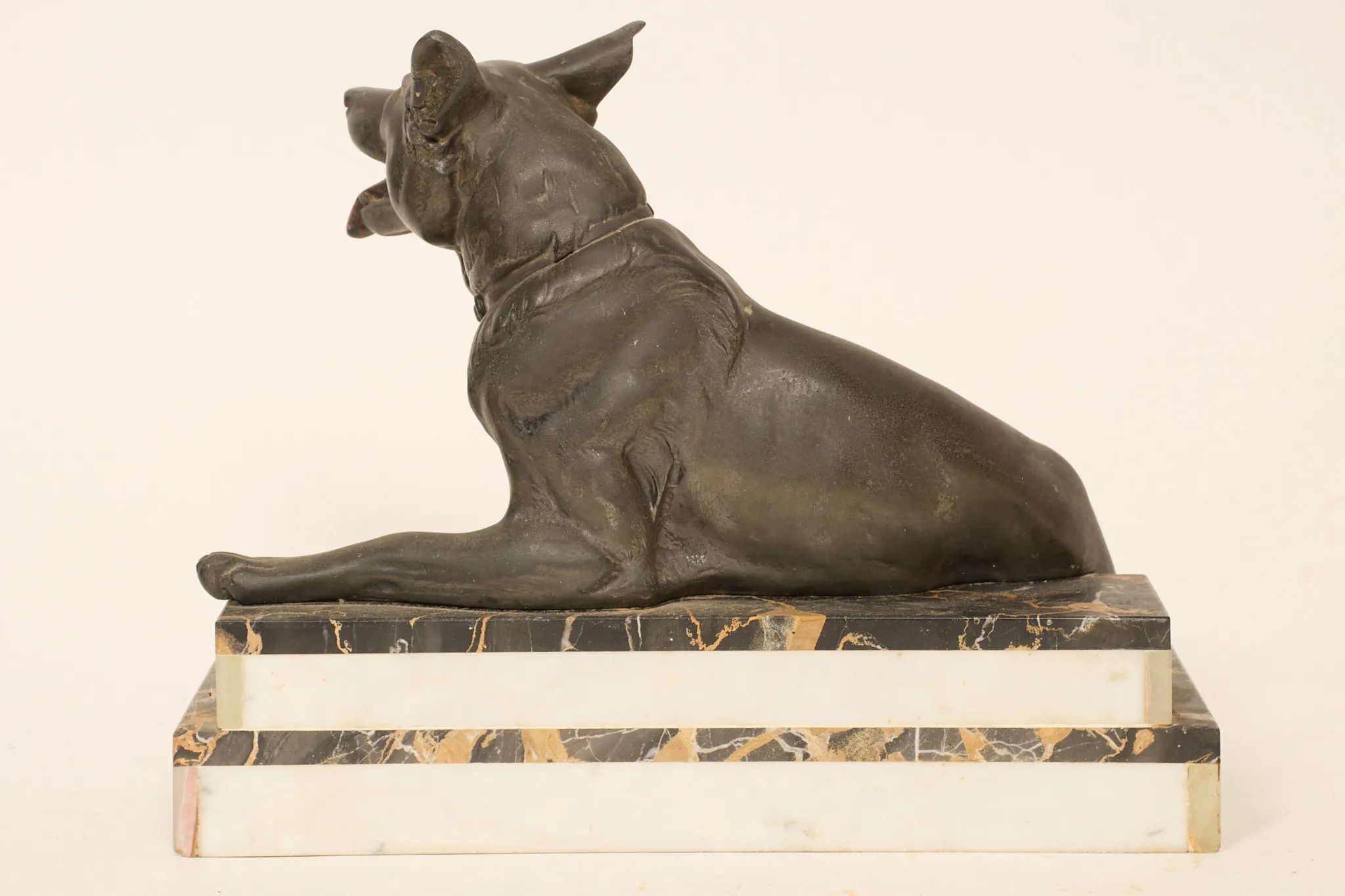 Metall i form av en hund på sten/onyx sockel . Signerad L Carvin. 35 x 14 cm, höjd 28 cm. Bruksslitage.