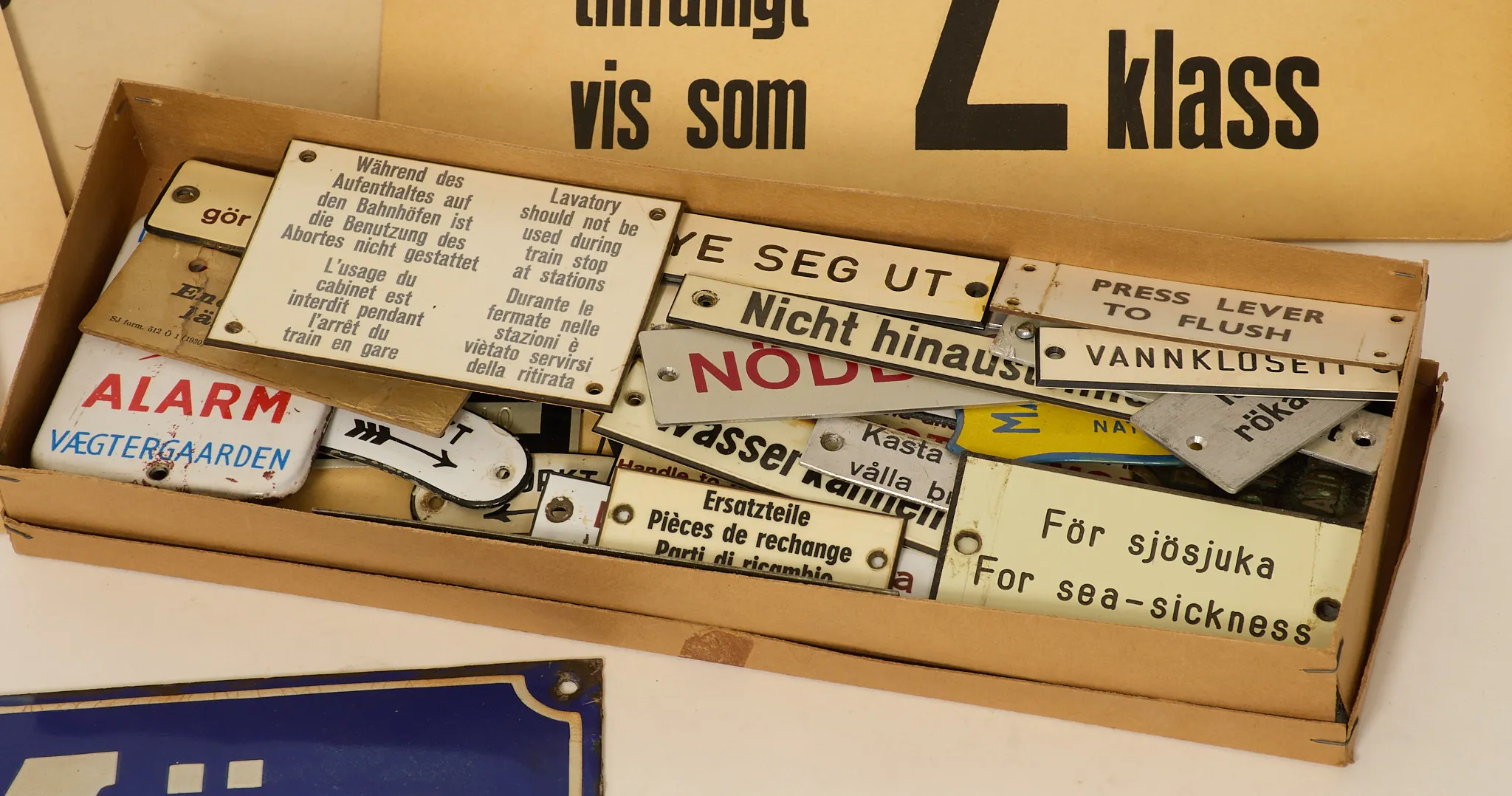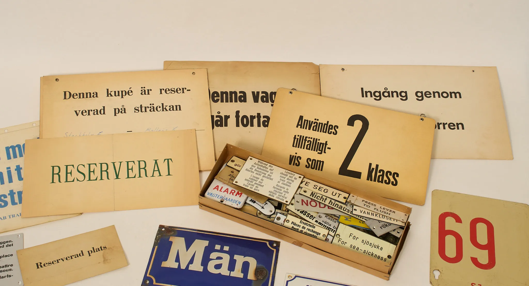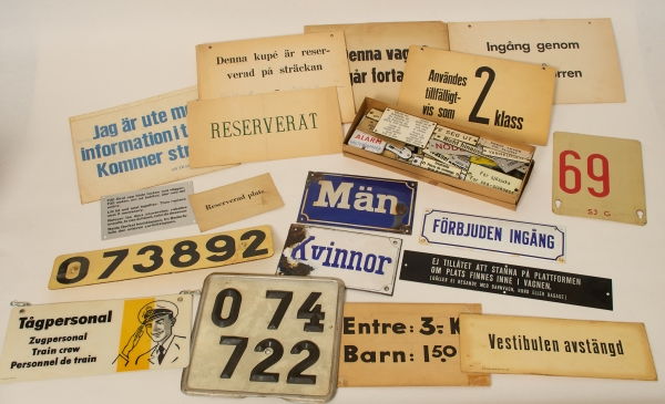 Diverse skyltar, emalj, plast och papp. Mycket relaterat till järnväg. Slitage samt skador. Bör ses.