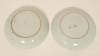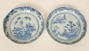 2 st, dekor i underglasyrblått, med trädgårdslandskap och flodmotiv, diam ca 25 cm, sprickor, en med zinkad lagning.