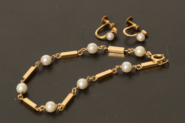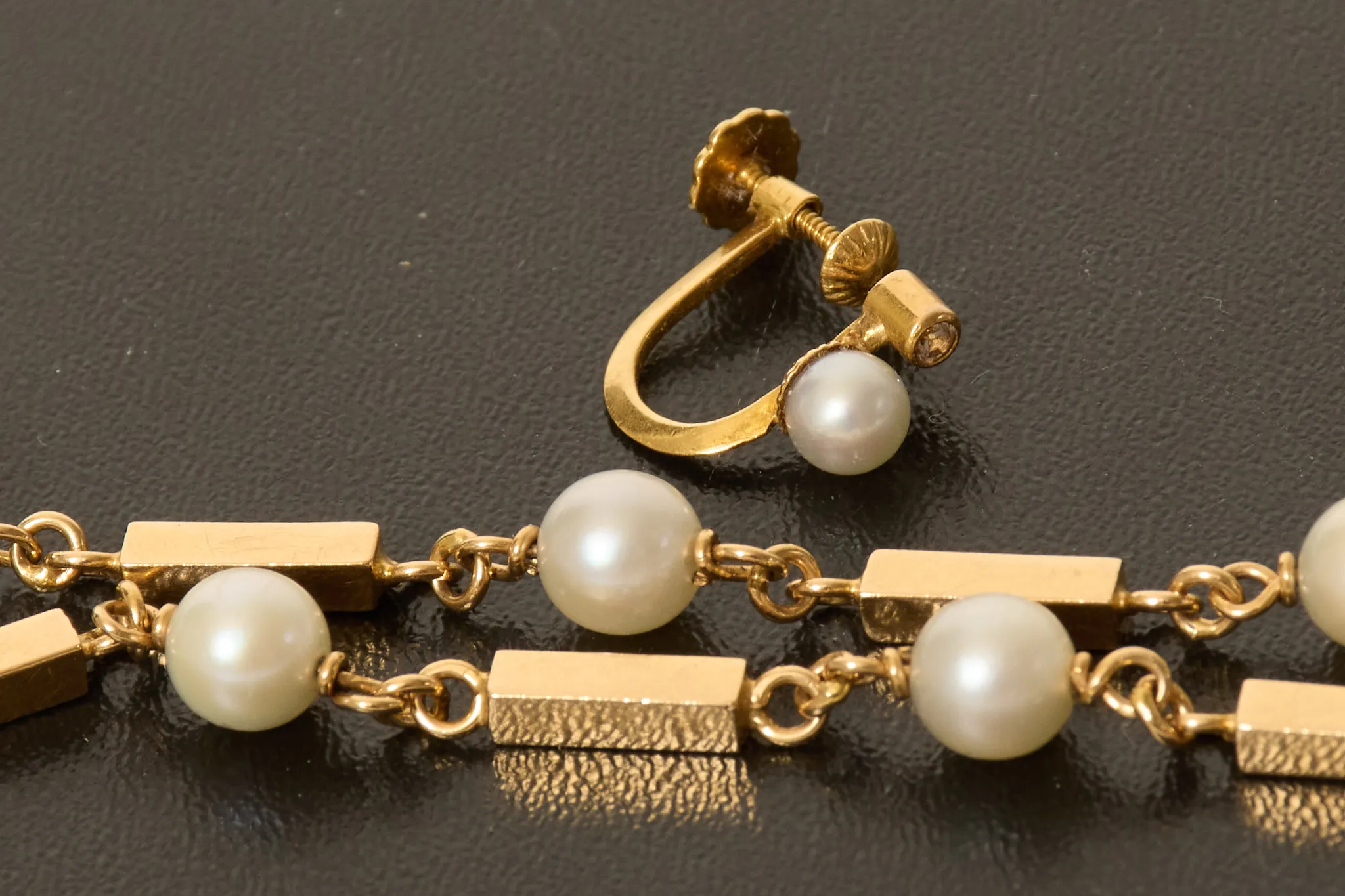18-k guld med odlade pärlor, längd 20 cm, samt örhängen med skruvfäste, tot. vikt 11,8 gram