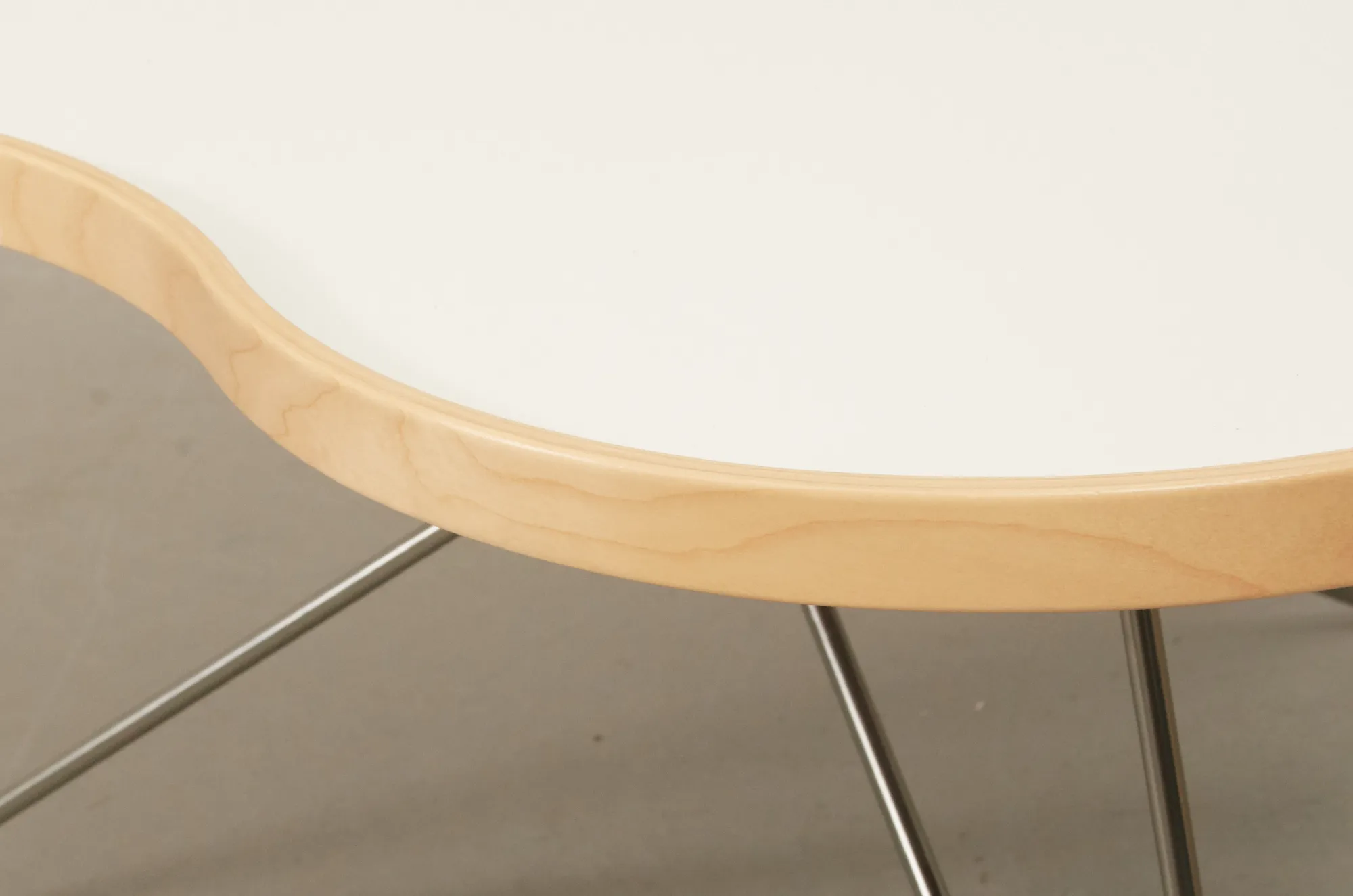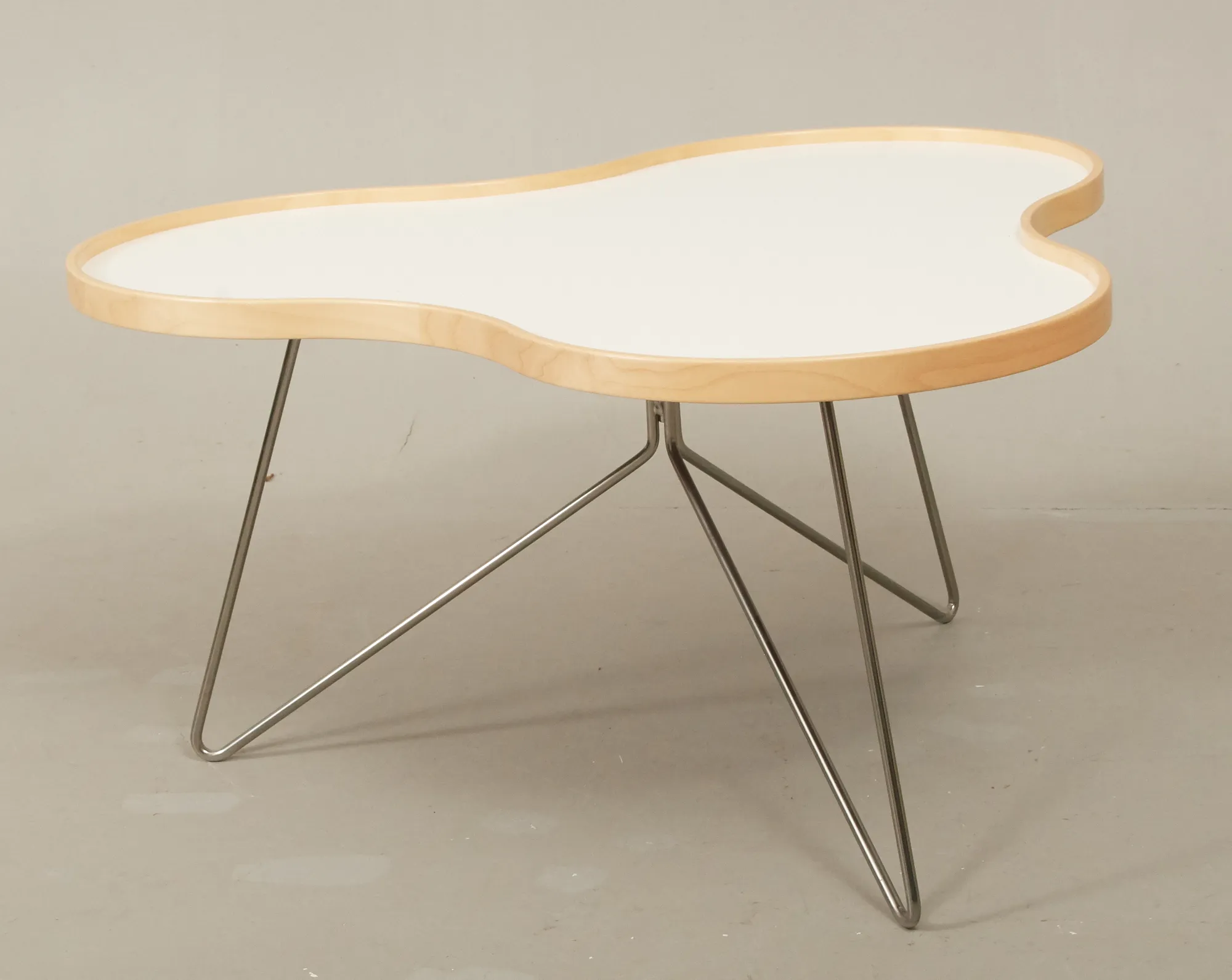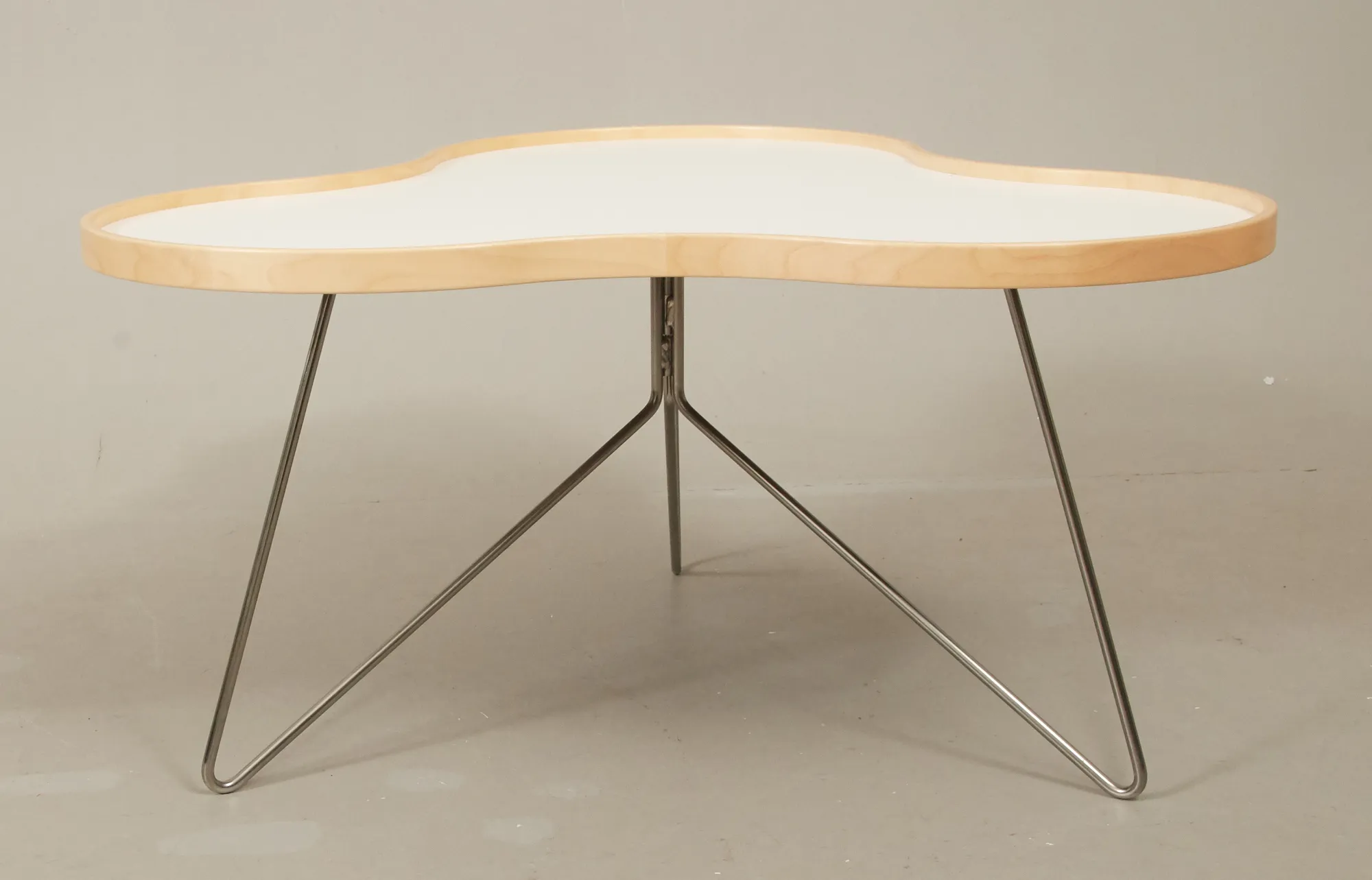 Skiva i vit laminat, med kant i formpressat trä, kromad benställning, 85 x 90, höjd 45 cm, gott skick