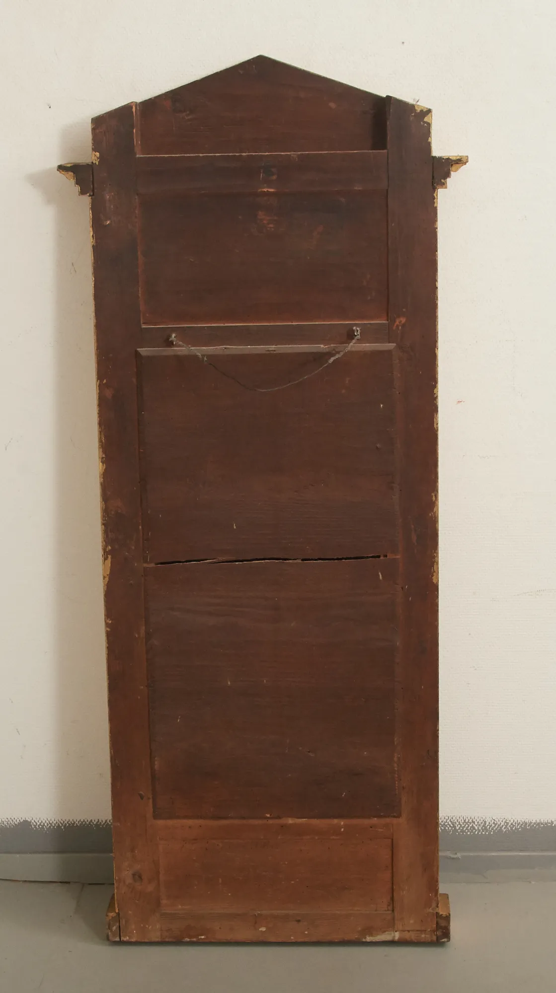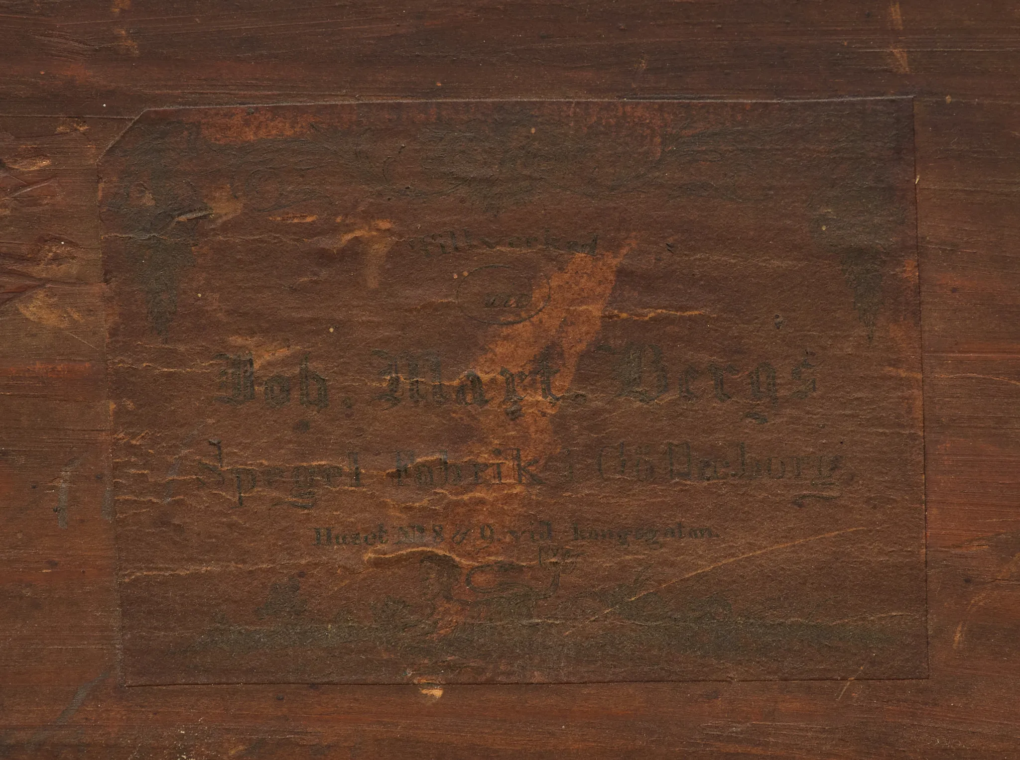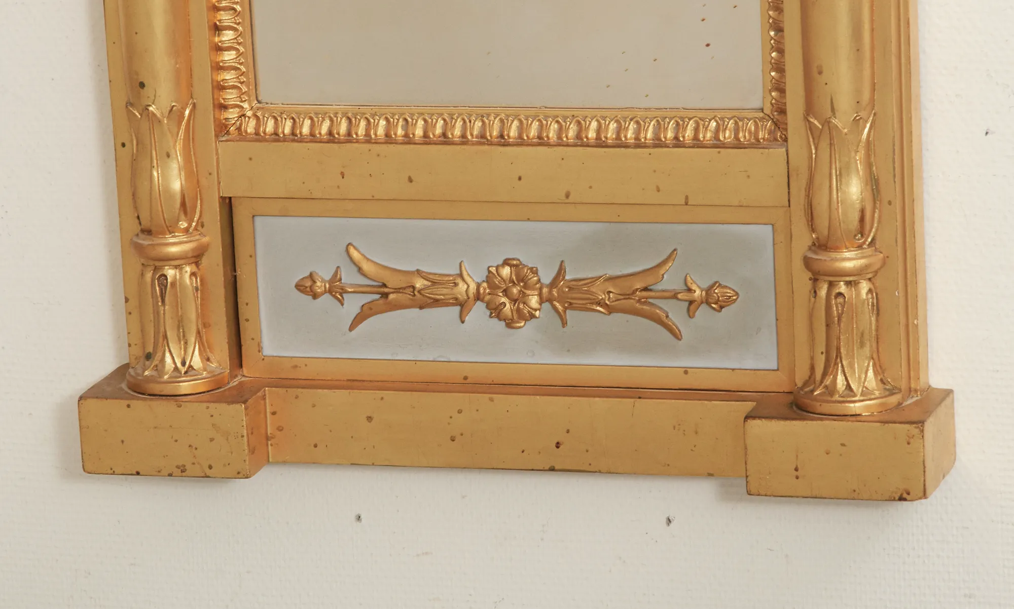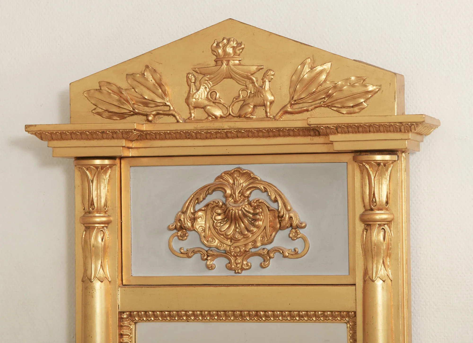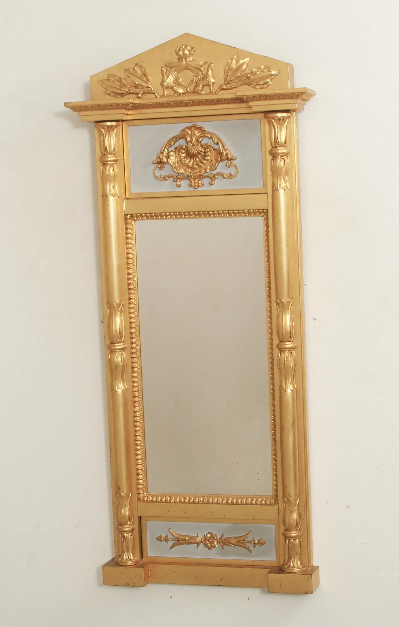 Märkt Johan Martin Berg, Spegelfabrik Göteborg. Delvis träskuren dekor, förgylld samt bemålad. 143 x 63 cm