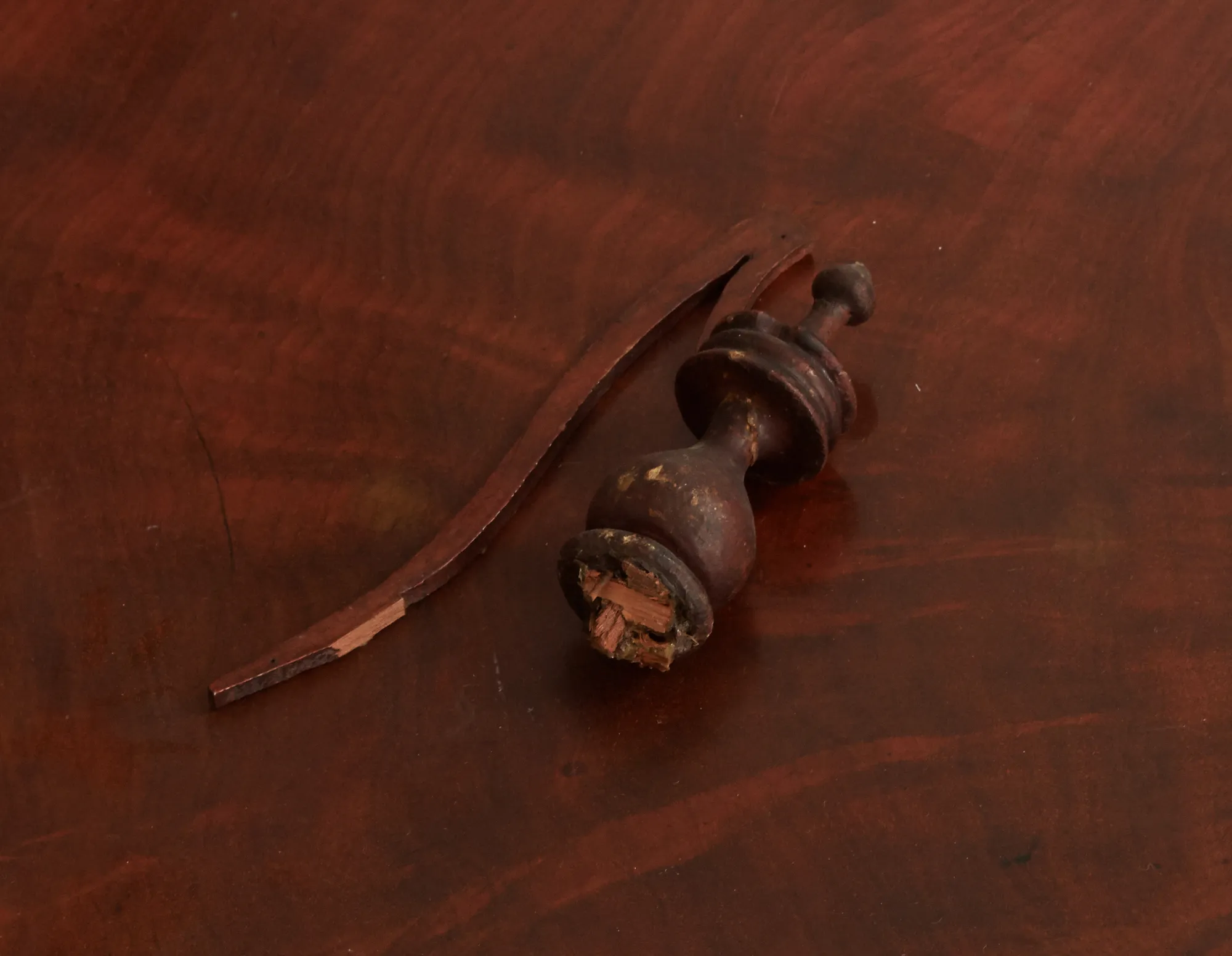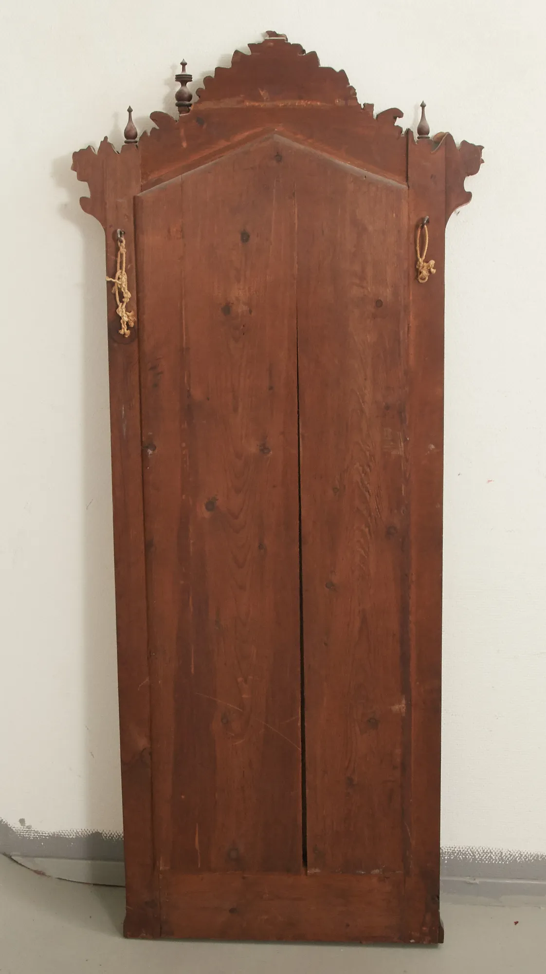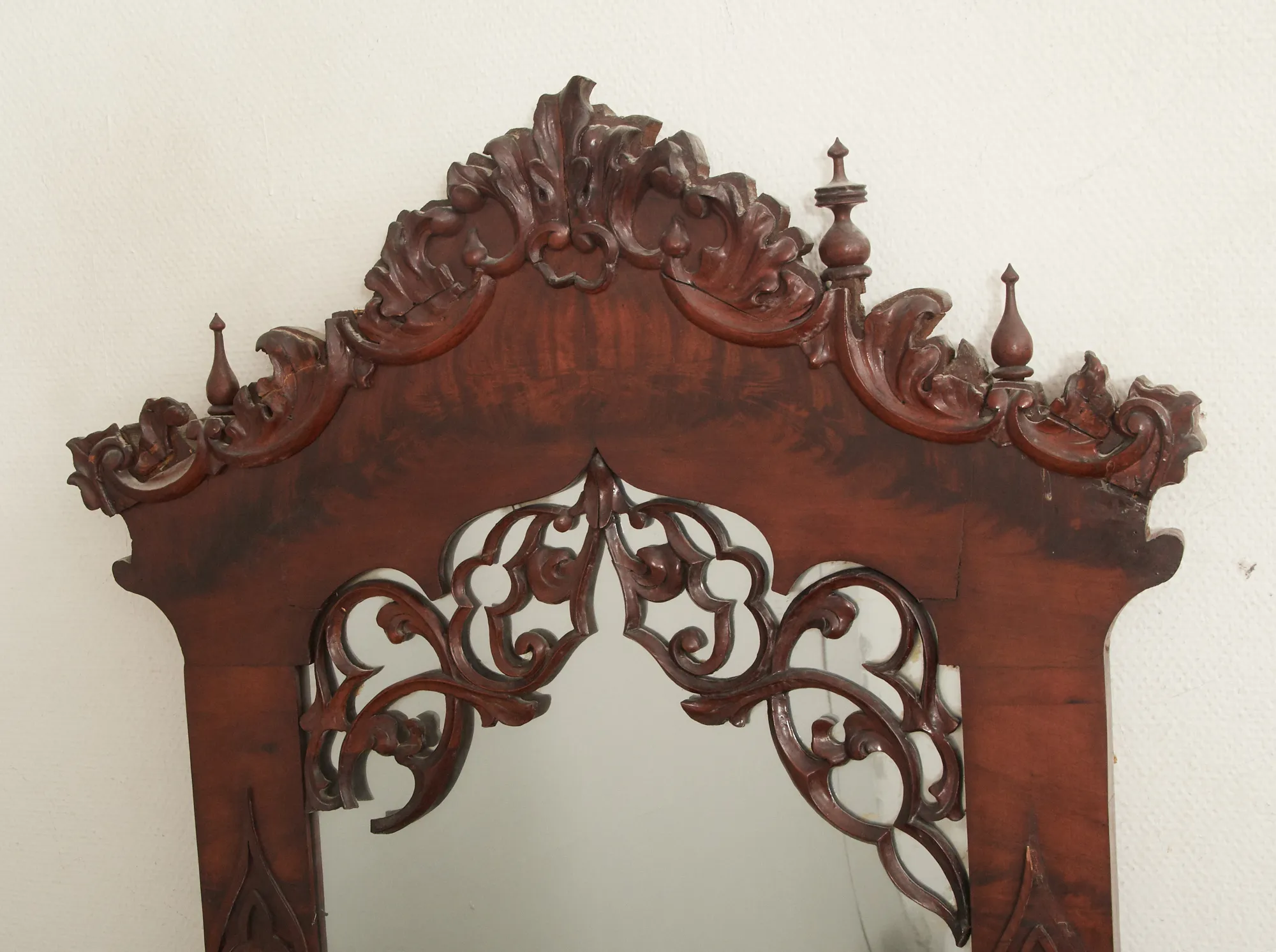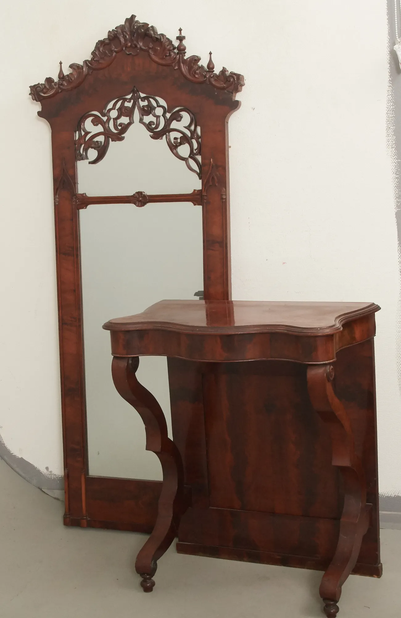 Valnöt, spegel med skador, lösa dekorelement medföljer, mått spegel, 165 x 71 cm, mått bord 69 x 42 cm, höjd 81 cm, bruksslitage.