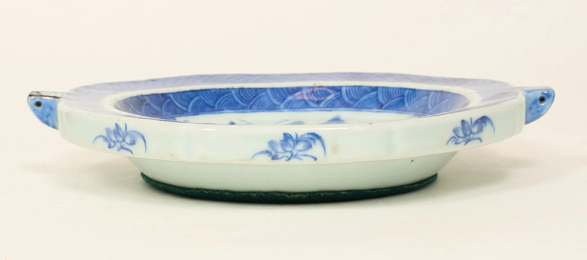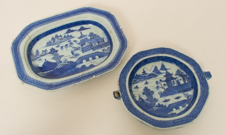 Dekor i underglasyrblått, längd 23 - 32 cm, stekfat med zinklagning, värmefat med spricka.