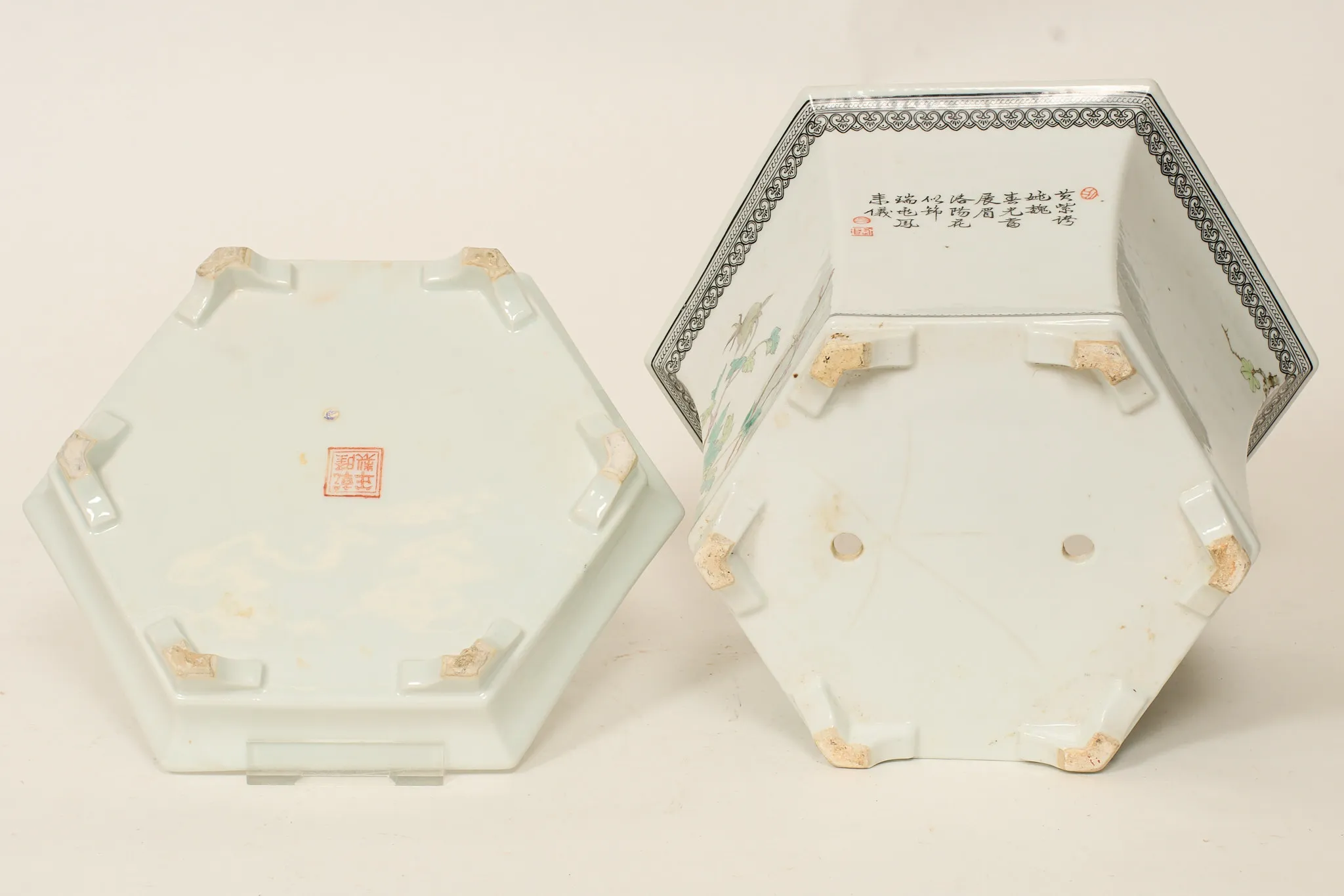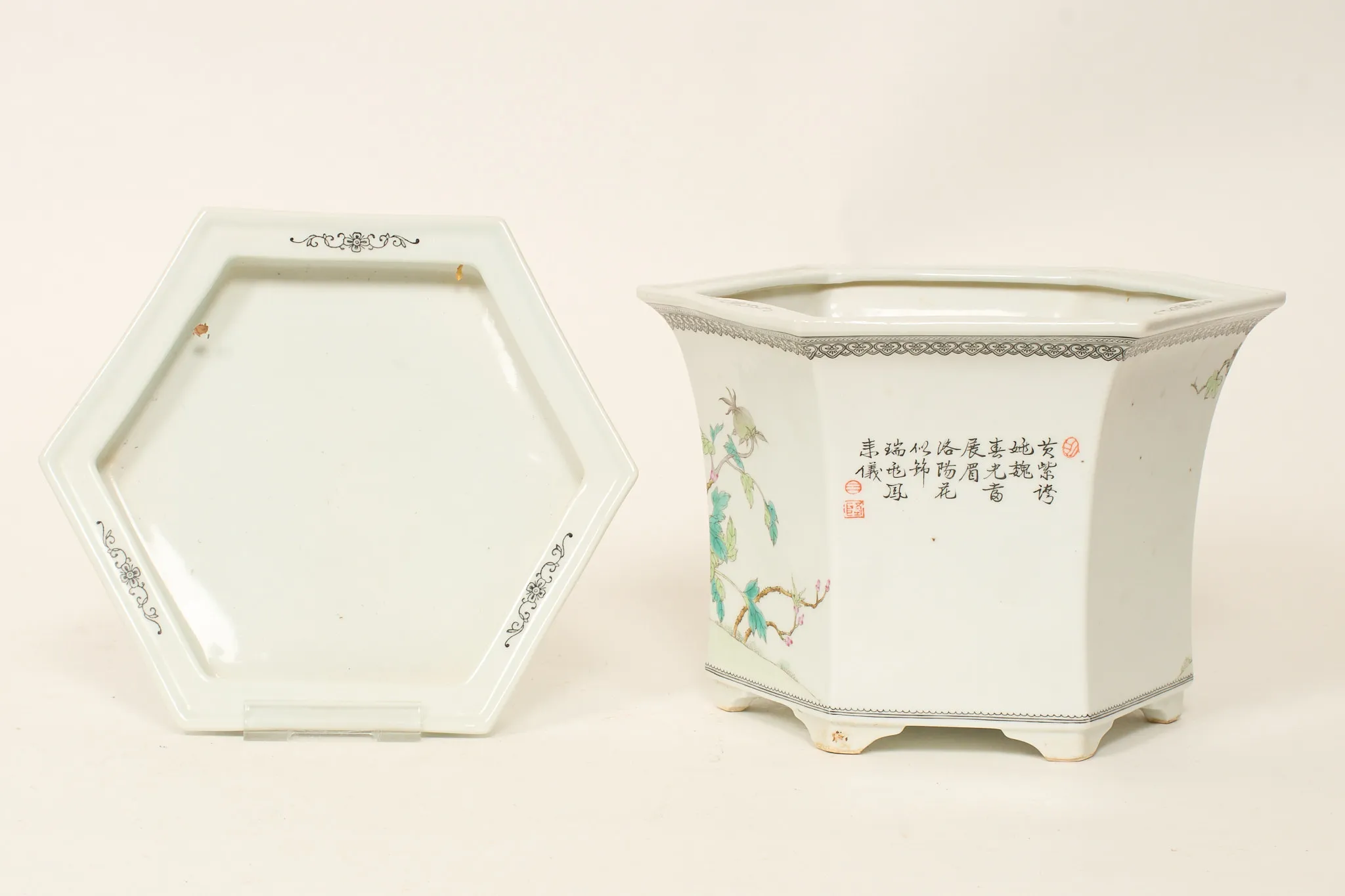 1900-talets andra hälft, med underfat, hexagonal form, polykrom dekor med bl.a. fenixfågel, höjd inkl fat 22 cm, smärre bruksslitage, men stjärnspricka i botten på ytterfoder.